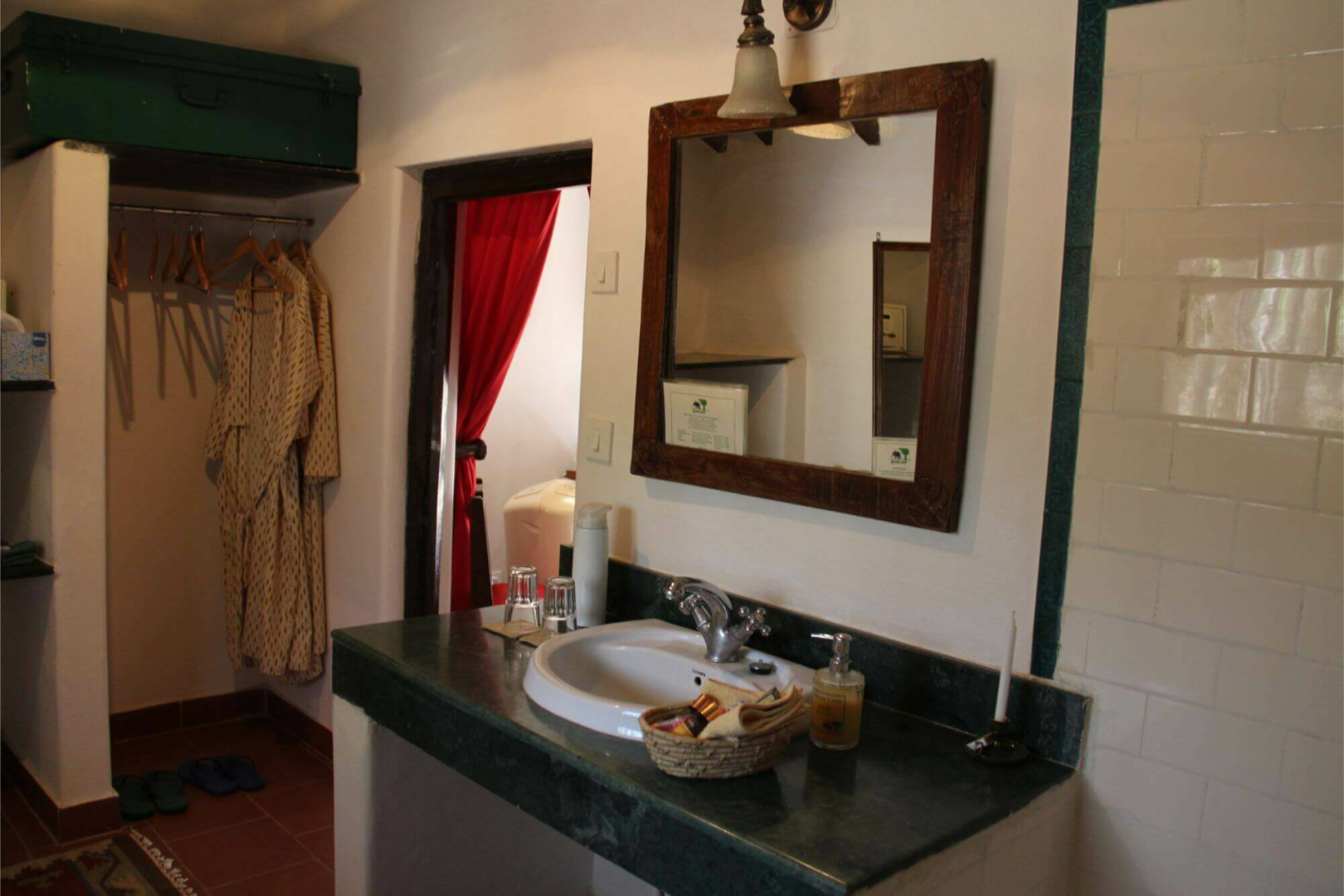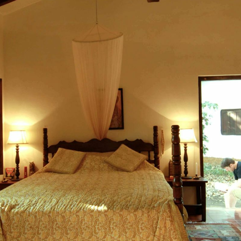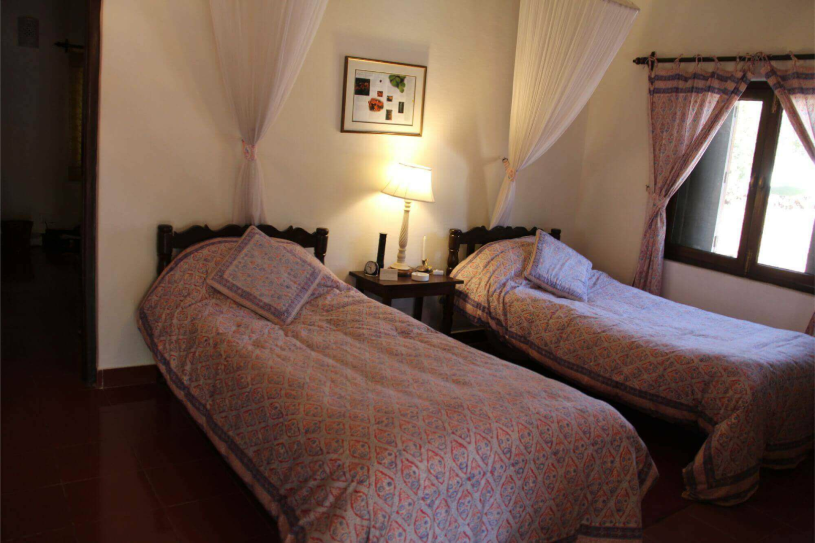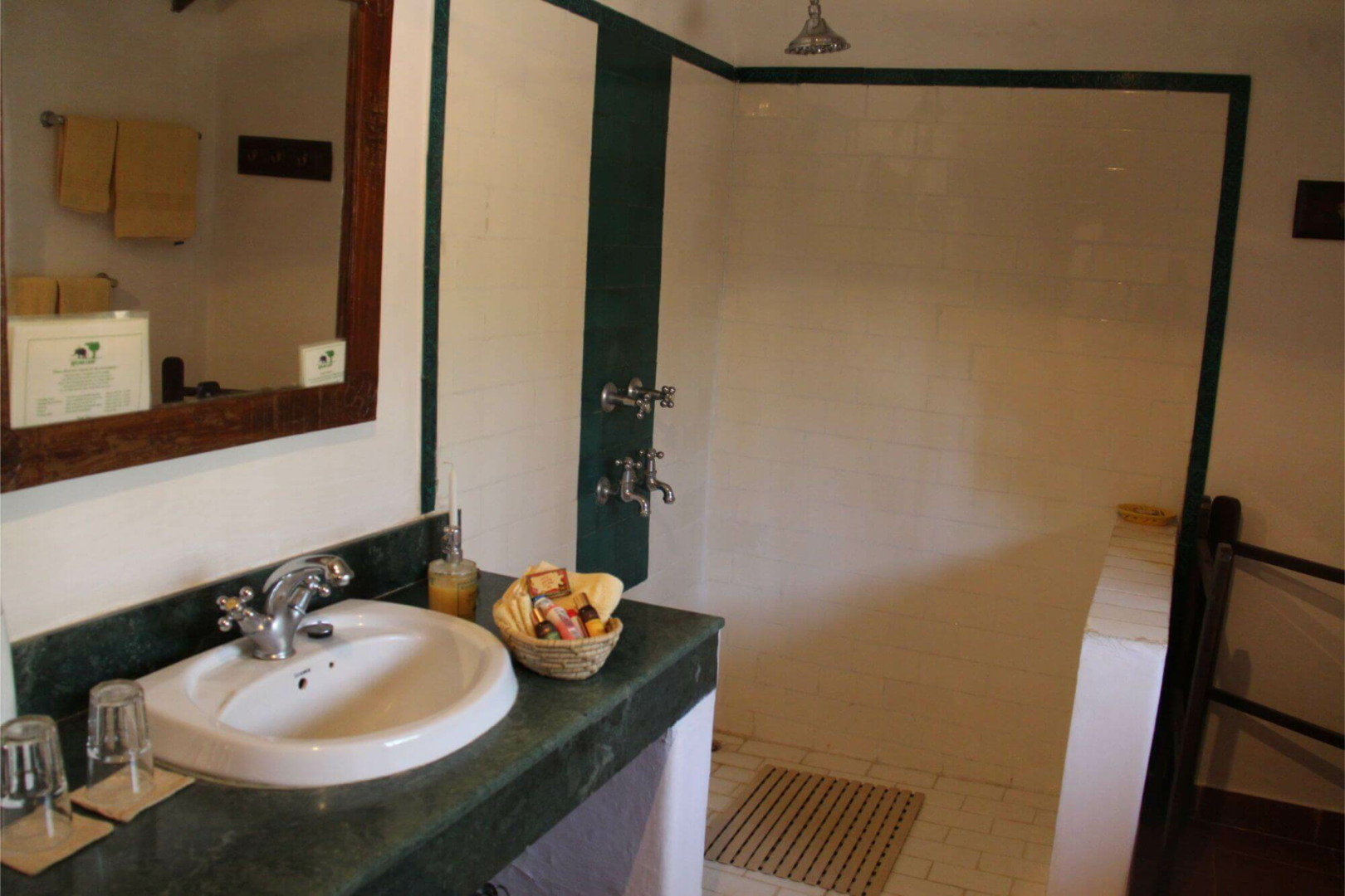 Sonst besteht das Camp aus einem simplen, großen und offenen weißen Haus, wo Lounge und Esstisch eingerichtet sind, sowie aus zwölf Cottages, die jeweils zwei Zimmer unterbringen. Die Zimmer sind nicht super spektakulär, dafür aber sehr farbenfroh und versprühen einen ländlichen gemütlichen Charakter, der sehr einladend ist. Jedes Zimmer hat natürlich seine eigene Sitzecke draußen. Vor einem der Bungalows liegt eine natürliche Wasserstelle, die nie austrocknet. Für die Tiere der Umgebung ist das ein Magnet zum Zeitpunkt der Hochsaison.