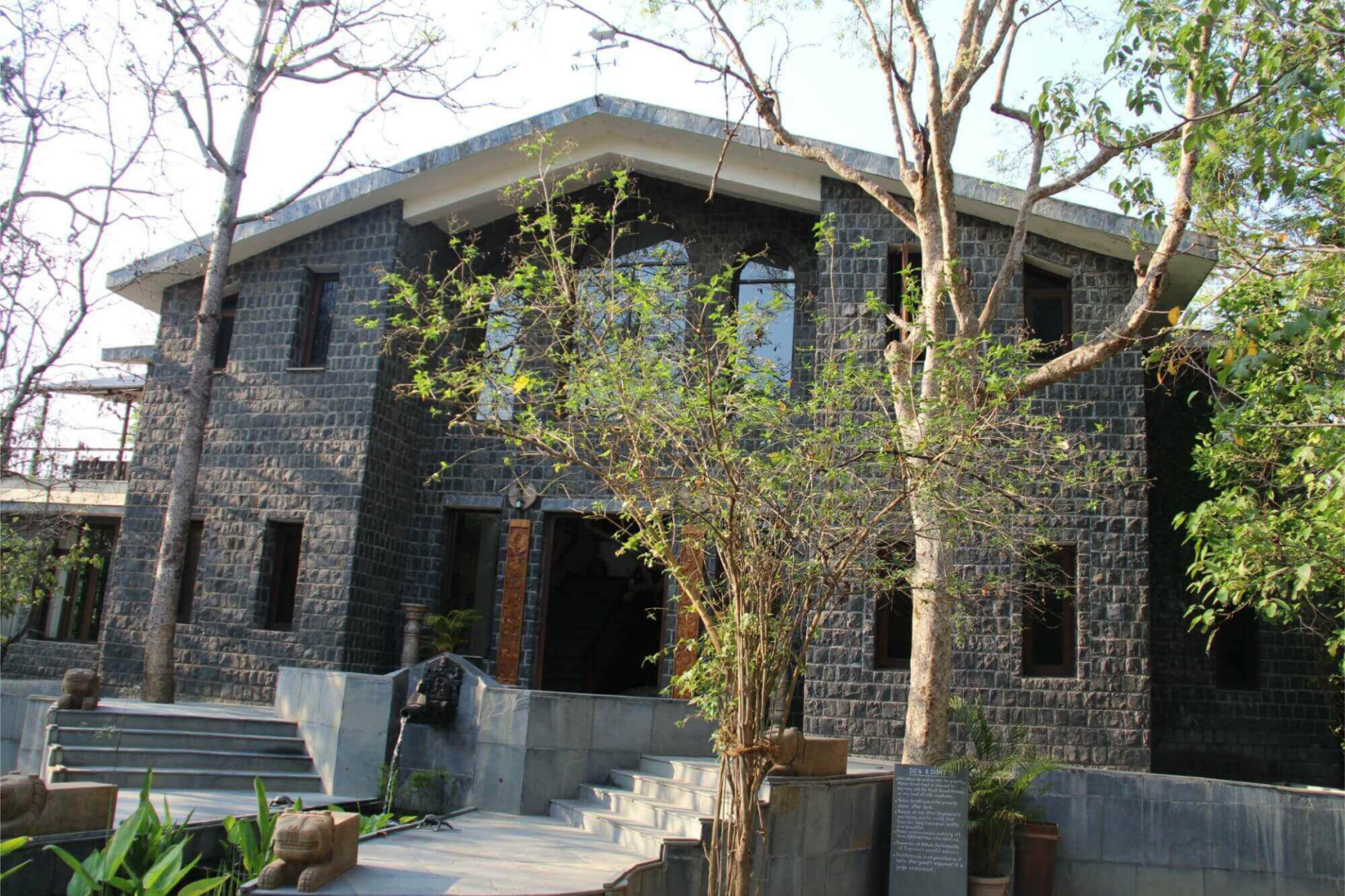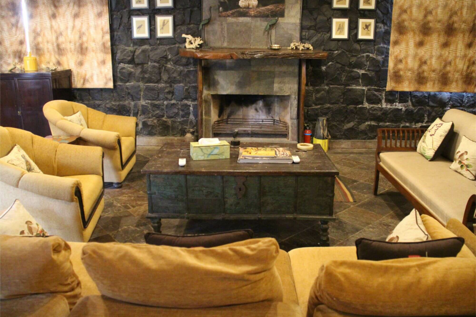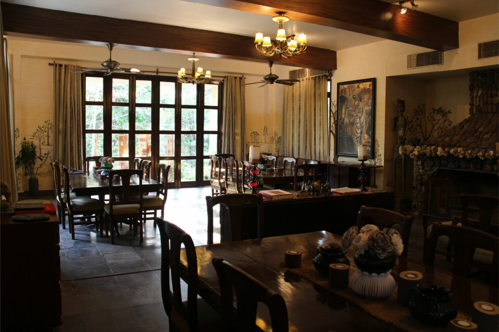 Herz der Lodge ist das Haupthaus, das nicht nur architektonisch, sondern auch aufgrund des gewählten schwarzen Backsteins für den Bau flüchtig an eine alte Kirche erinnert. Sobald man das Innere des Gebäudes betritt, wird man zwingend vom gewaltigen, fast kathedralähnlichen Bau überwältigt. Im Erdgeschoss ist ein sehr eleganter Speisesaal untergebracht, der einem Palast würdig sein könnte. Zwei imposante Treppen führen hinauf zum oberen Stock. Im Zentrum hebt sich der grandiose Stamm eines Saalbaums hevor, der fast bis zur Decke reicht.