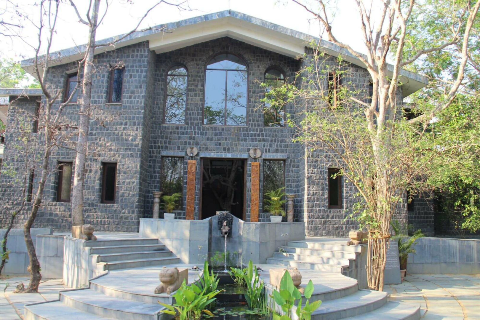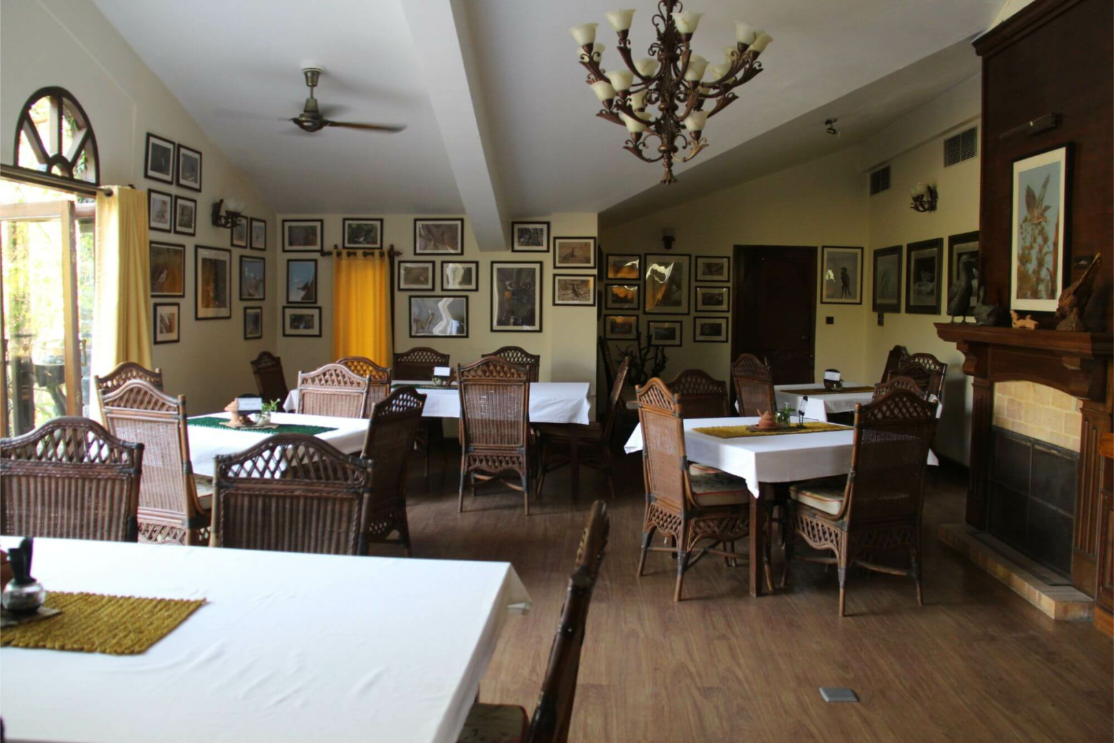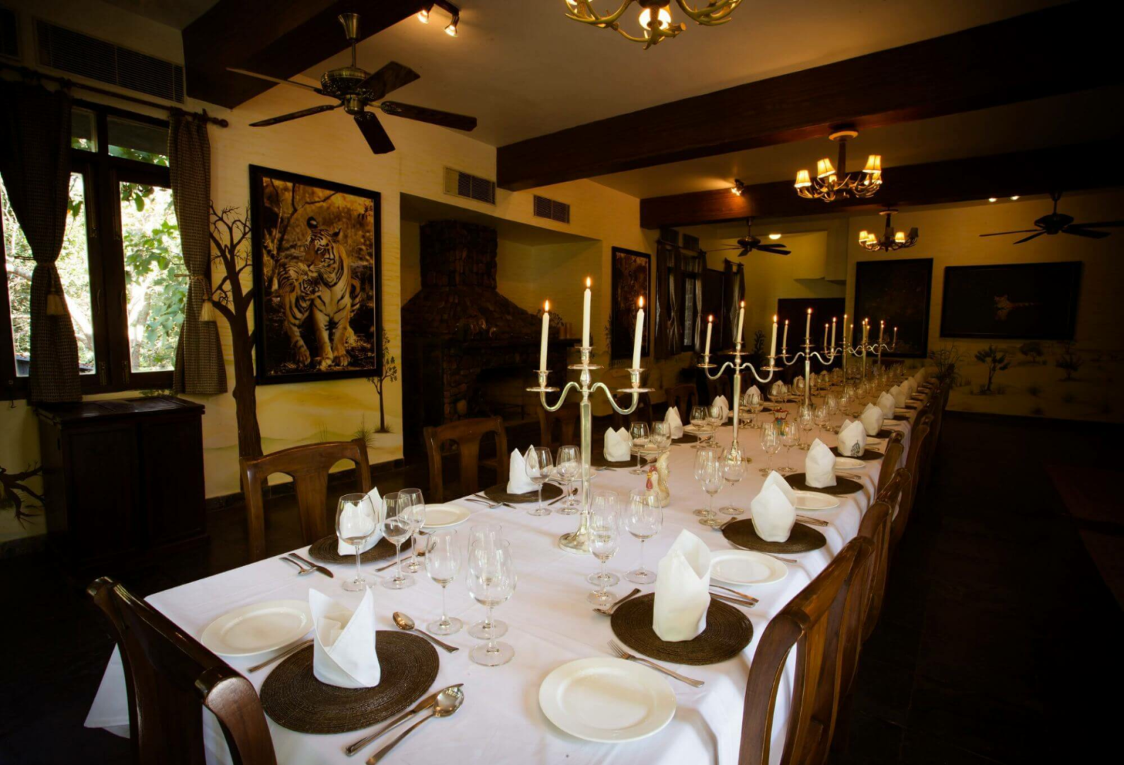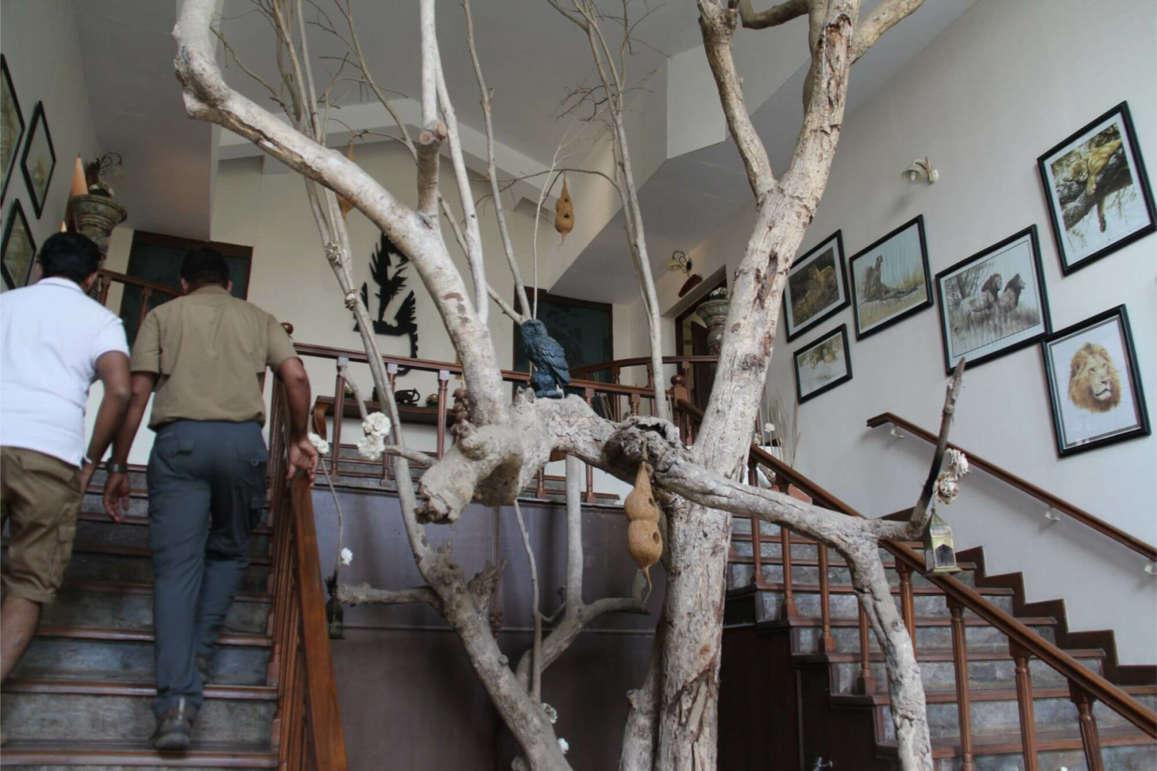 Herz der Lodge ist das Haupthaus, das nicht nur architektonisch, sondern auch aufgrund des gewählten schwarzen Backsteins für den Bau flüchtig an eine alte Kirche erinnert. Sobald man das Innere des Gebäudes betritt, wird man zwingend vom gewaltigen, fast kathedralähnlichen Bau überwältigt. Im Erdgeschoss ist ein sehr eleganter Speisesaal untergebracht, der einem Palast würdig sein könnte. Zwei imposante Treppen führen hinauf zum oberen Stock. Im Zentrum hebt sich der grandiose Stamm eines Saalbaums hevor, der fast bis zur Decke reicht.