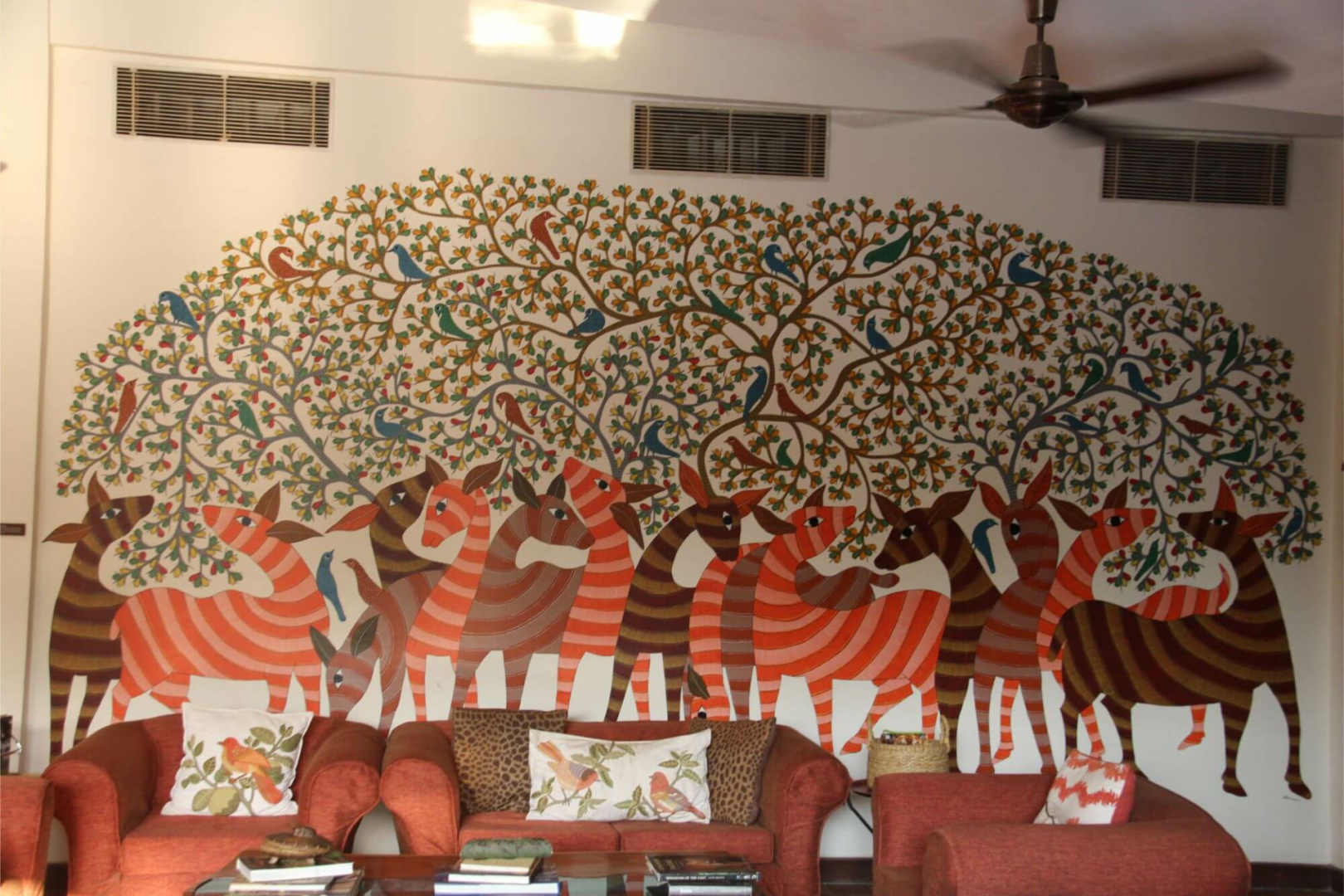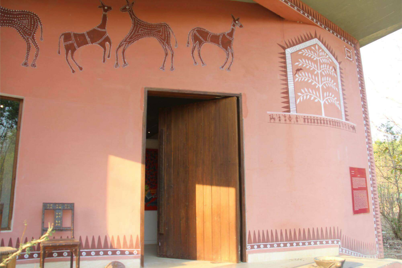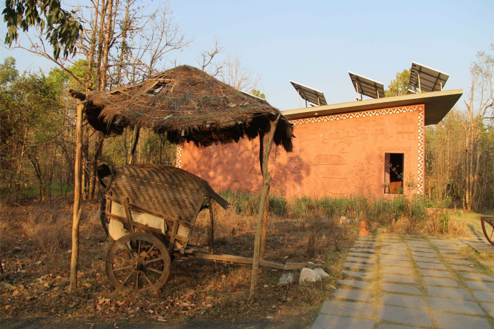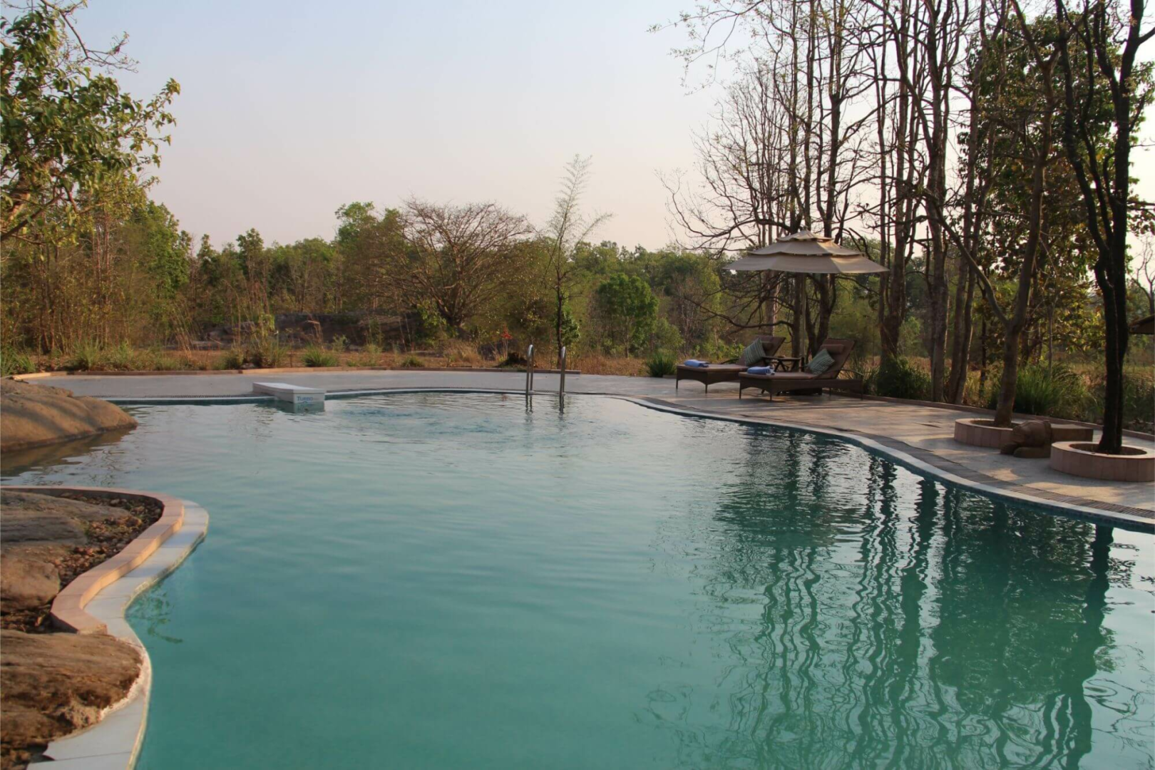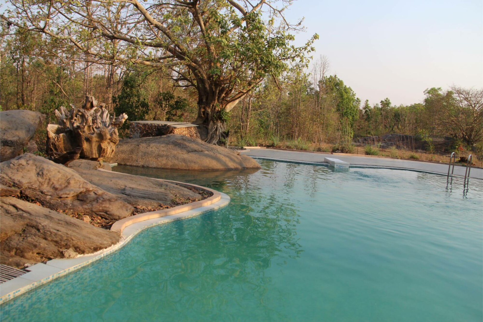 Zur Anlage gehört natürlich ein schöner Pool mit Blick auf das ländliche Idylle, sowie ein Museum, wo Kunstwerke des lokalen Gond-Volks mit einigen bemerkenswerten Malereien ausgestellt werden. Wer Lust hat, eines dieser typischen Bilder zu erwerben, kann sich im gut sortierten und eleganten Souvenirshop umschauen. Allerdings sind die hier zum Verkauf angebotenen Kunstobjekte keine billigen Dekoartikel.