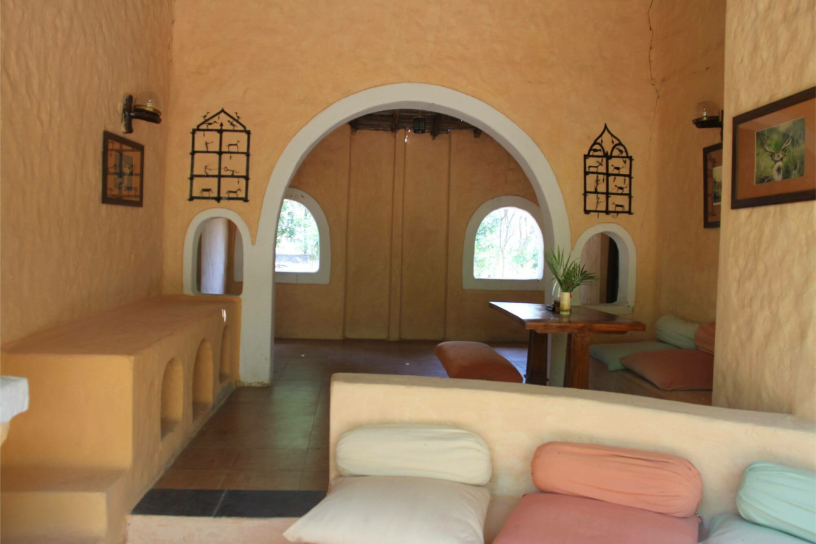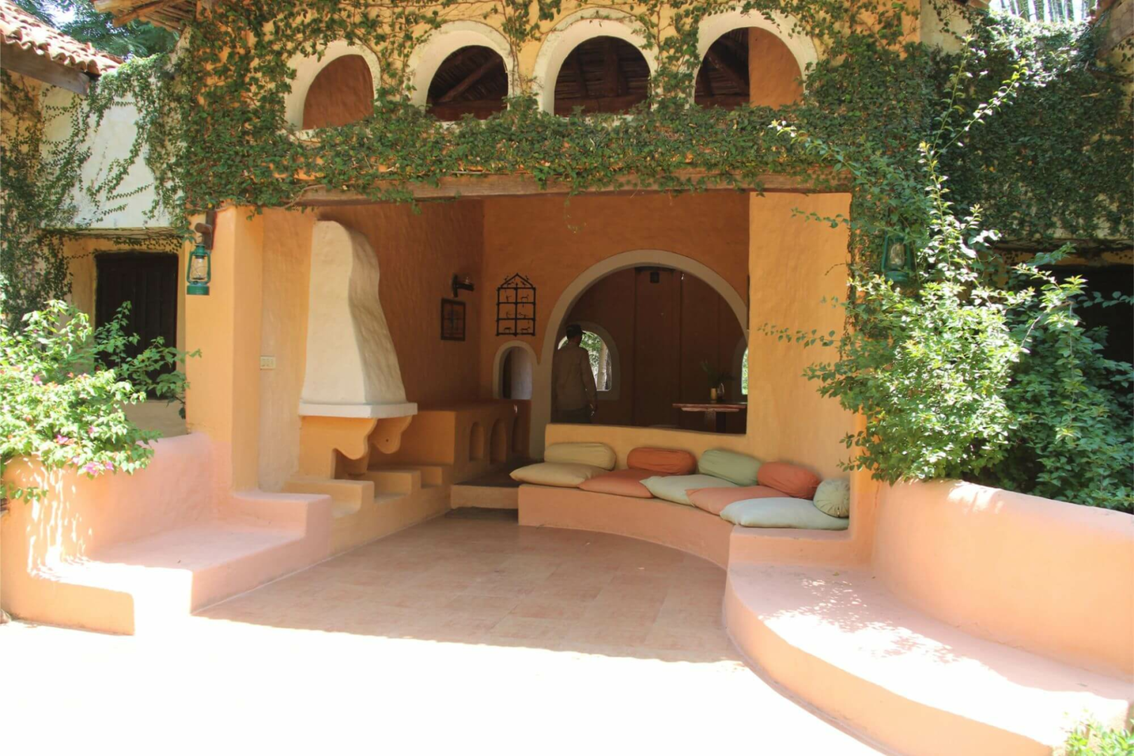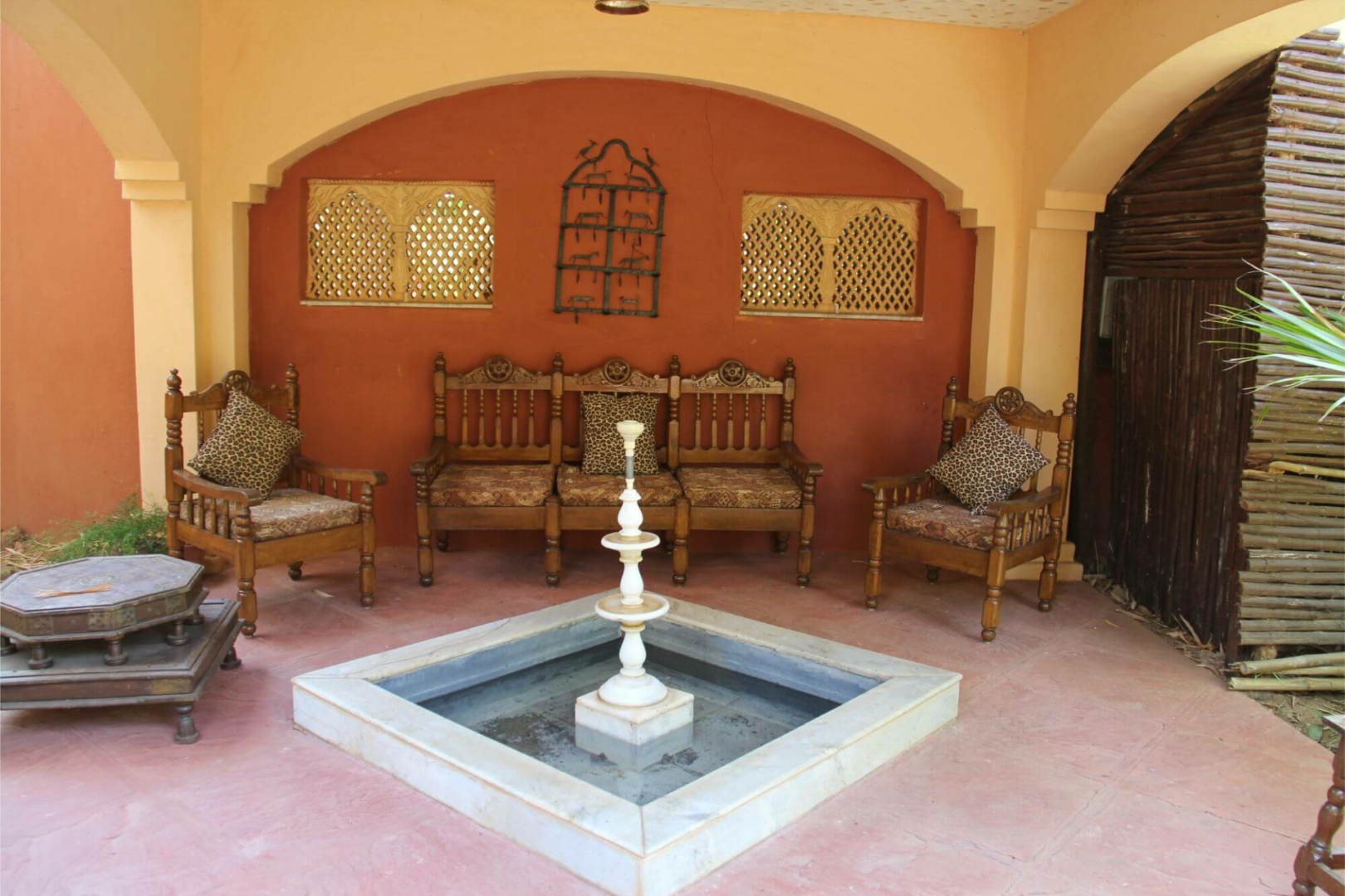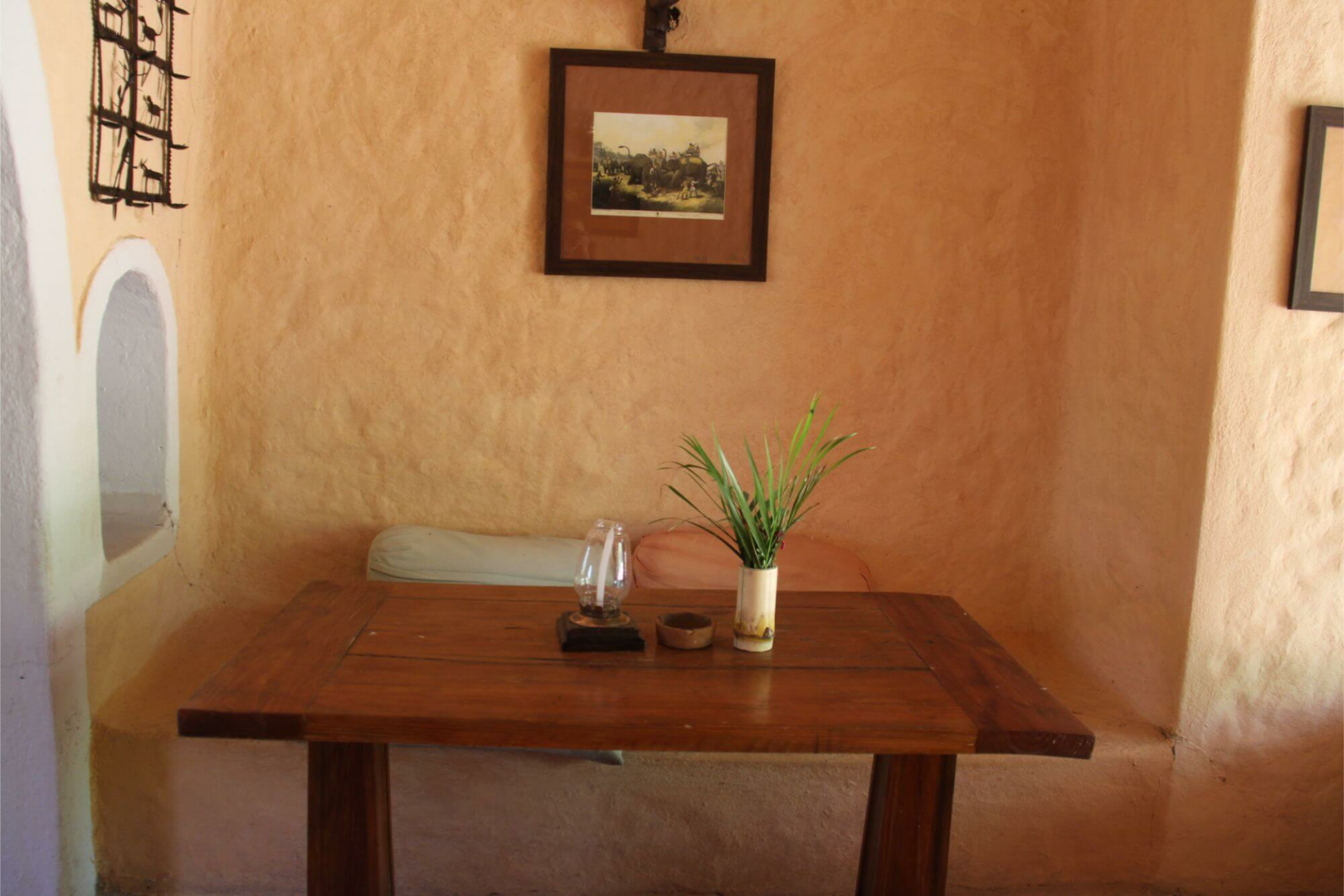 Die Zimmer befinden sich in einzeln stehenden Cottages, welche im Halbmondkreis um den Teich angeordnet sind. Seitlich von der Tür liegt ein gemütlich gestalteter Loungebereich mit von farbigen Kissen bezogenen Banken und einem kleinen Kamin. Im Inneren der Cottages befinden sich das dezent eingerichtete Schlafzimmer und das Badezimmer, letztere könnten modernisiert werden. Vielleicht aufgrund des rosa gestrichenen Lehms, welcher für den Bau genutzt wurde, hat man das Gefühl, in einer Höhle zu sein. Ein großer Swimmingpool ist auch vorhanden.