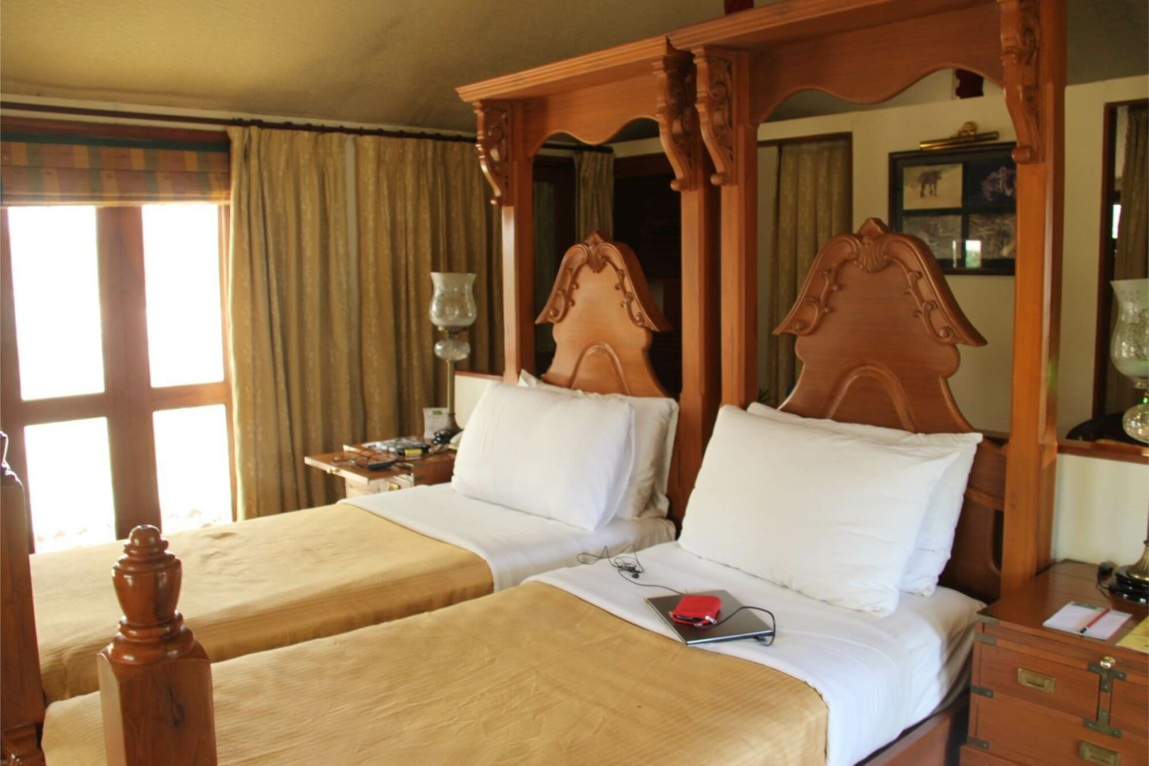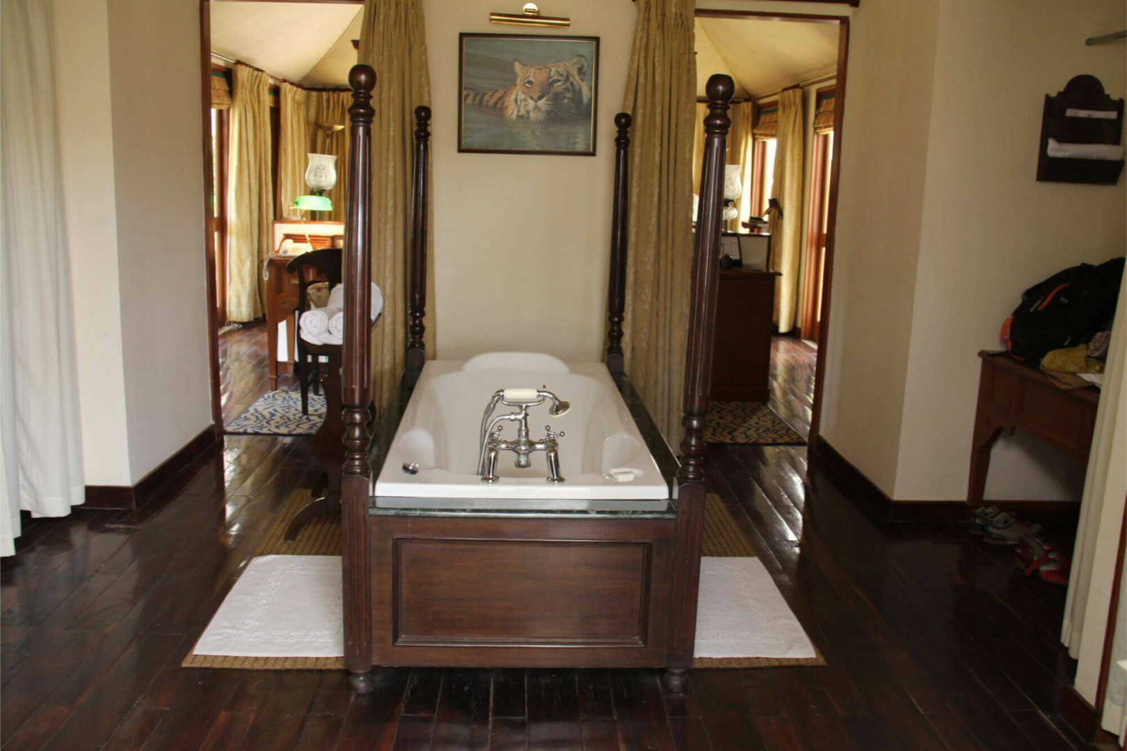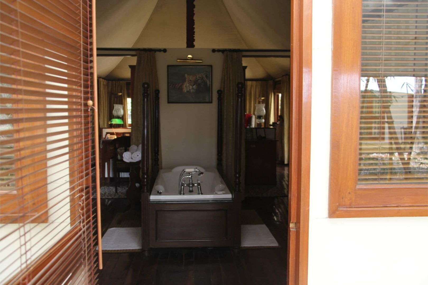 Geht man den Hauptweg geradeaus, so geht man durch ein von zwei Elefantenstatuen flankiertes Tor, welches in den für die Luxuszelte vorenthaltenen Bereich der Lodge führt. Die Zelte liegen rechts und links vom sehr angenehmen und schattigen Pool, der allein für die Nutzung durch Zeltgäste gedacht ist. Neben dem kleinen Pool liegt das sehr elegant dekorierte Messzelt, wo Mahlzeiten für die Zeltgäste serviert werden. Eigentlich sind die Zelte keine solchen, sondern richtige feste Zimmer, die auf einer Plattform errichtet wurden, über welche ein sehr großes Kuppelzelt überspannt wurde. Man findet Sitzecken vorne und hinten. Das Zeltinnere ist in Schlaf- und Badezimmer unterteilt, beide mit einer fast identischen Größe. Beide sind sehr elegant eingerichtet, mit schönen dunklen Massivholzmöbeln und enorm vielen schweren Vorhängen. Hinter dem Bettkopf verstecken sich zwei große Schreibtische. Zwei große Sessel mit Kaffeetisch schmücken auch den Raum. Der Boden ist holzverkleidet. Hinter den Schreibtischen trennen zwei Vorhänge den Zugang ins Badezimmer, das wirklich ein Traum ist, mit freistehender Badewanne, zwei großen Waschbecken mit Spiegel, Dusche, Toilette sowie Ablagemöglichkeiten. Gegenüber der Badewanne öffnet sich eine Holztür zur hinteren Veranda.