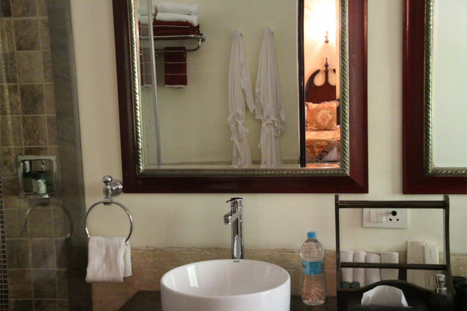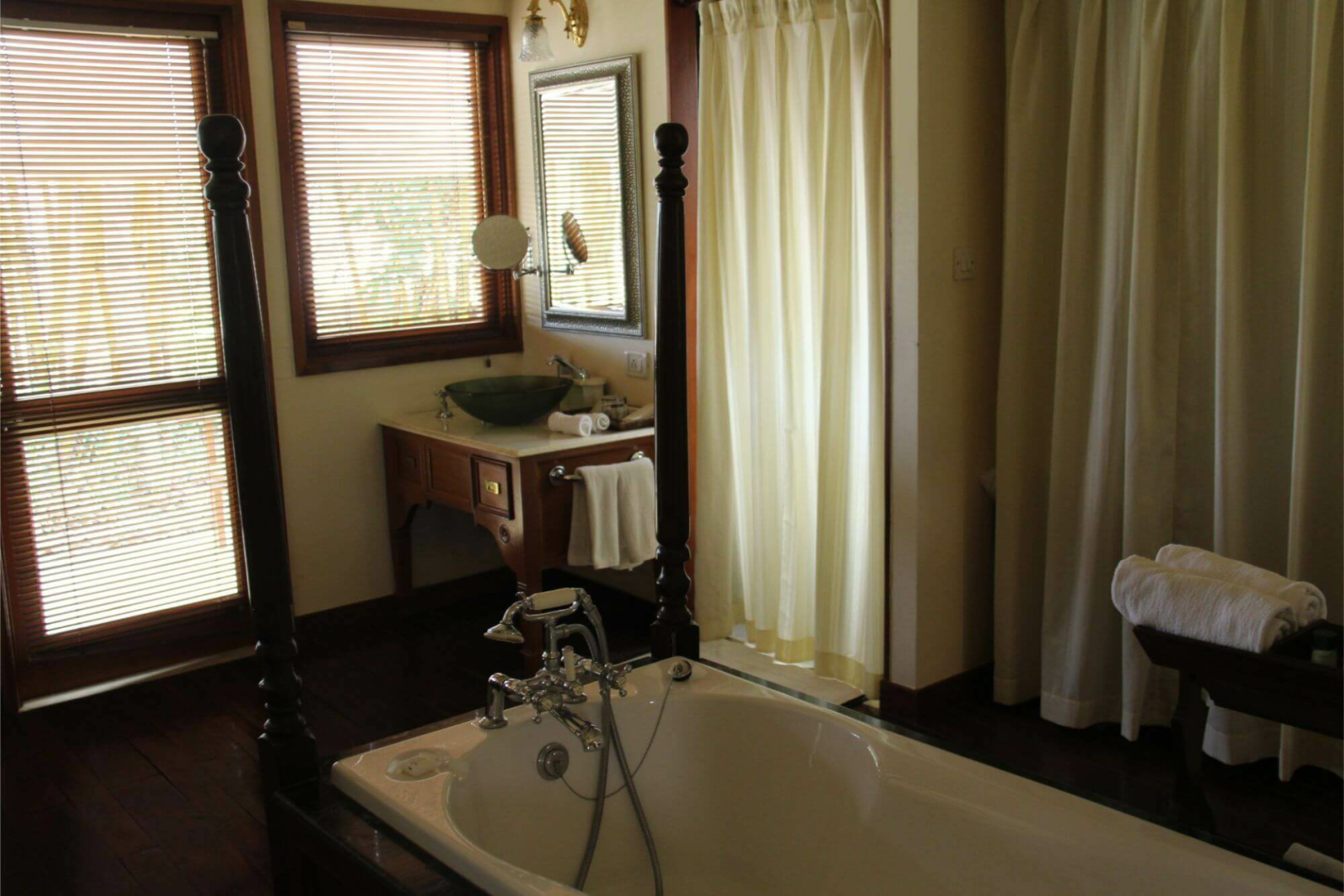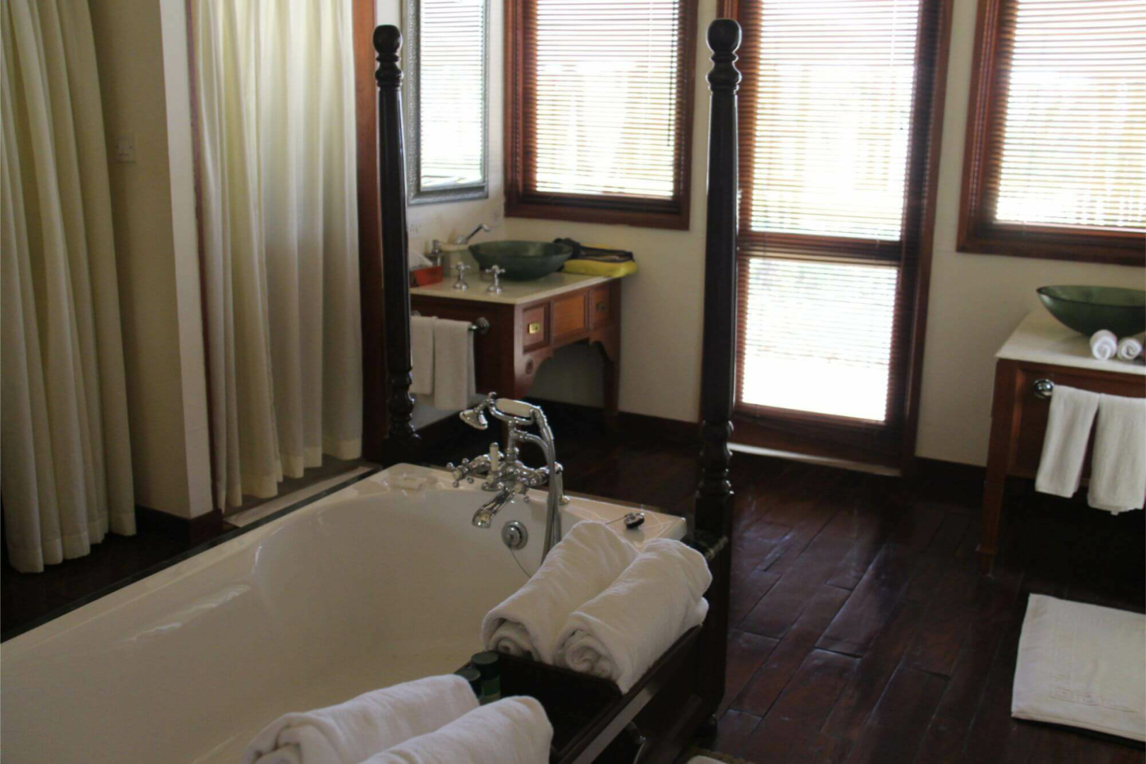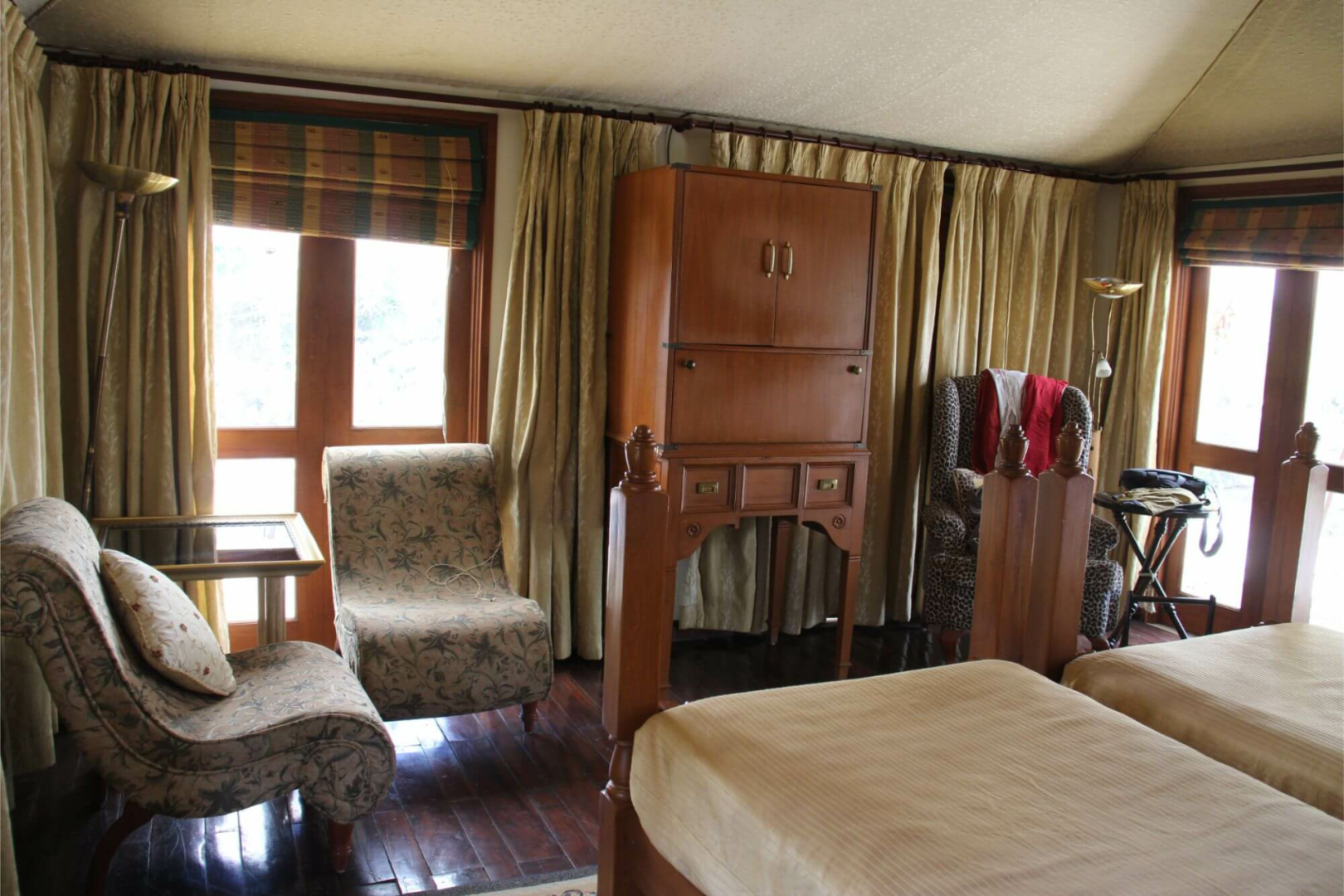 Geht man den Hauptweg geradeaus, so geht man durch ein von zwei Elefantenstatuen flankiertes Tor, welches in den für die Luxuszelte vorenthaltenen Bereich der Lodge führt. Die Zelte liegen rechts und links vom sehr angenehmen und schattigen Pool, der allein für die Nutzung durch Zeltgäste gedacht ist. Neben dem kleinen Pool liegt das sehr elegant dekorierte Messzelt, wo Mahlzeiten für die Zeltgäste serviert werden. Eigentlich sind die Zelte keine solchen, sondern richtige feste Zimmer, die auf einer Plattform errichtet wurden, über welche ein sehr großes Kuppelzelt überspannt wurde. Man findet Sitzecken vorne und hinten. Das Zeltinnere ist in Schlaf- und Badezimmer unterteilt, beide mit einer fast identischen Größe. Beide sind sehr elegant eingerichtet, mit schönen dunklen Massivholzmöbeln und enorm vielen schweren Vorhängen. Hinter dem Bettkopf verstecken sich zwei große Schreibtische. Zwei große Sessel mit Kaffeetisch schmücken auch den Raum. Der Boden ist holzverkleidet. Hinter den Schreibtischen trennen zwei Vorhänge den Zugang ins Badezimmer, das wirklich ein Traum ist, mit freistehender Badewanne, zwei großen Waschbecken mit Spiegel, Dusche, Toilette sowie Ablagemöglichkeiten. Gegenüber der Badewanne öffnet sich eine Holztür zur hinteren Veranda.
