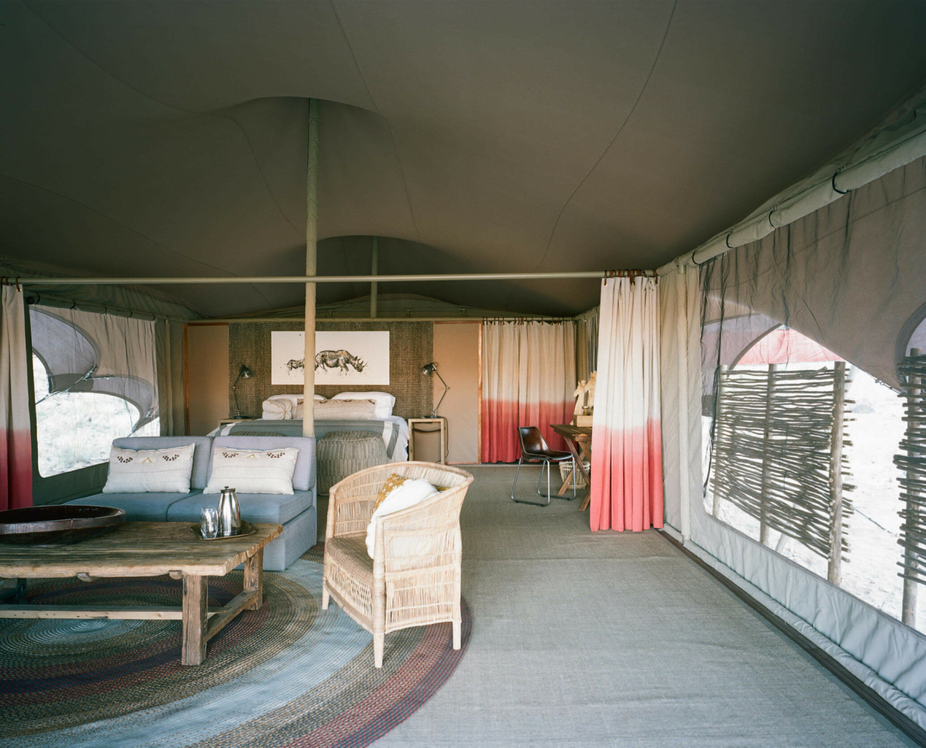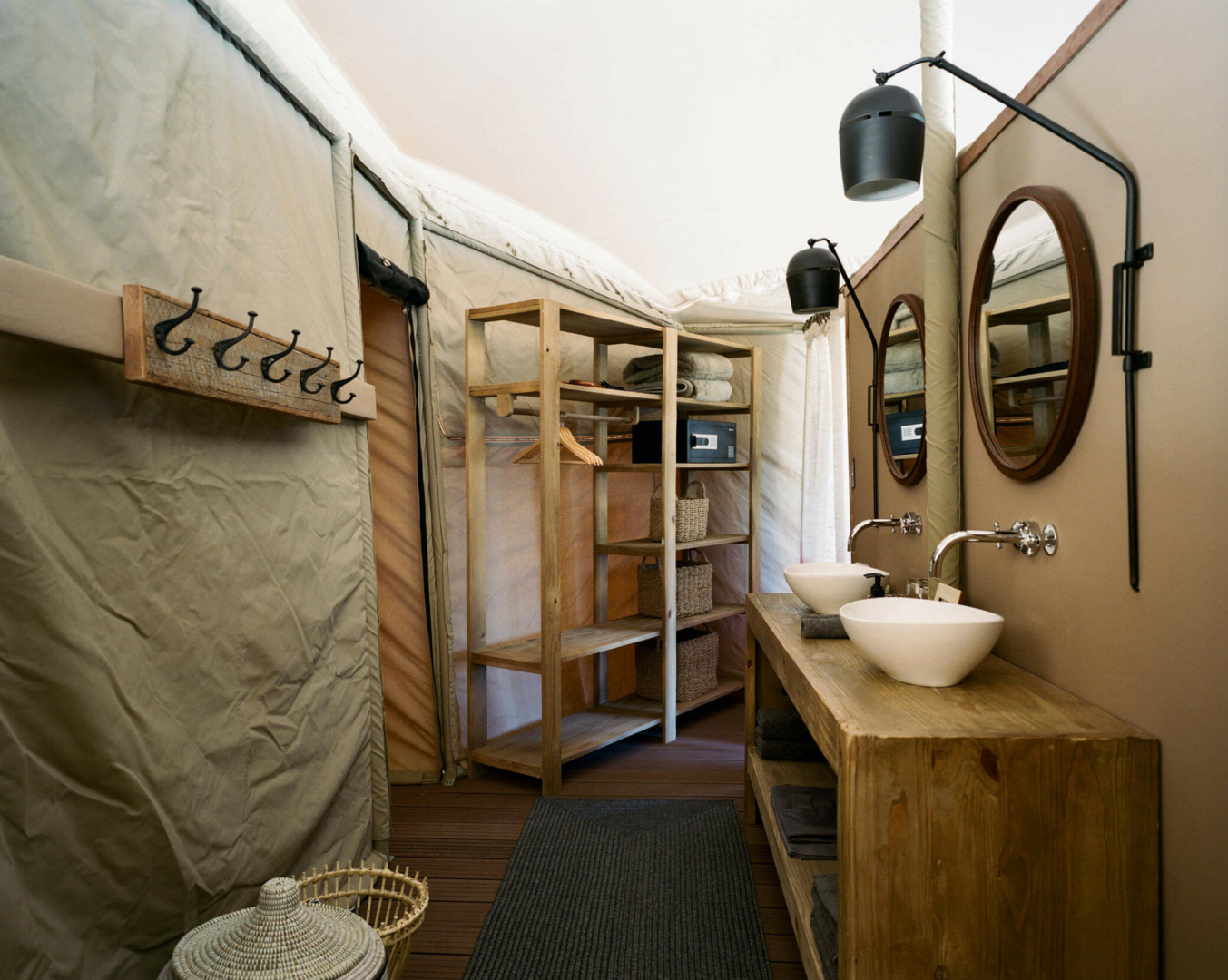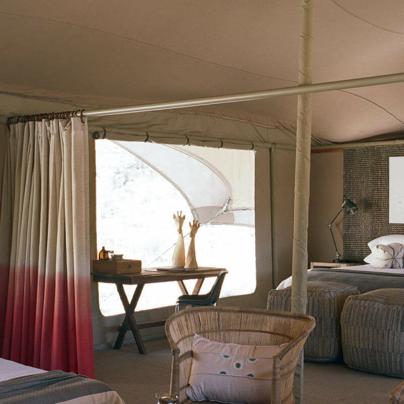 Die sechs Zeltsuites sind auf Decks aus Holz, Bambus und recyceltem Material gebaut. Holzstufen führen hinauf zu einer überdachten Veranda mit ein paar Stühlen und einem Sitzsack, von dem aus man den Blick über das Tal genießen kann. Im Inneren befindet sich das große Schlafzimmer mit bequemen Kingsize- oder Einzelbetten sowie Nachttischen und Lampen, einem kleinen Bambussofa und einem Schreibtisch mit Trinkwasser sowie einer Tee- und Kaffeestation. Im hinteren Teil des Zelts befindet sich das komfortable Badezimmer.
