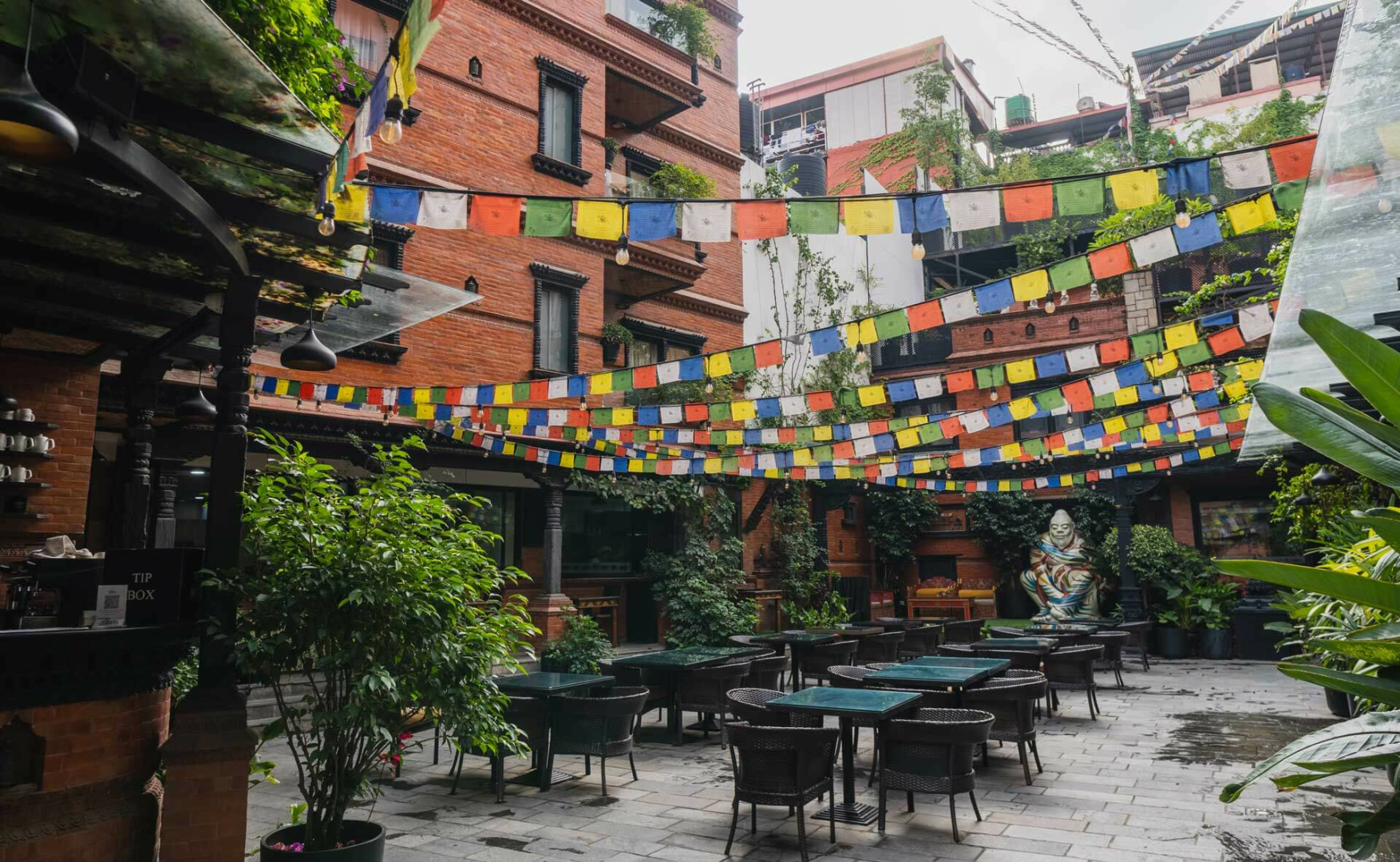 Die makellos restaurierten, 50 Jahre alten, handgeschnitzten Säulen, die handgeschnitzten Wasserhähne aus Stein, die den Innenhof schmücken, die traditionellen Gitterfenster und die handgefertigten Terrakottaziegel an der Fassade des Hotels erinnern jederzeit daran, dass man sich in Nepal befindet.