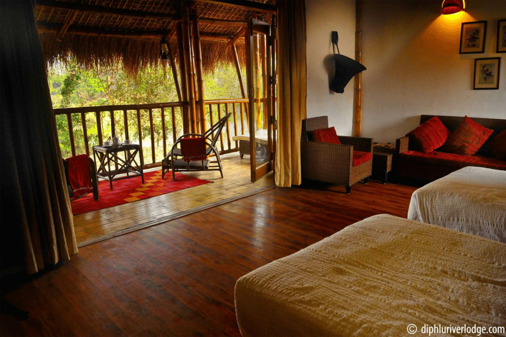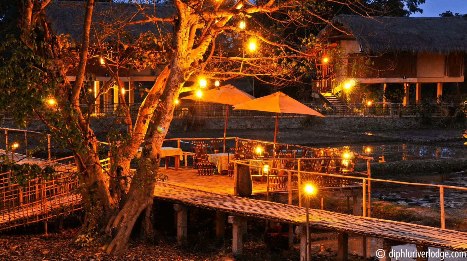 Diphlu River Lodge liegt am gleichnamigen Fluss nah des westlichen Teils des Parks. Die etwa 14 Bungalows gruppieren sich entlang des Flusses und um ein Reisefeld herum.