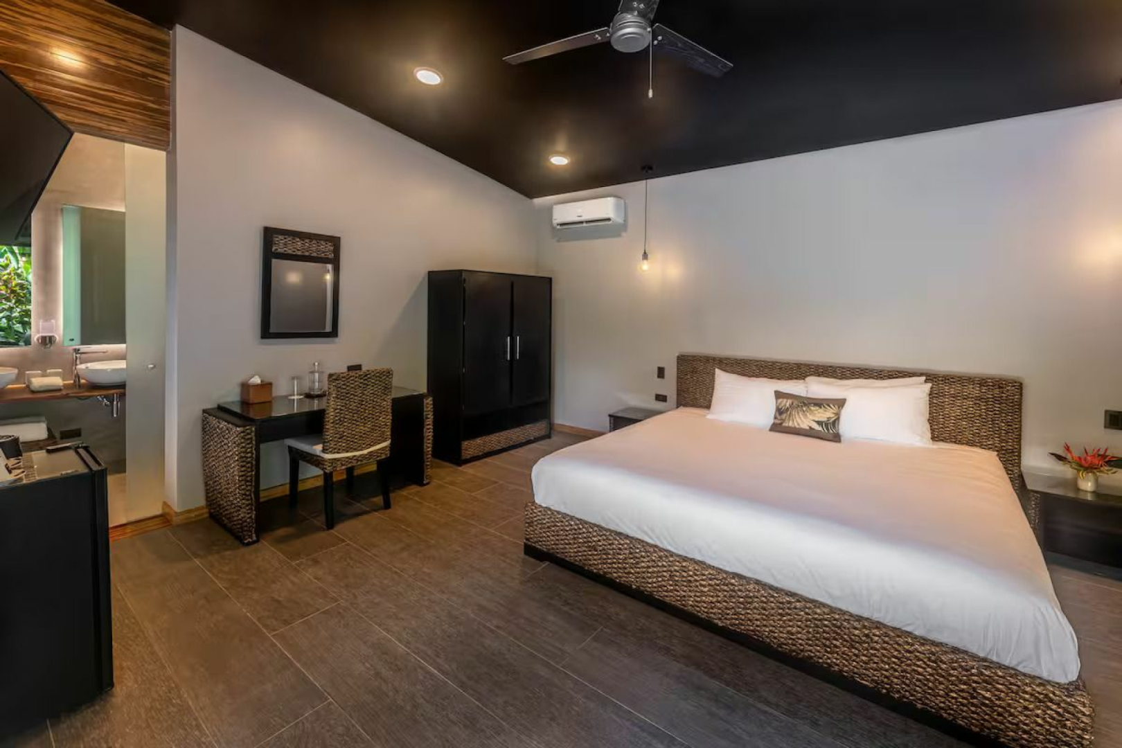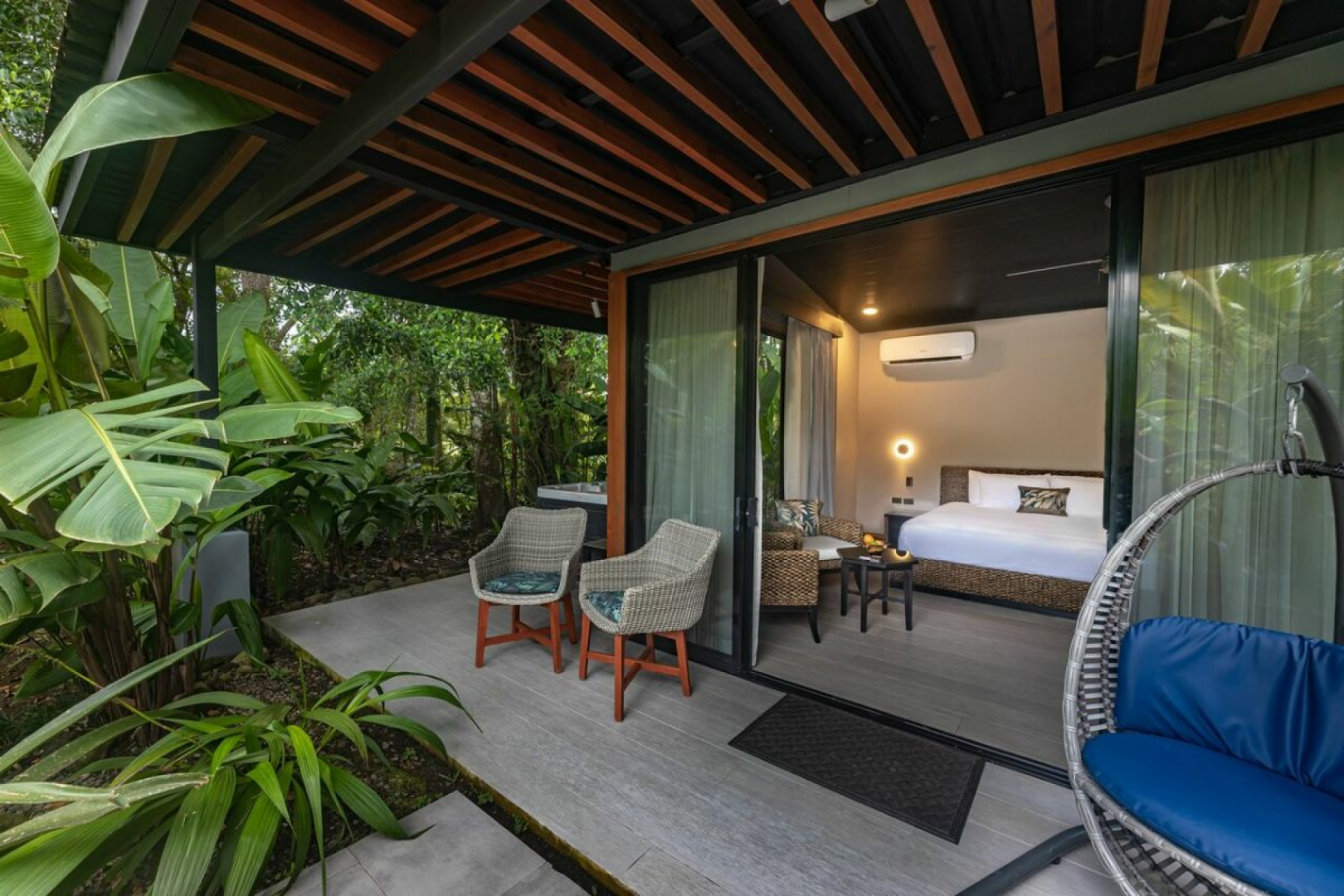 Die Vordertür ist eine Glasschiebetür, die auch mit Fliegengittertüren versehen ist, wenn Sie frische Luft haben wollen. Es gibt eine Veranda mit einer Schaukel zum Sitzen und Terrassenmobilär. Das Badezimmer mit Regendusche ist geräumig. Es gibt einen Deckenventilator und natürlich auch eine Klimaanlage. Jedes Zimmer ist mit einem Kühlschrank, einer Kaffeemaschine, einer Wasserkaraffe und einen Safe ausgestattet.