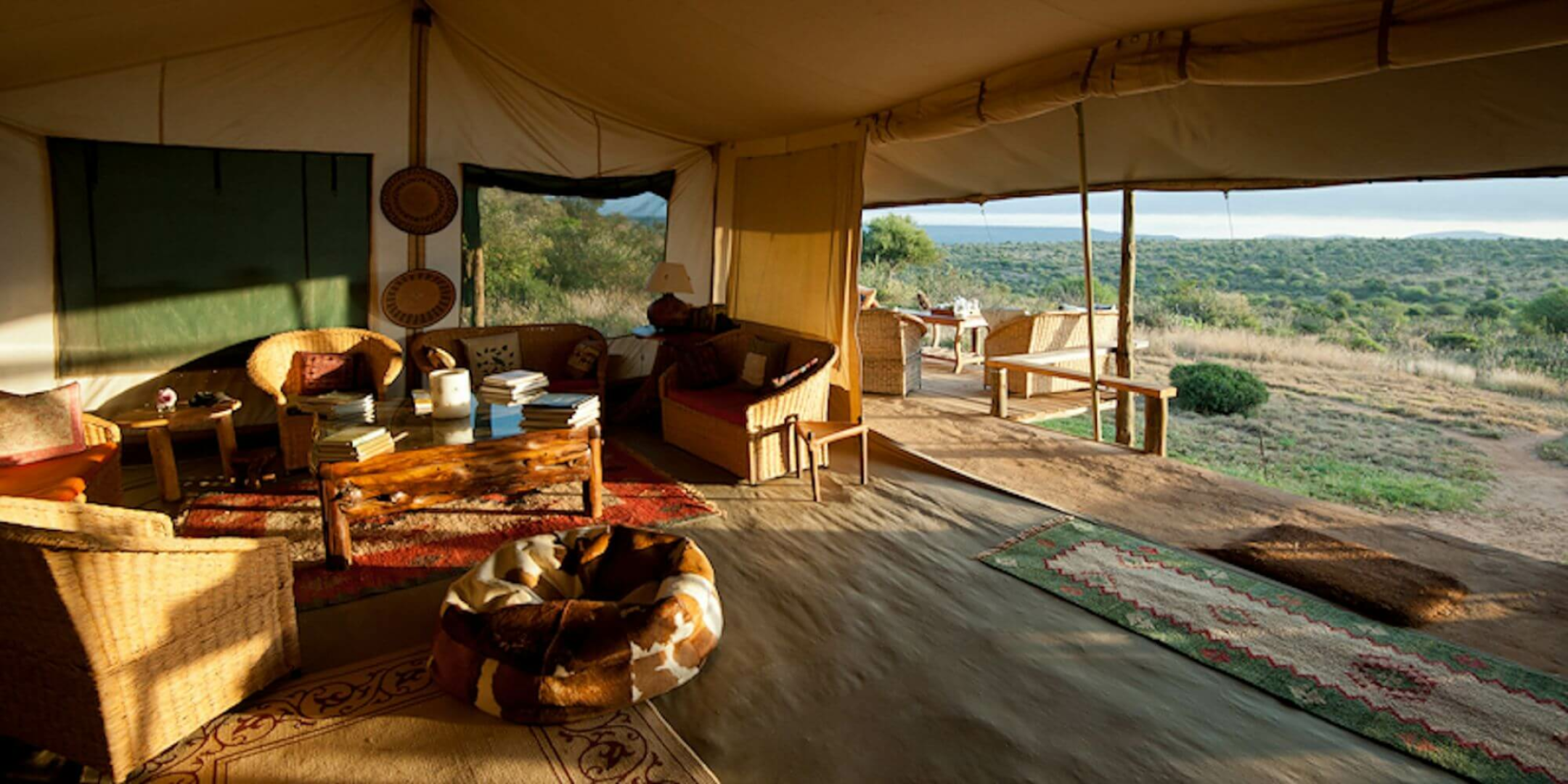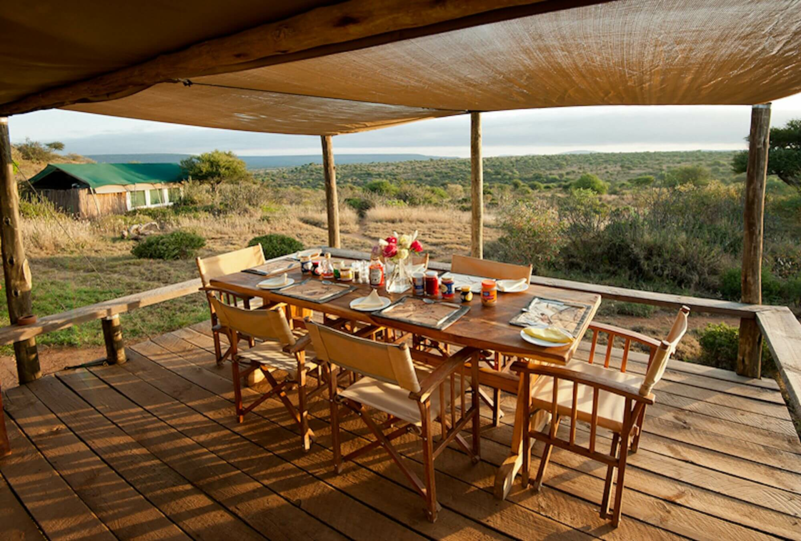 Veranda mit Aussicht auf die großen Ebenen. Im Inneren sind die Zelte