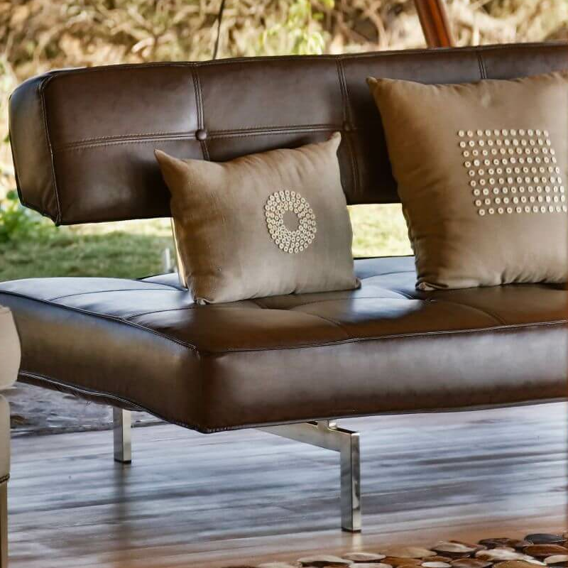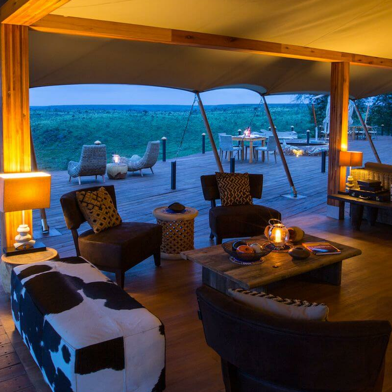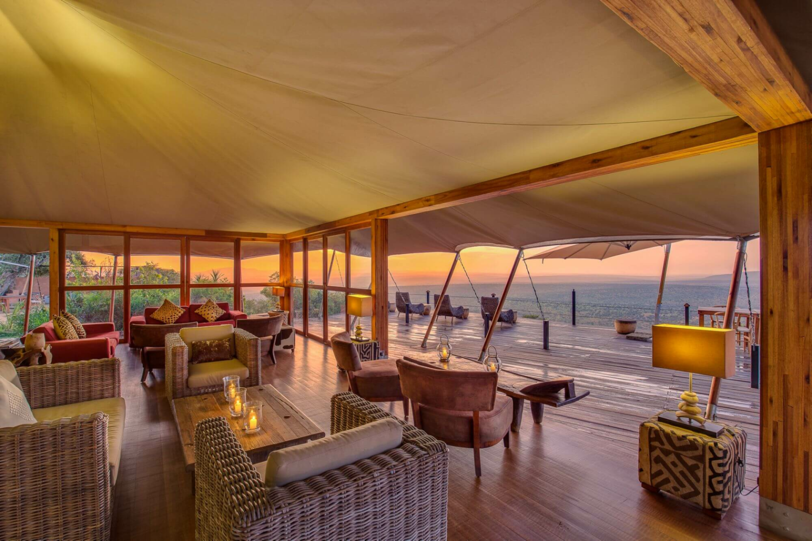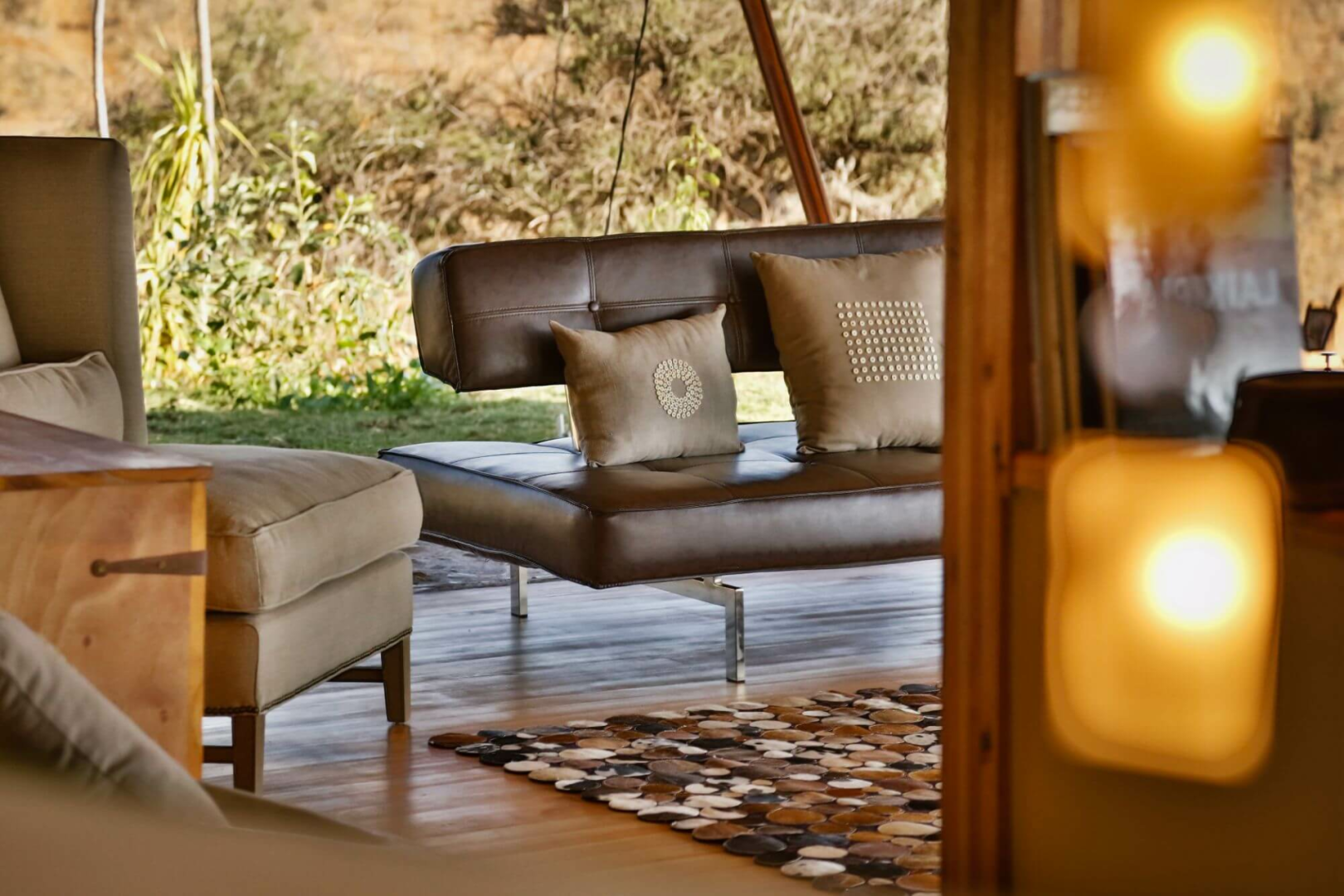 Ein Buschfeuer zerstörte das originale Camp im Jahr 2013. Bereits 2016 wurde das Loisaba Tented Camp wieder eröffnet und bietet neben einer qualitativ sehr hochwertigen Unterkunft einen unglaublich schönen Blick auf den Mount Kenia. Herzstück des Camps ist der zentral liegende Messbereich, eine Konstruktion aus Leinen und hellen Holz mit einer komplett nach vorne geöffneten Vorderseite mit Blick auf die weitläufige Terrasse mit Feuerstelle und dem grandiosen Ausblick. Im Inneren des Messzeltes findet man zahlreiche Sitzmöglichkeiten in schönen und eleganten Ledersesseln und Korbsofas, welche um niedrige Kaffeetischen aus Holz angeordnet sind.