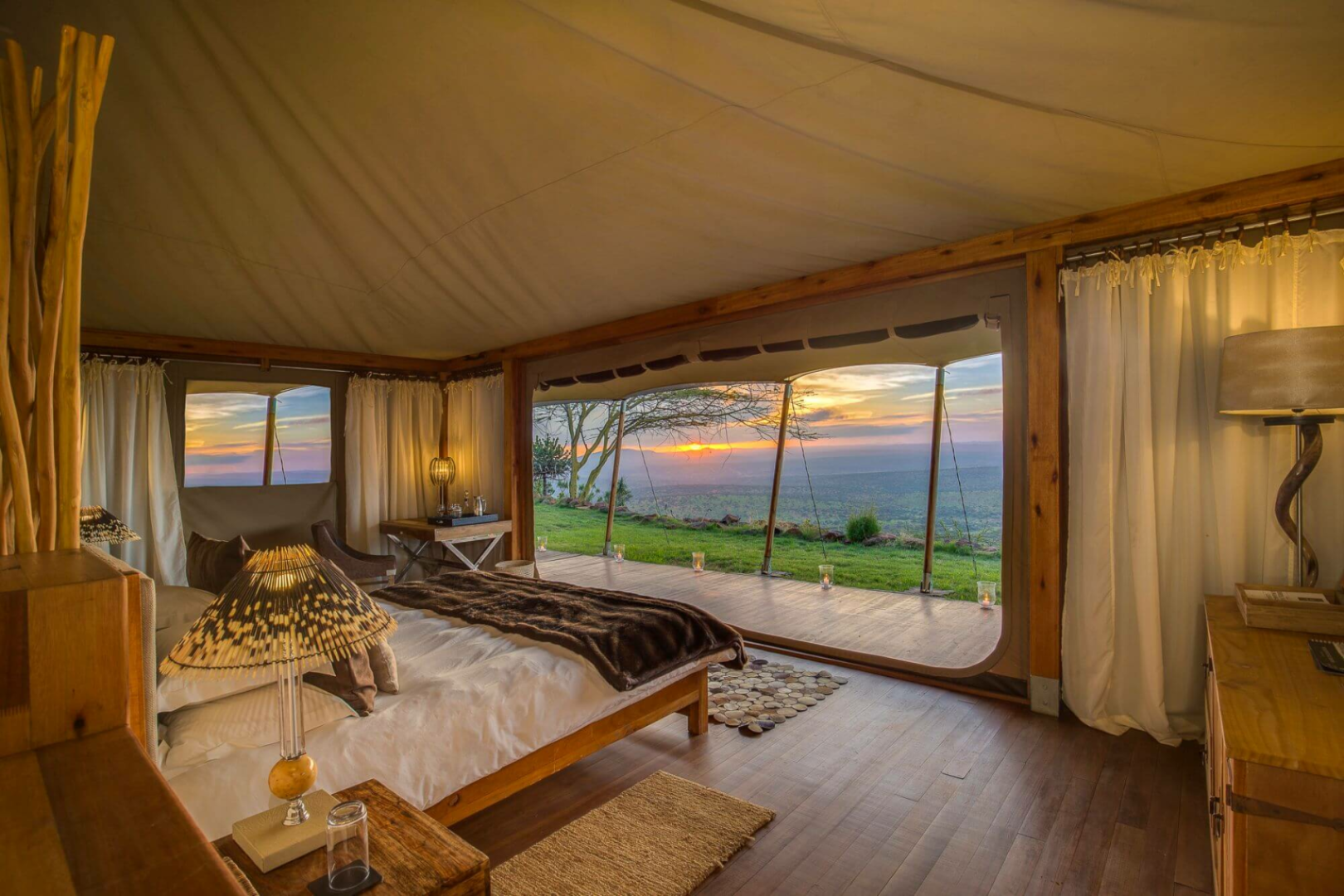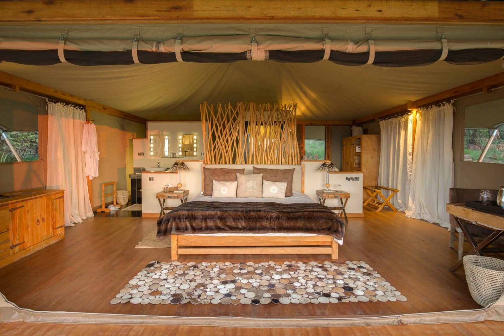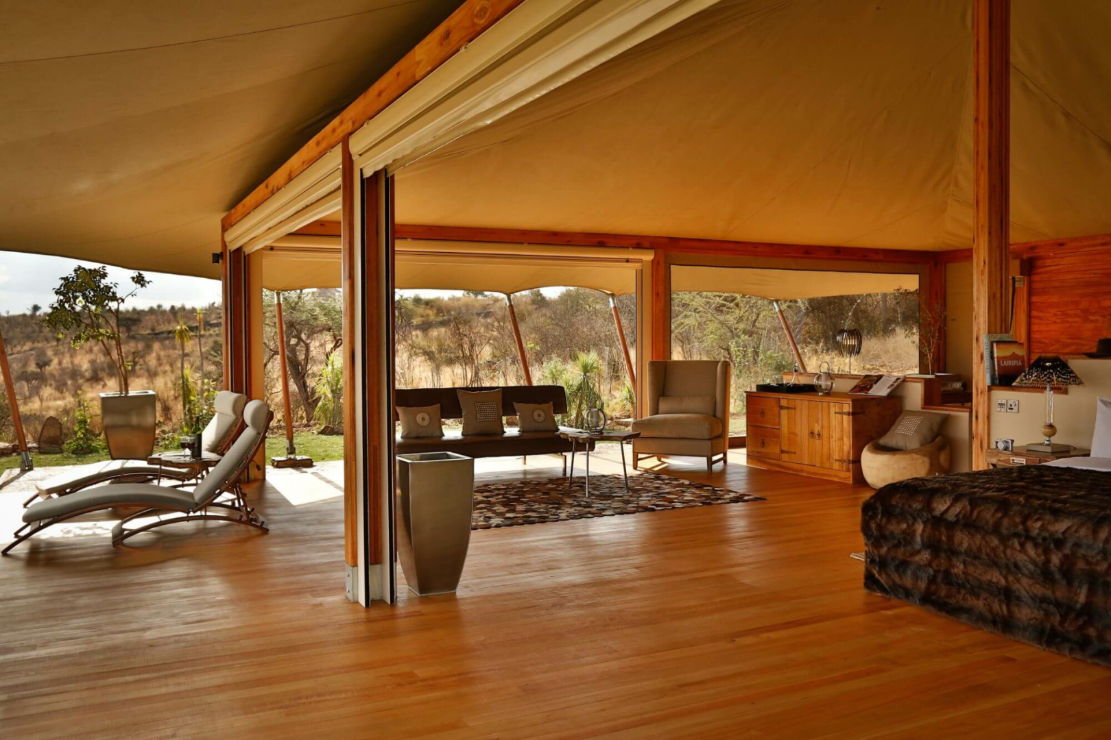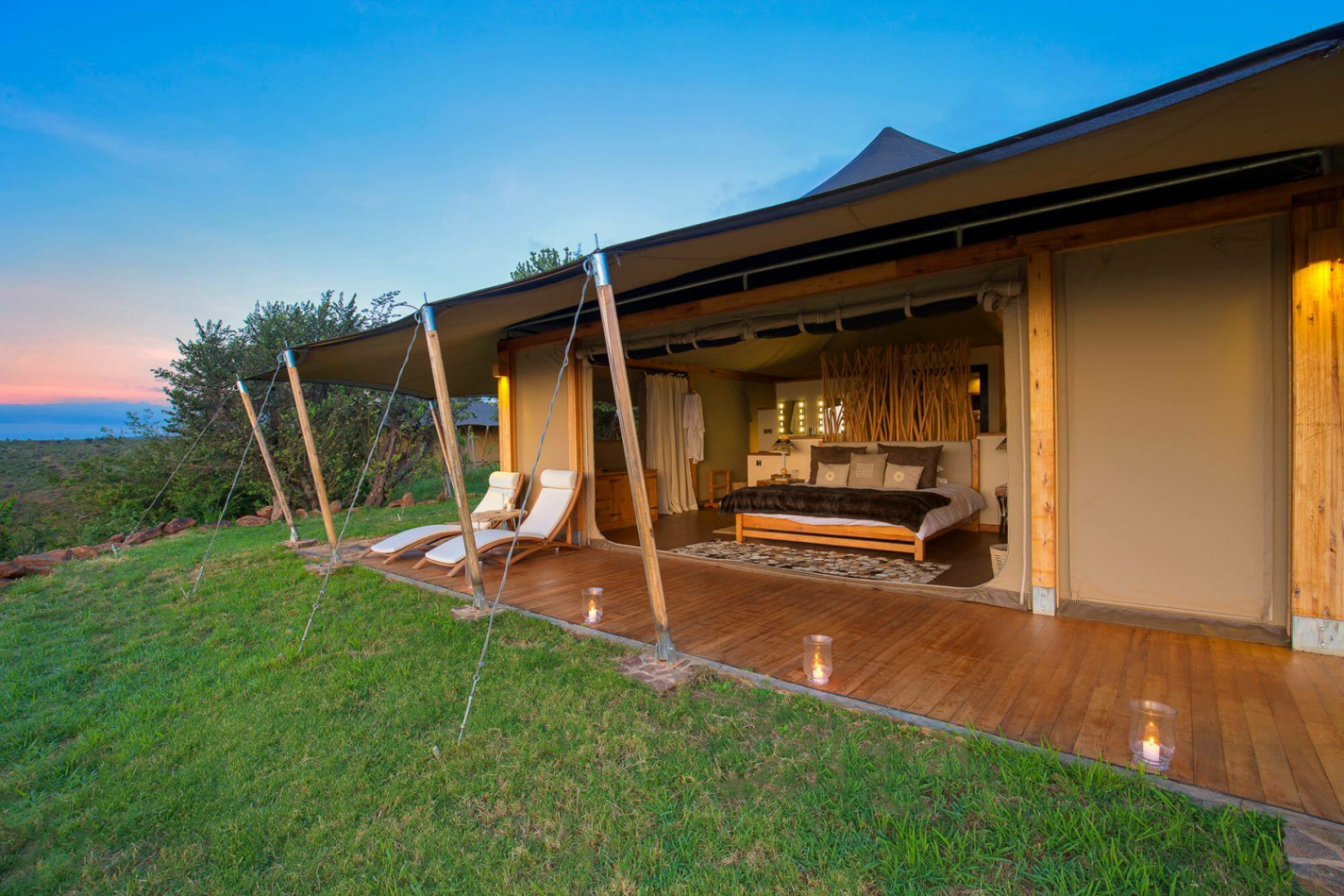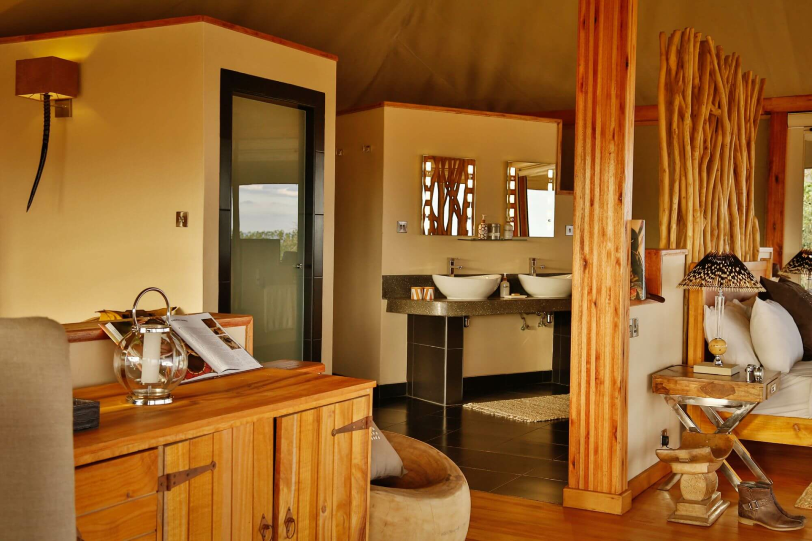 Die Unterbringung der Gäste erfolgt in zwölf sehr großzügigen Zeltsuiten, direkt am Rande des Cliffs errichtet. Vor jedem Zelt gibt es ein kleines Stück Wiese, wo Liegestühle und ein Tisch zum Verweilen in der fantastischen Landschaft einladen. Im Inneren sind die Luxuszelte, die auf Holzböden errichtet sind, sehr komfortabel und modern. Im Gegensatz zu anderen Luxuslodges, die mehr auf einen rustikalen Touch setzen, dominieren in Loisaba klare Linien und ein minimalistisches Design. Helle Farben und polierte Holzdielen fallen sofort ins Auge. Das Bild wird durch große, bequeme Betten, einen Schreibtisch (mit einem Dekanter für süßen Sherry aus dem Haus), viel Stauraum für Kleidung und bequemen Sesseln abgerundet. Die Badezimmer sind groß und mit zwei glänzenden frei stehenden Waschbecken aus Keramik und begehbarer Dusche ausgestattet.