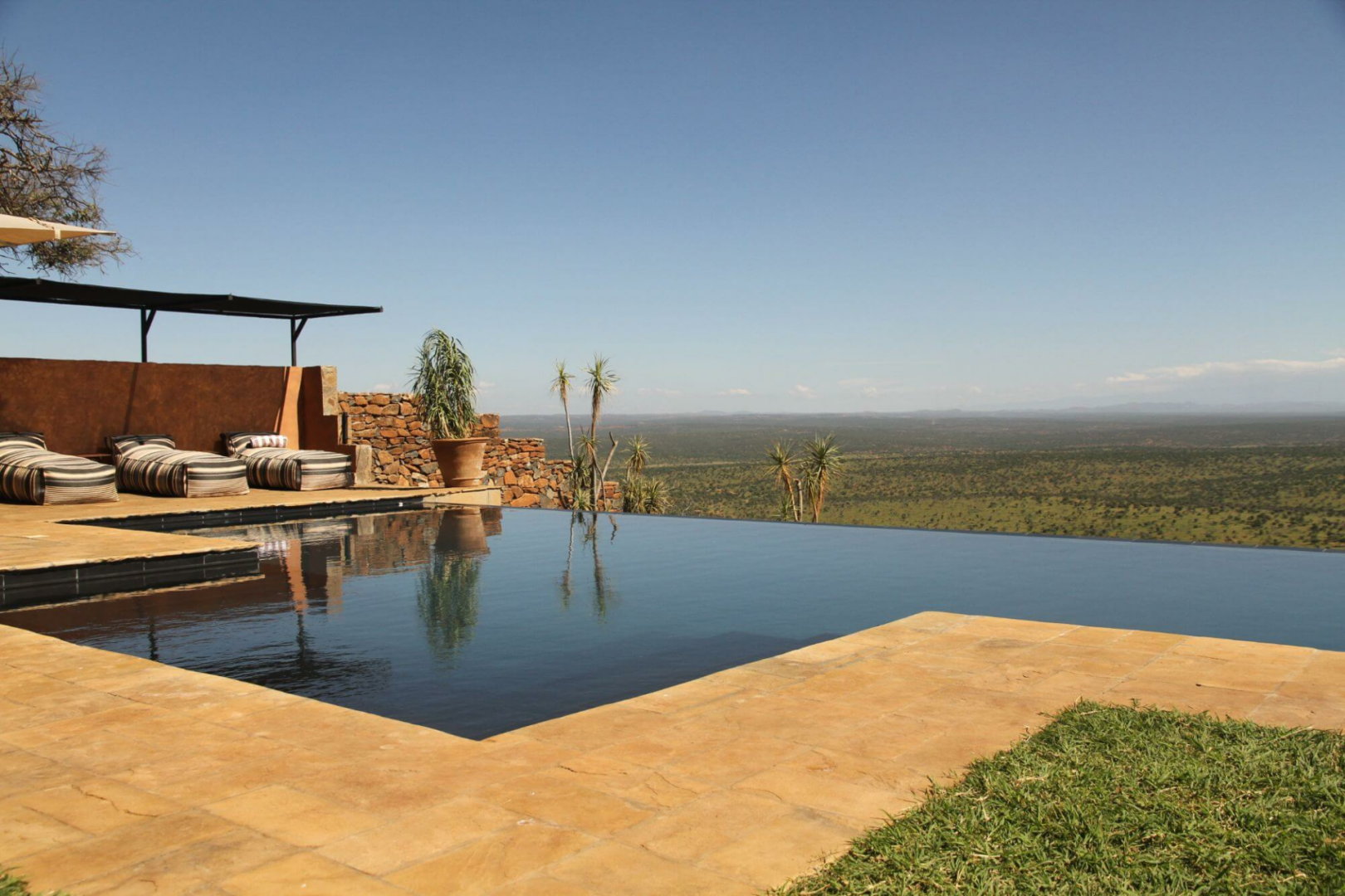 Links vom Loungebereich befindet sich ein wunderschöner Infinity-Pool mit einigen Tagesbetten. Unterhalb des Berghanges gibt es ein Wasserloch, das zahlreiches Wild anlockt.