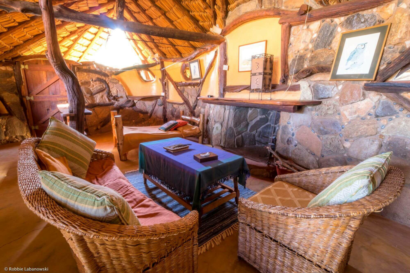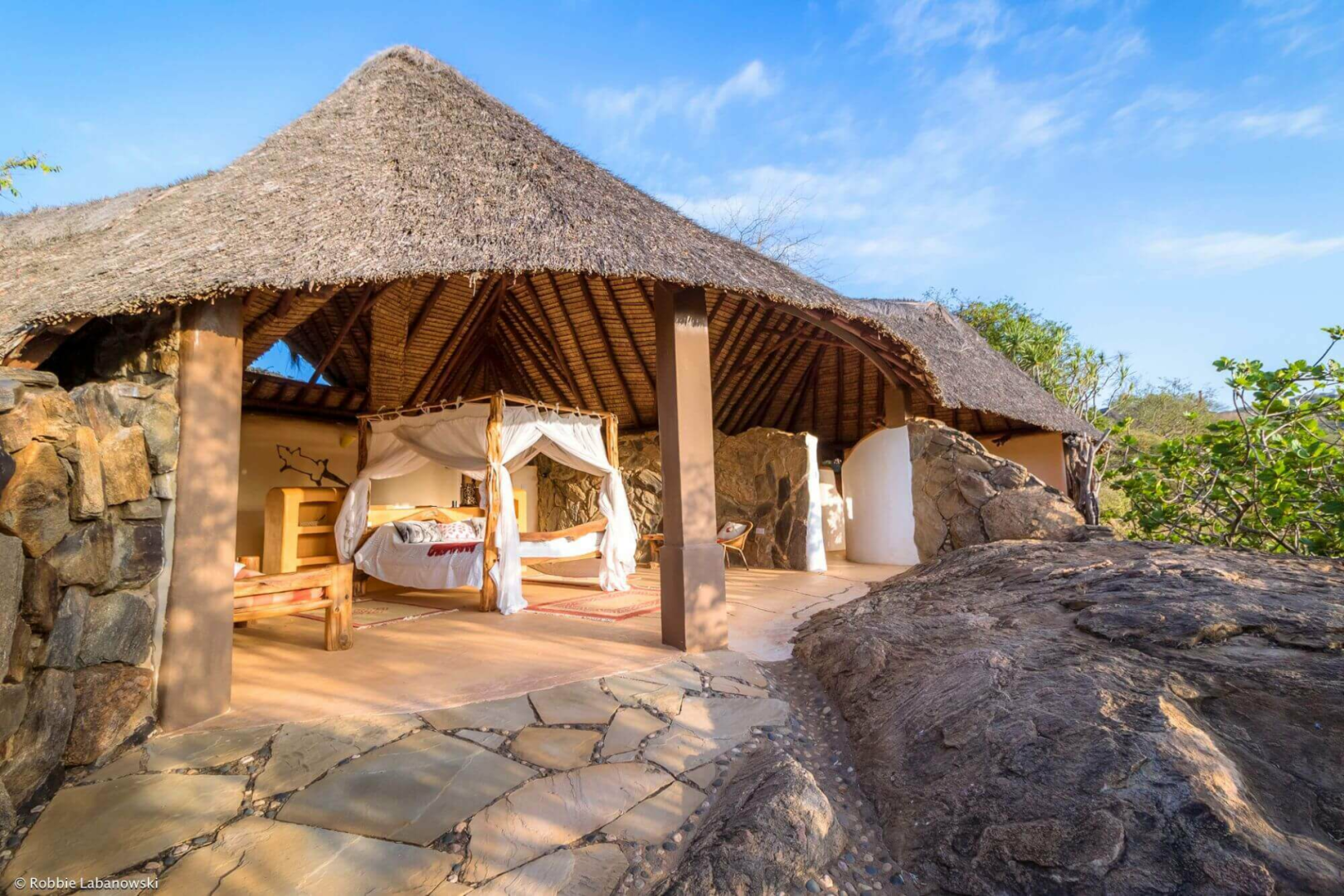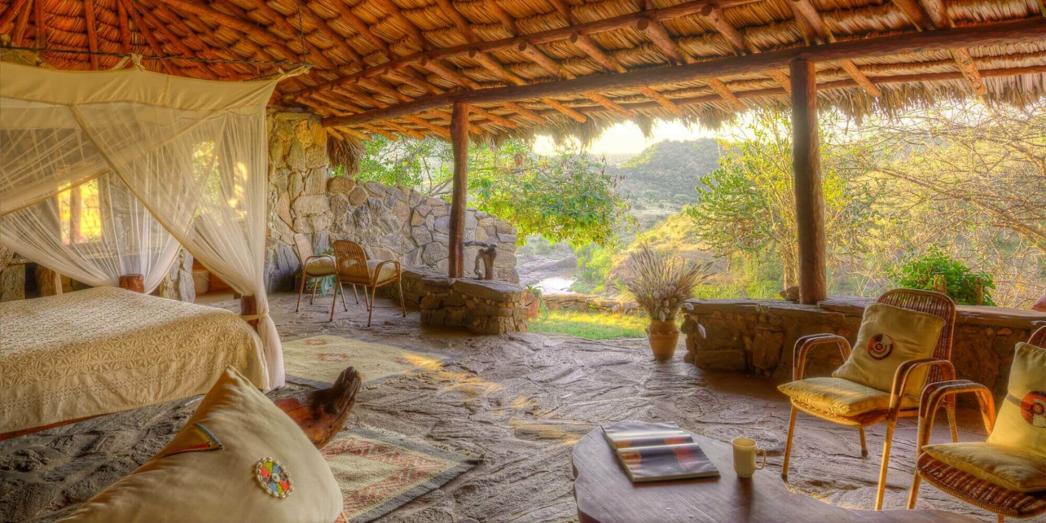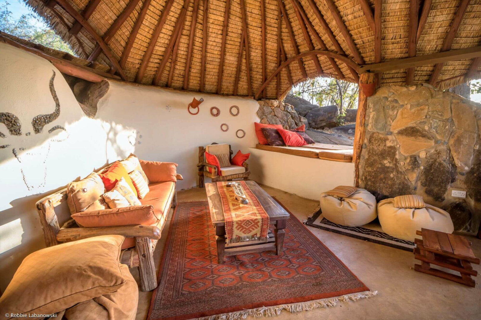 Gäste werden in insgesamt neun Stein-Cottages unter Reetdach untergebracht, die sich perfekt in die Landschaft einbetten und einen tollen Blick zum Fluss ermöglichen. Jedes Cottage weist ein anderes Baudesign auf. Viele der Cottages sind mit Betten auf Rädern ausgestattet, die auf Wunsch nachts auf die Terrasse gezogen werden können, um so unter dem Sternenhimmel zu schlafen. Fast alle Cottages haben einen großartigen Blick vom Badezimmer aus. Gemeinsam ist die sehr rustikale Einrichtung mit Steinboden und Steinwänden, offener Vorderseite und Veranda. Hier wurden Stein und Reet auf einer sehr natürlichen Weise miteinander kombiniert hat, um in der trockenen Landschaft nicht aufzufallen. Zwei neuere Cottages setzen modernere Akzente in der Einrichtung, mit poliertem Betonboden und verputzten cremefarbigen Wänden.