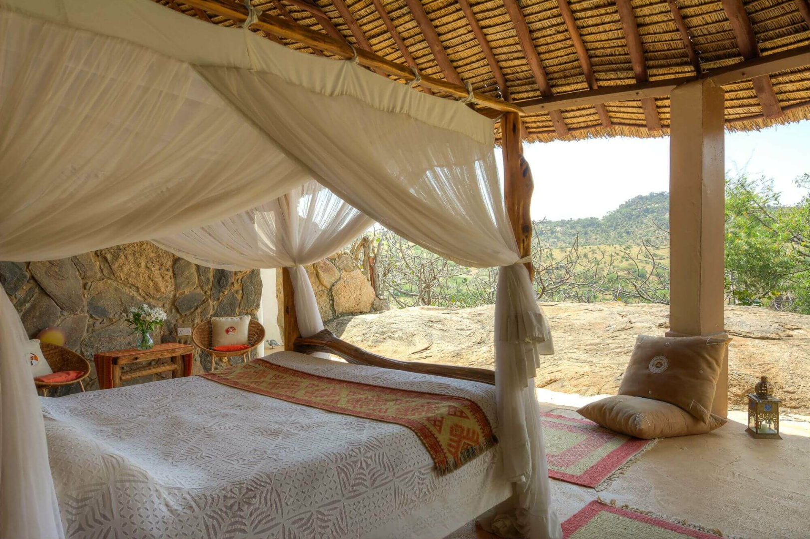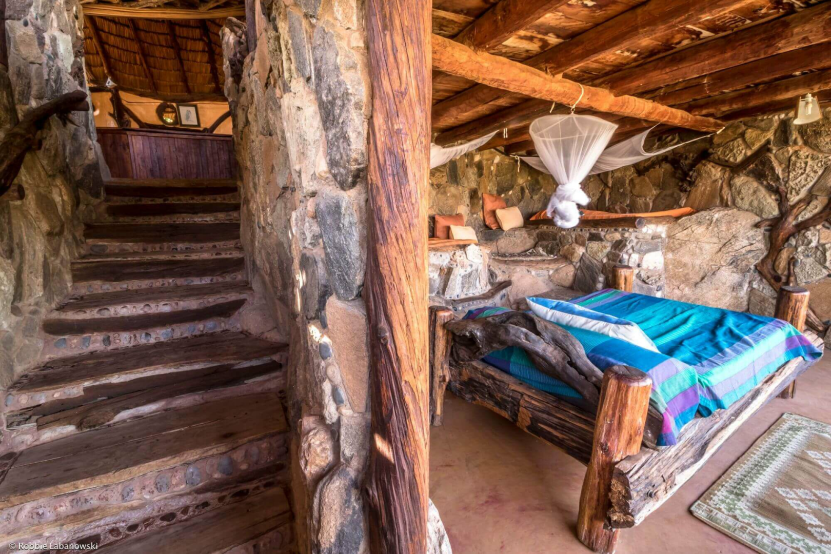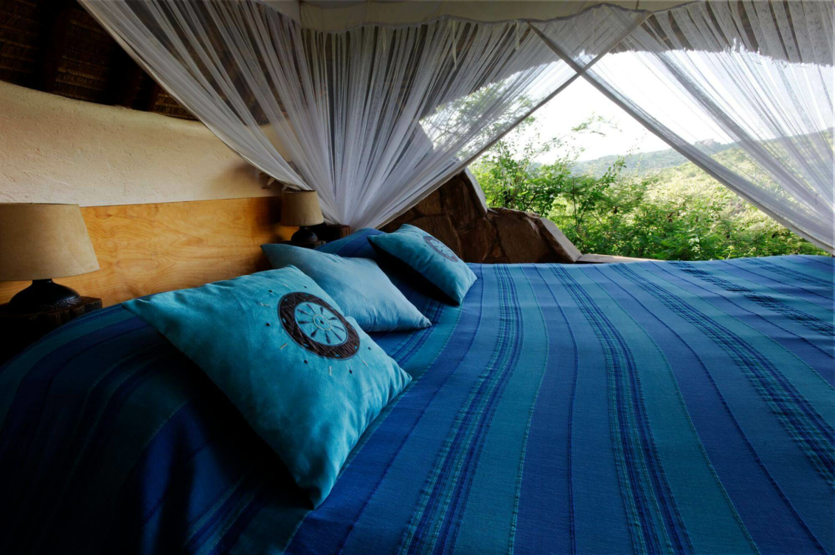 Gäste werden in insgesamt neun Stein-Cottages unter Reetdach untergebracht, die sich perfekt in die Landschaft einbetten und einen tollen Blick zum Fluss ermöglichen. Jedes Cottage weist ein anderes Baudesign auf. Viele der Cottages sind mit Betten auf Rädern ausgestattet, die auf Wunsch nachts auf die Terrasse gezogen werden können, um so unter dem Sternenhimmel zu schlafen. Fast alle Cottages haben einen großartigen Blick vom Badezimmer aus. Gemeinsam ist die sehr rustikale Einrichtung mit Steinboden und Steinwänden, offener Vorderseite und Veranda. Hier wurden Stein und Reet auf einer sehr natürlichen Weise miteinander kombiniert hat, um in der trockenen Landschaft nicht aufzufallen. Zwei neuere Cottages setzen modernere Akzente in der Einrichtung, mit poliertem Betonboden und verputzten cremefarbigen Wänden.