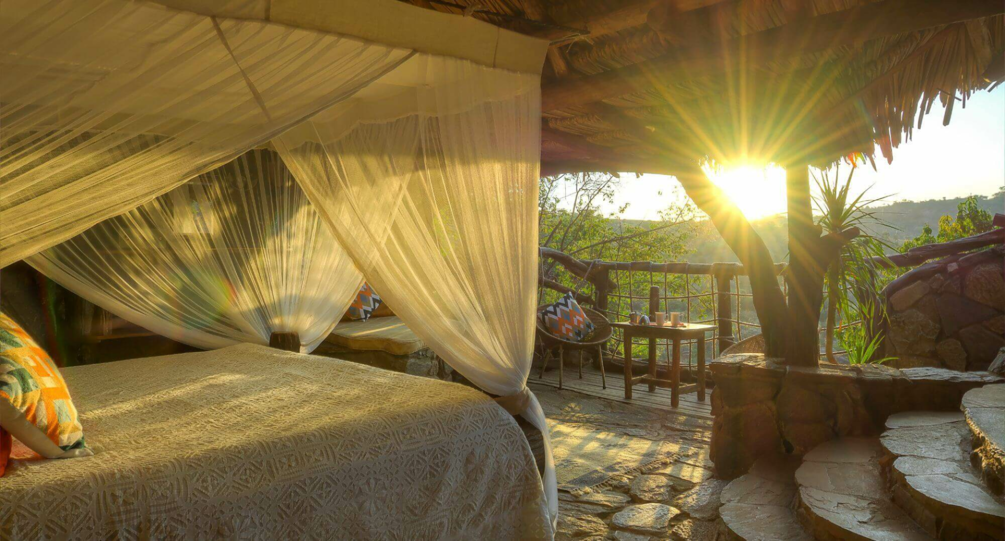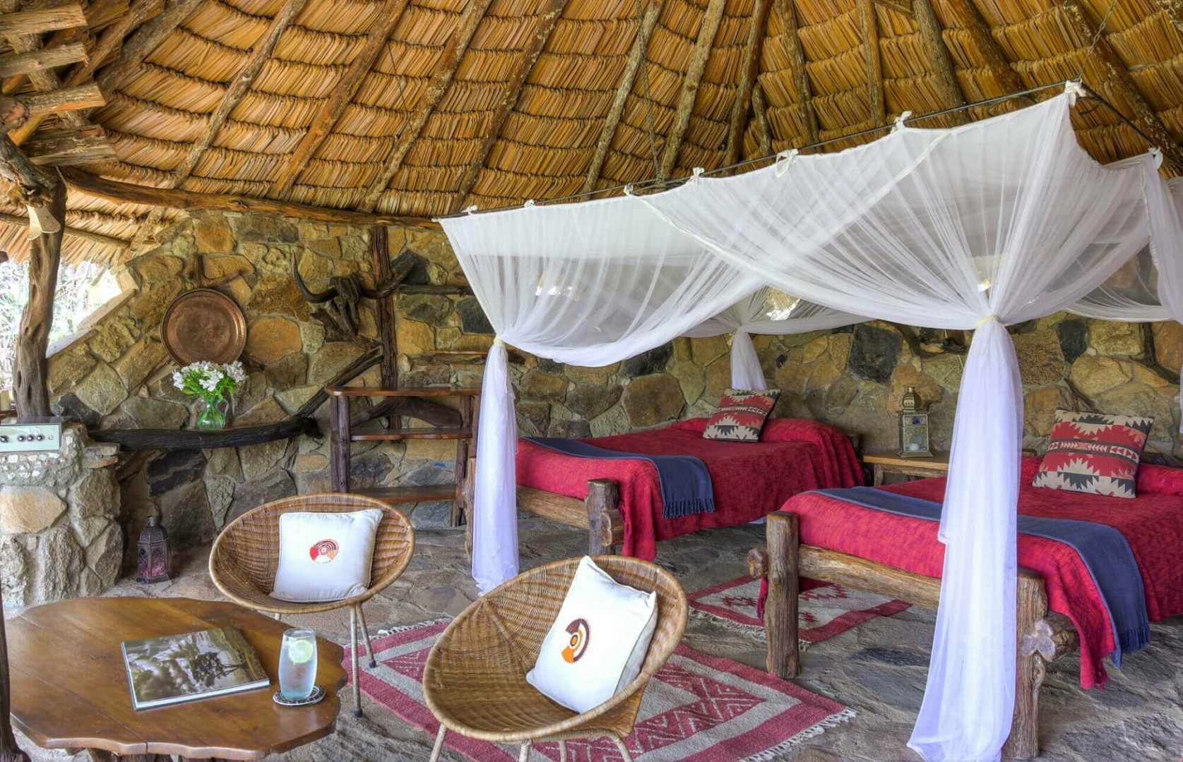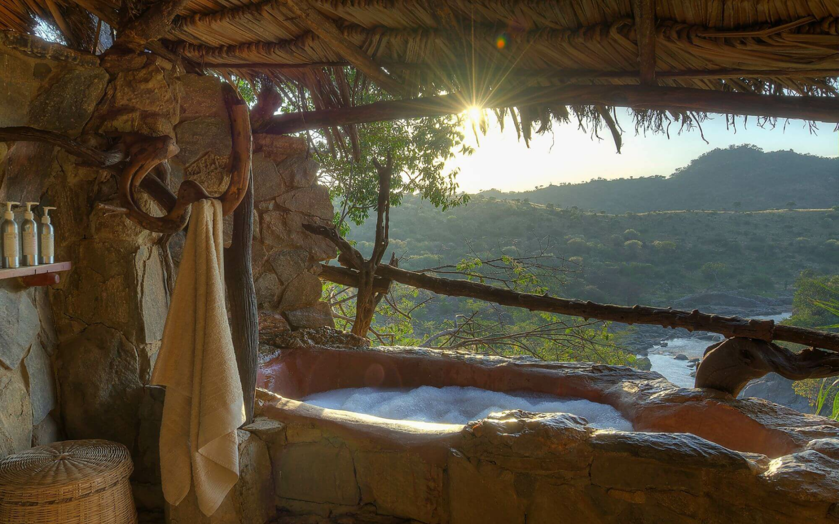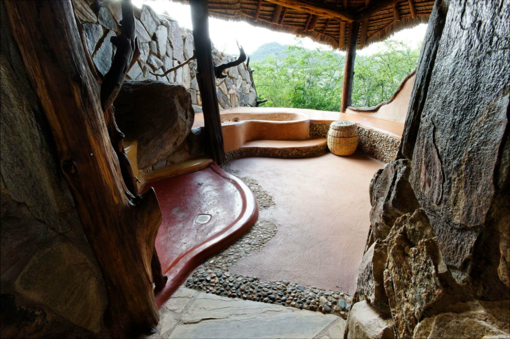 Gäste werden in insgesamt neun Stein-Cottages unter Reetdach untergebracht, die sich perfekt in die Landschaft einbetten und einen tollen Blick zum Fluss ermöglichen. Jedes Cottage weist ein anderes Baudesign auf. Viele der Cottages sind mit Betten auf Rädern ausgestattet, die auf Wunsch nachts auf die Terrasse gezogen werden können, um so unter dem Sternenhimmel zu schlafen. Fast alle Cottages haben einen großartigen Blick vom Badezimmer aus. Gemeinsam ist die sehr rustikale Einrichtung mit Steinboden und Steinwänden, offener Vorderseite und Veranda. Hier wurden Stein und Reet auf einer sehr natürlichen Weise miteinander kombiniert hat, um in der trockenen Landschaft nicht aufzufallen. Zwei neuere Cottages setzen modernere Akzente in der Einrichtung, mit poliertem Betonboden und verputzten cremefarbigen Wänden.