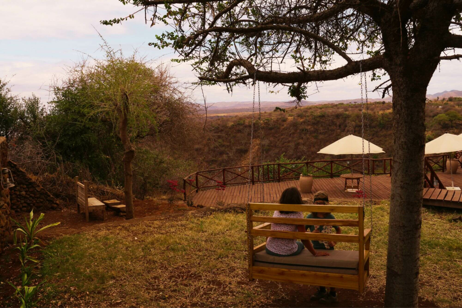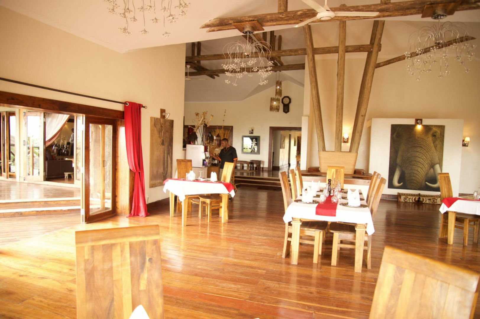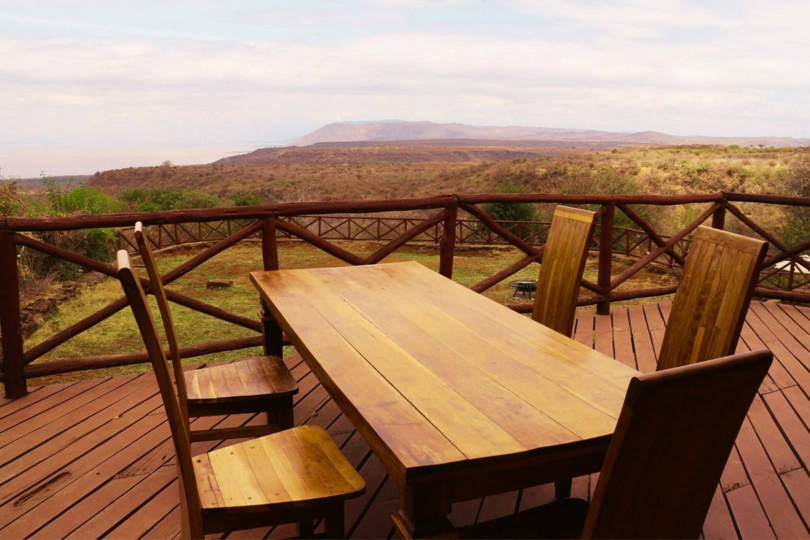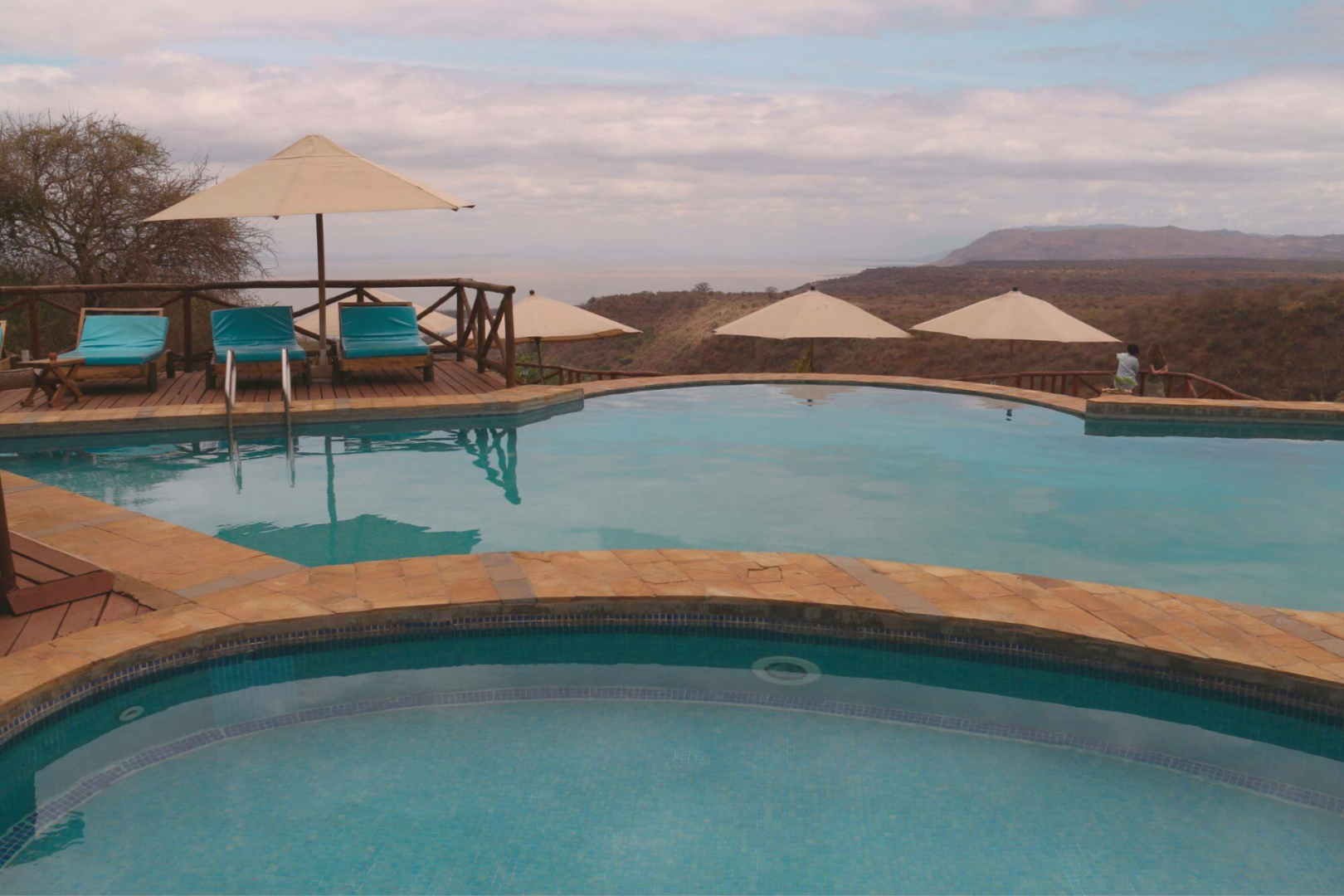Die Lodge liegt majestätisch über dem ostafrikanischen Tal mit herrlichem Blick auf den Manyara-See und seinen grünen, dichten Wald, der sich am Ufer ausbreitet. Die Lodge ist wunderschön gestaltet mit einem großzügigen Haupthaus, das an ein Herrenhaus aus der Kolonialzeit erinnert und sich nach der Rezeption und einem kleinen Kuriositätenladen zu einem großen, geräumigen Restaurant und einer Bar öffnet, die wiederum zu einer großen Terrasse führen, die sich auf zwei Ebenen erstreckt.
