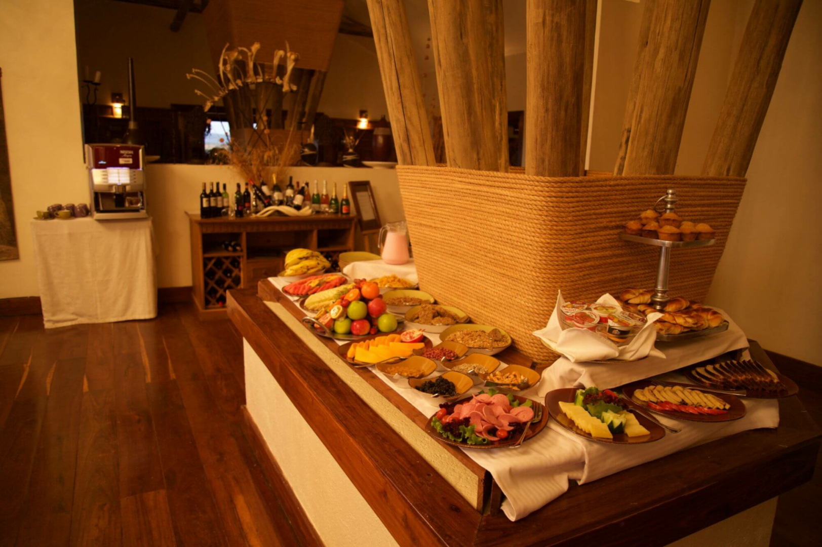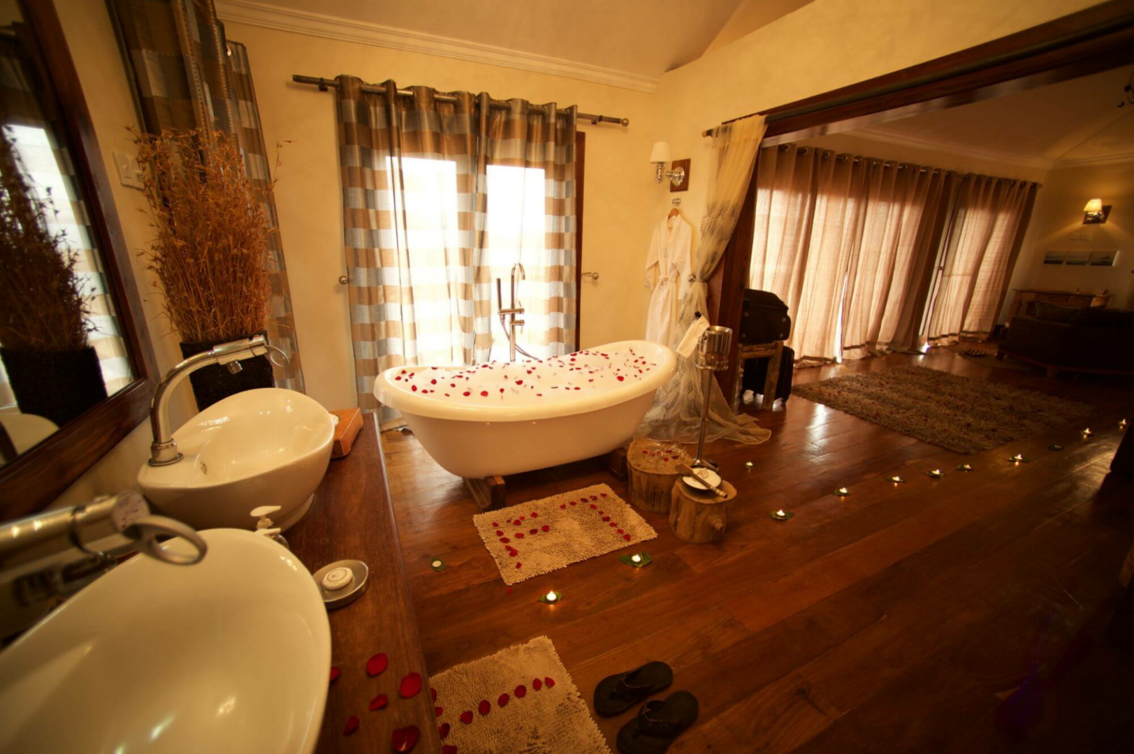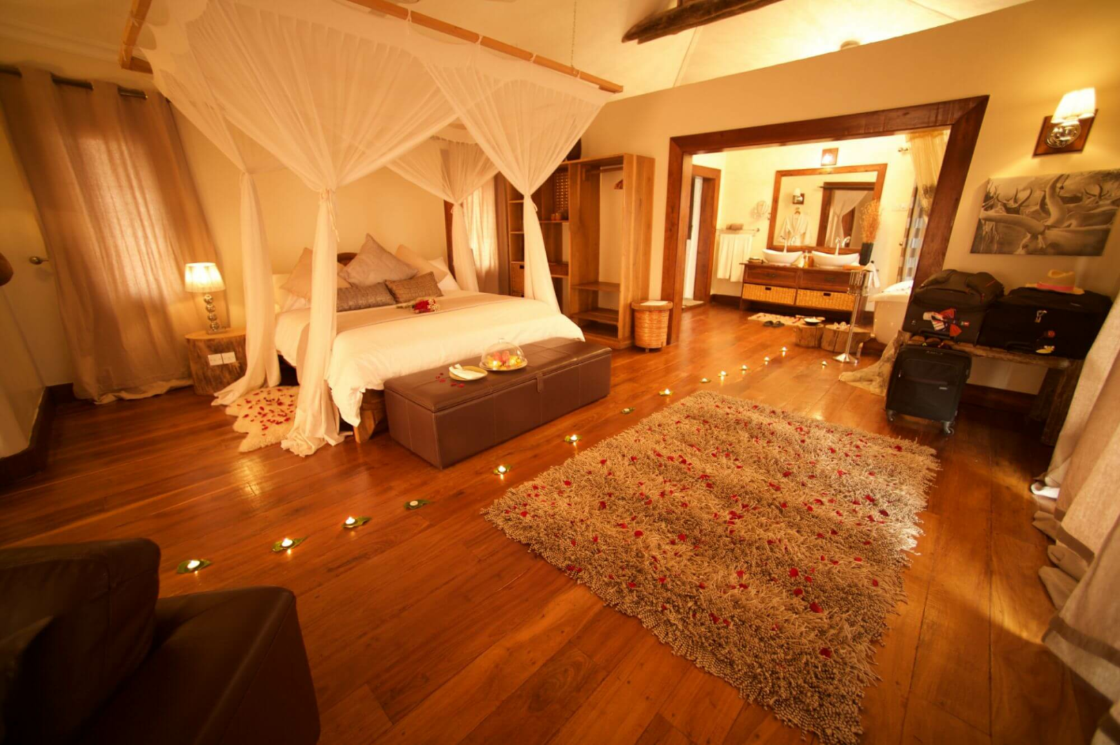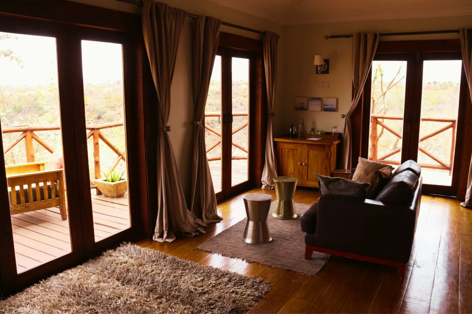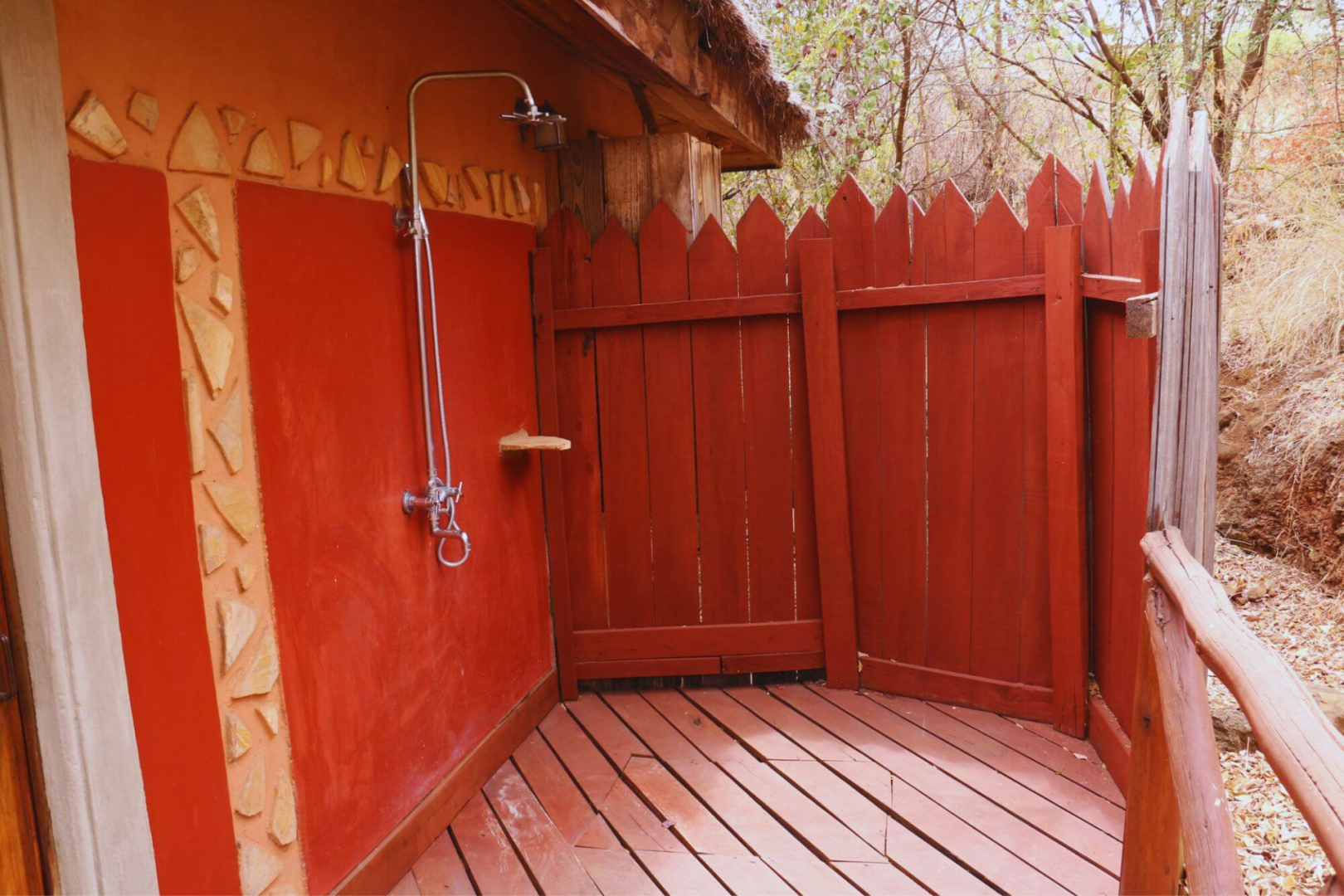 Die Gäste sind in insgesamt sechszehn Cottages rechts und links vom Haupthaus untergebracht, alle mit Blick auf die Schlucht mit atemberaubender Aussicht. Die Cottages sind groß und luftig und recht luxuriös ausgestattet mit einem wunderbaren Queensize-Bett, das direkt auf die fast vollständig abgeschirmte Wand gerichtet ist (ja, man kann die Aussicht fast wortwörtlich vom Bett aus genießen).