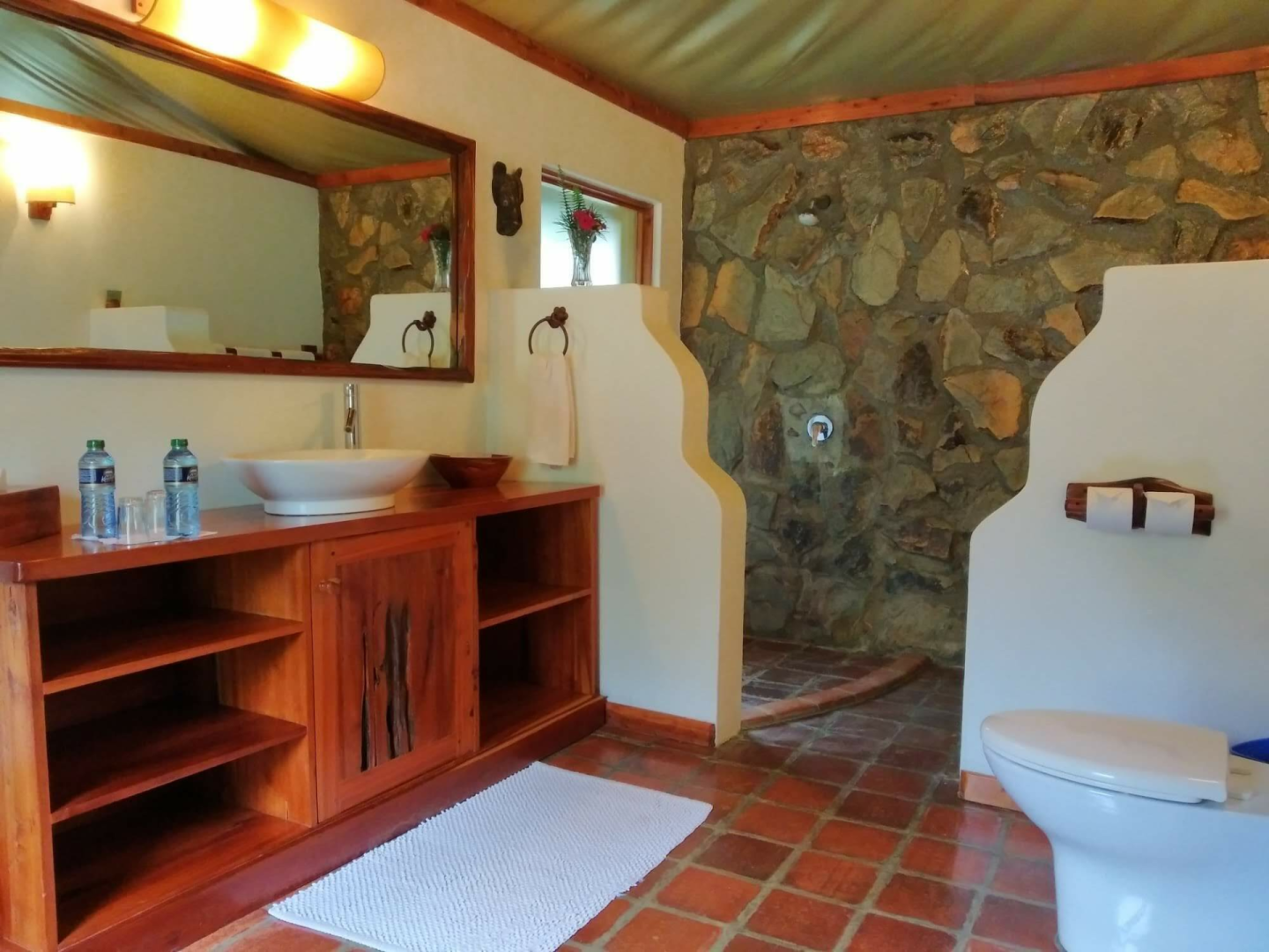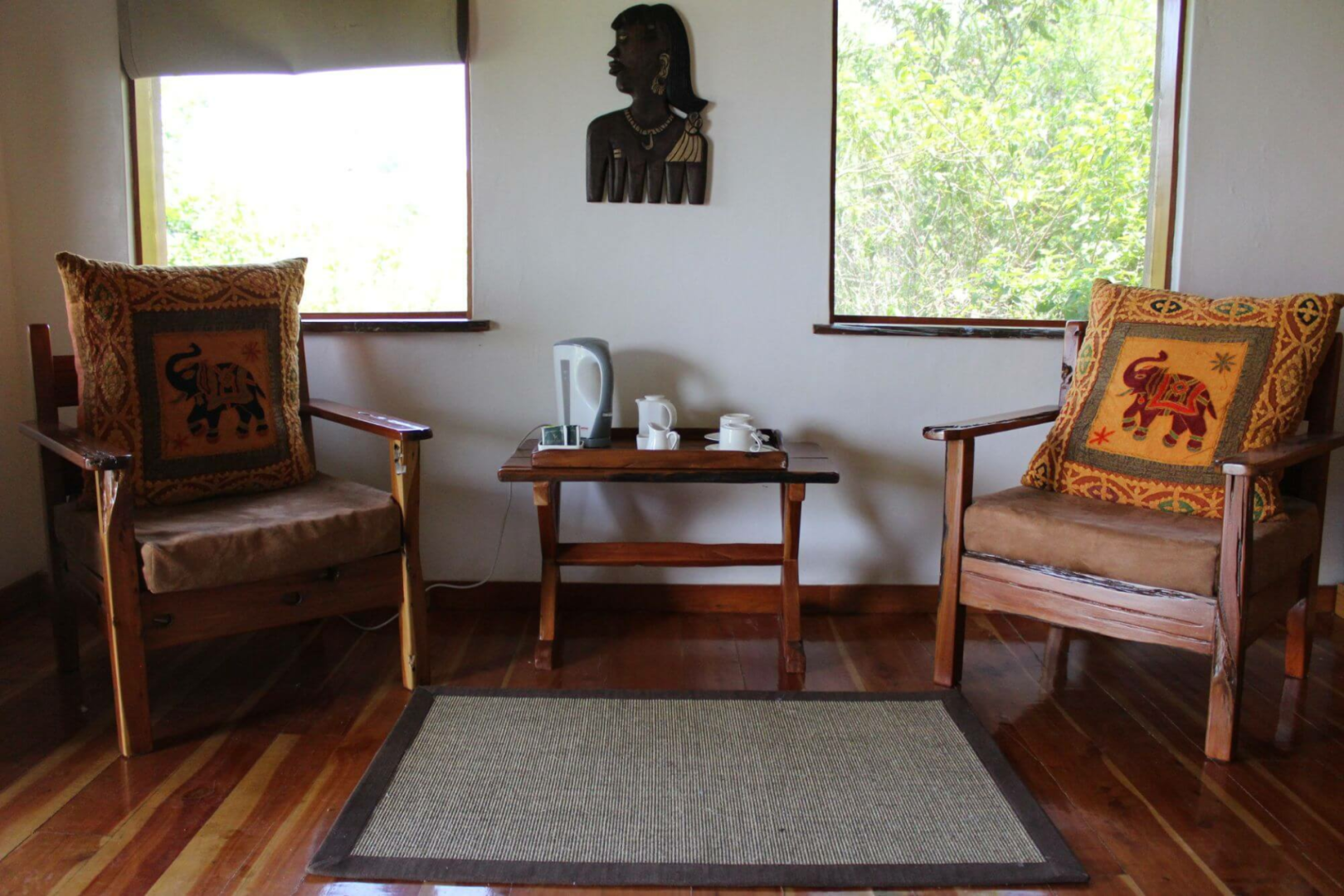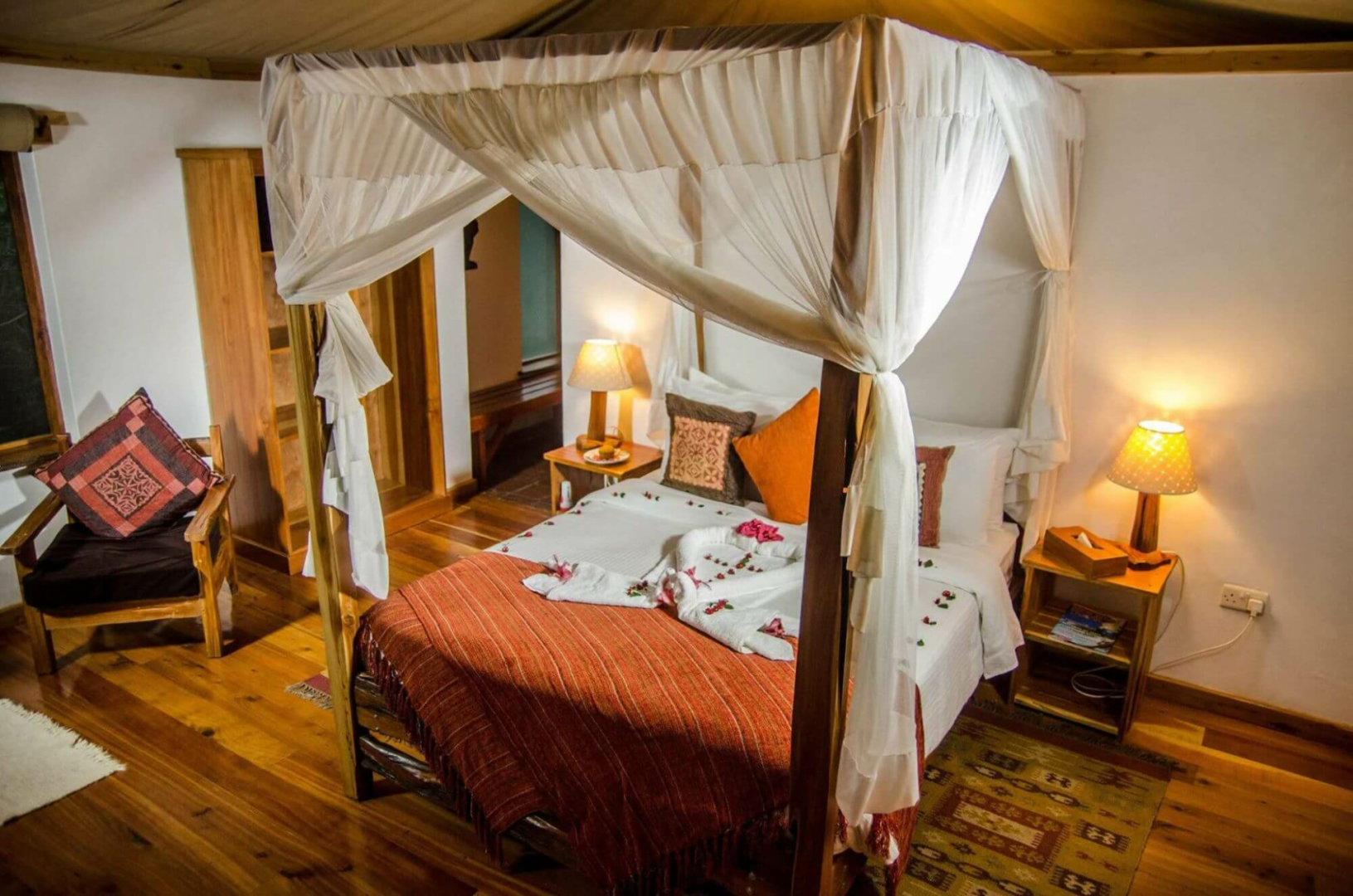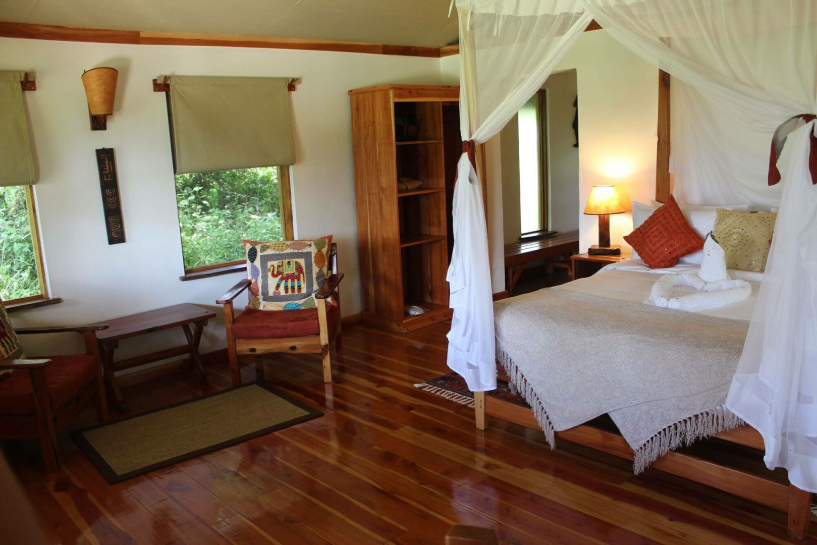 Die Gäste werden in insgesamt dreizehn frei stehenden Chalets unterschiedlicher Kategorien verteilt auf dem grün bepflanzten Gelände untergebracht. Durch die kleine Veranda mit zwei Regiestühlen betrifft man das Innere des Chalets. Durch die Holzbodenverkleidung, die weiß gestrichenen Wände und das große Polsterbett wirkt die Inneneinrichtung ziemlich elegant. Die drei Standardzelte sind deutlich einfacher. Ein Badezimmer mit Dusche ist natürlich vorhanden.