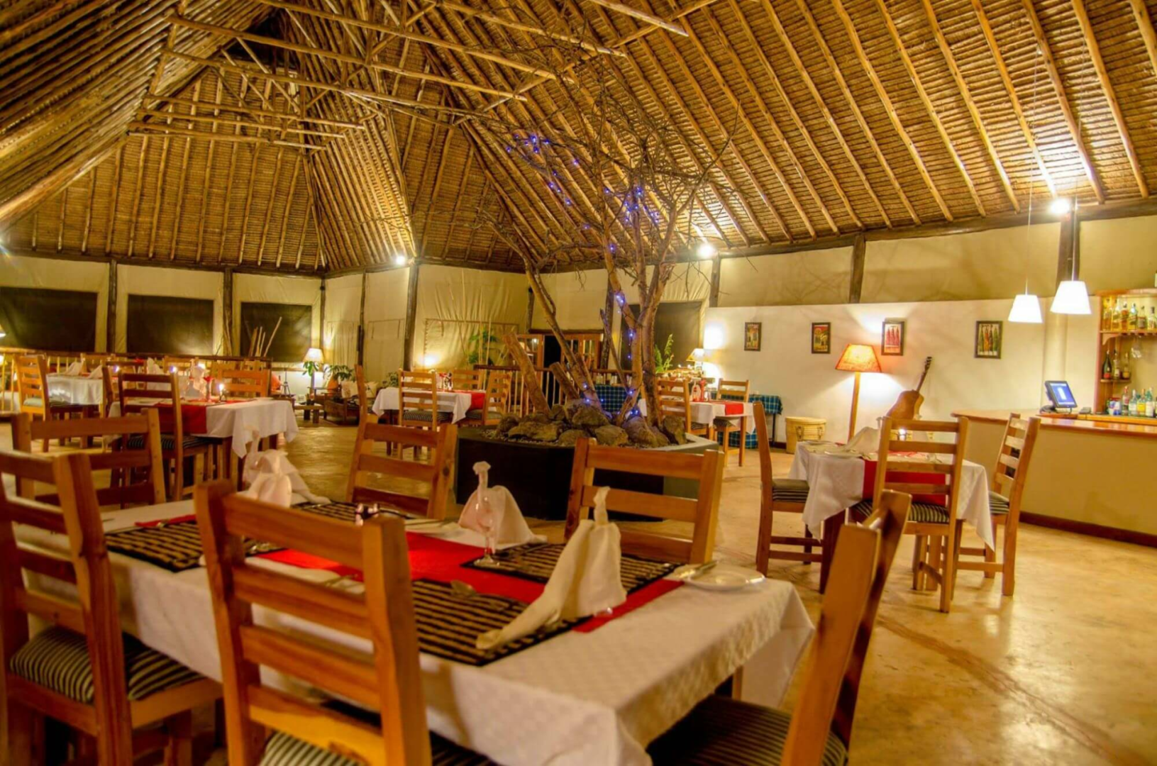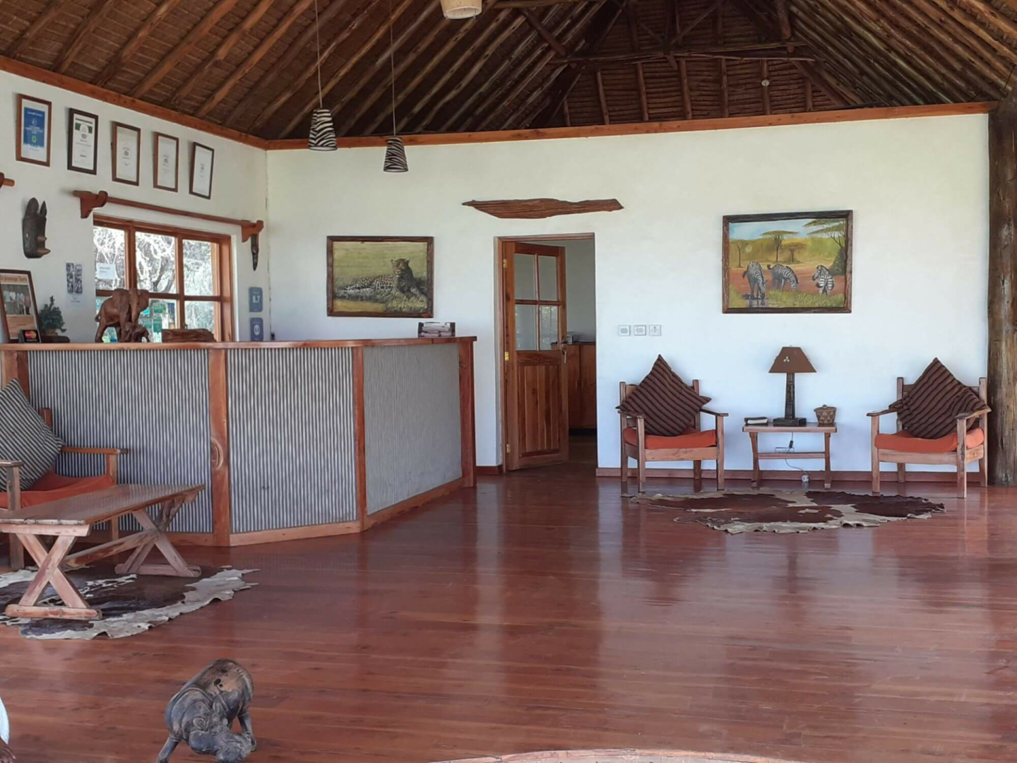 Das Hauptgebäude hat einen typischen Safarilodge-Charakter bestehend aus einem runden, an den Seiten offenen Bau unter Reetdach, in dem Bar und Lounge mit zahlr...