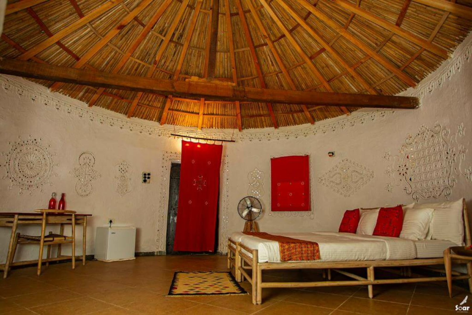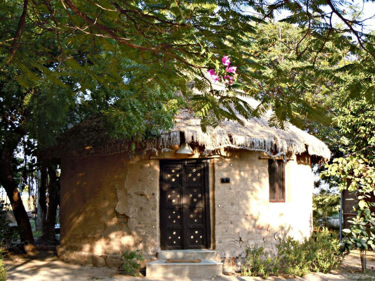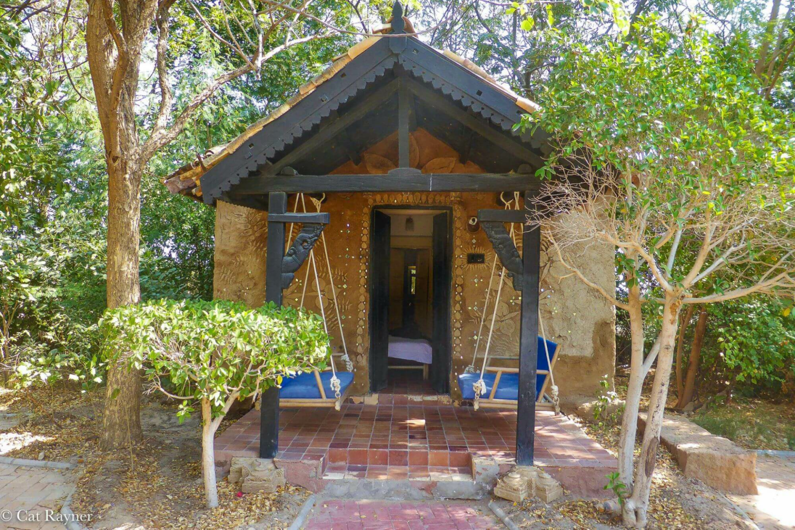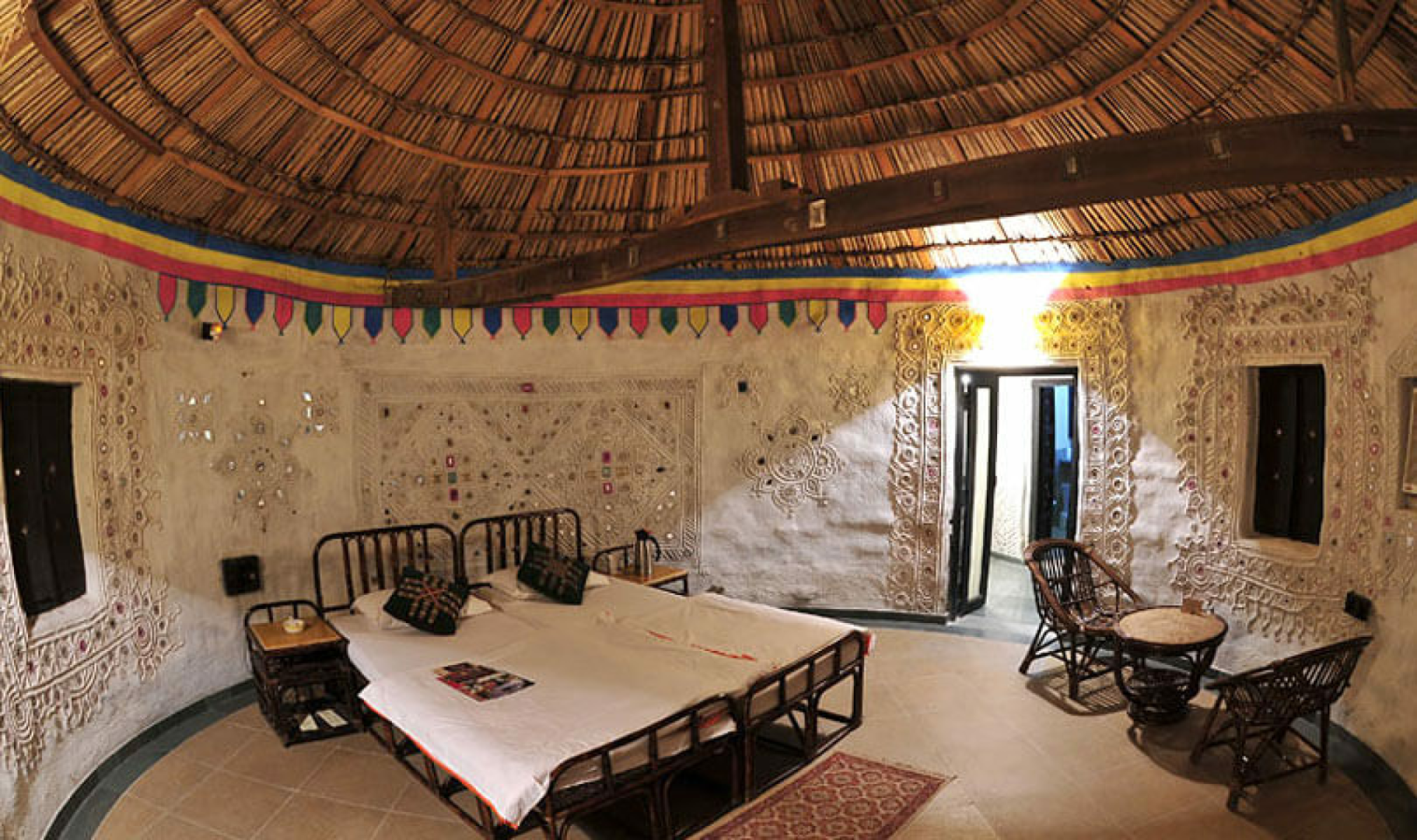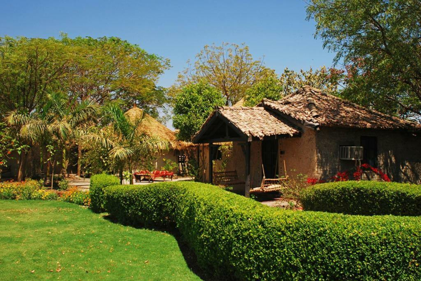 Die Unterbringung erfolgt in angenehm klimatisierten runden Hütten unter Reetdächern. Die Inneneinrichtung enthält hübsche traditionelle Elemente des Bajania-Volkes, was den sonst eher einfachen Bungalows einen gewissen Charme verleiht. Leider gibt es hier ernsthafte Probleme mit der Warmwasserversorgung. Da die Nachttemperaturen niedrig sind, ist warmes Wasser sehr wichtig. Die Bungalows liegen verstreut inmitten einer grünen Oase einer sonst kargen Landschaft. Es gibt einen kleinen, aber leider unbenutzbaren Pool. Abends unterhalten Tänzer des Rabari-Volkes die Gäste mit ihren Darbietungen.