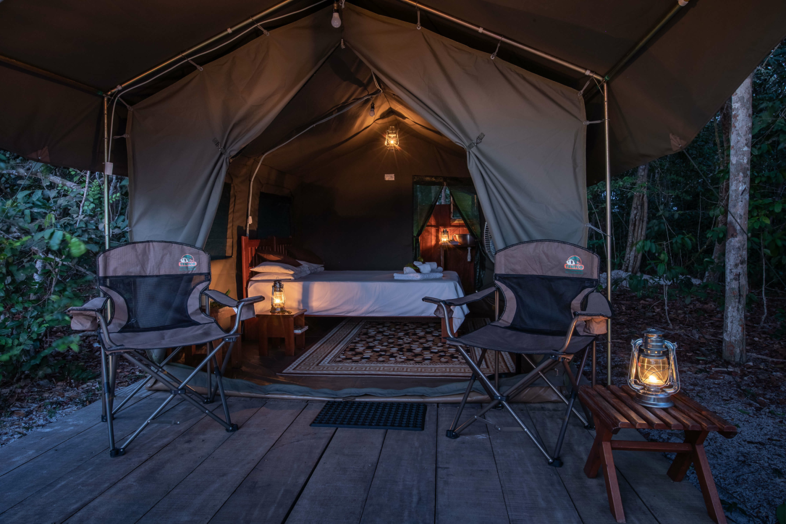 Es besteht aus nur fünf komfortablen Safarizelten, jedes mit zwei Einzelbetten, eigenem Bad mit (Außen-)Dusche, Waschbecken und Toilette, die auf einer Plattform mit privater Terrasse mit Blick auf den Fluss stehen. Die kleine Größe des Camps und seine Abgeschiedenheit machen es zu einem sehr ruhigen Ort, an dem man sich in der Mitte von Nirgendwo verloren fühlt.