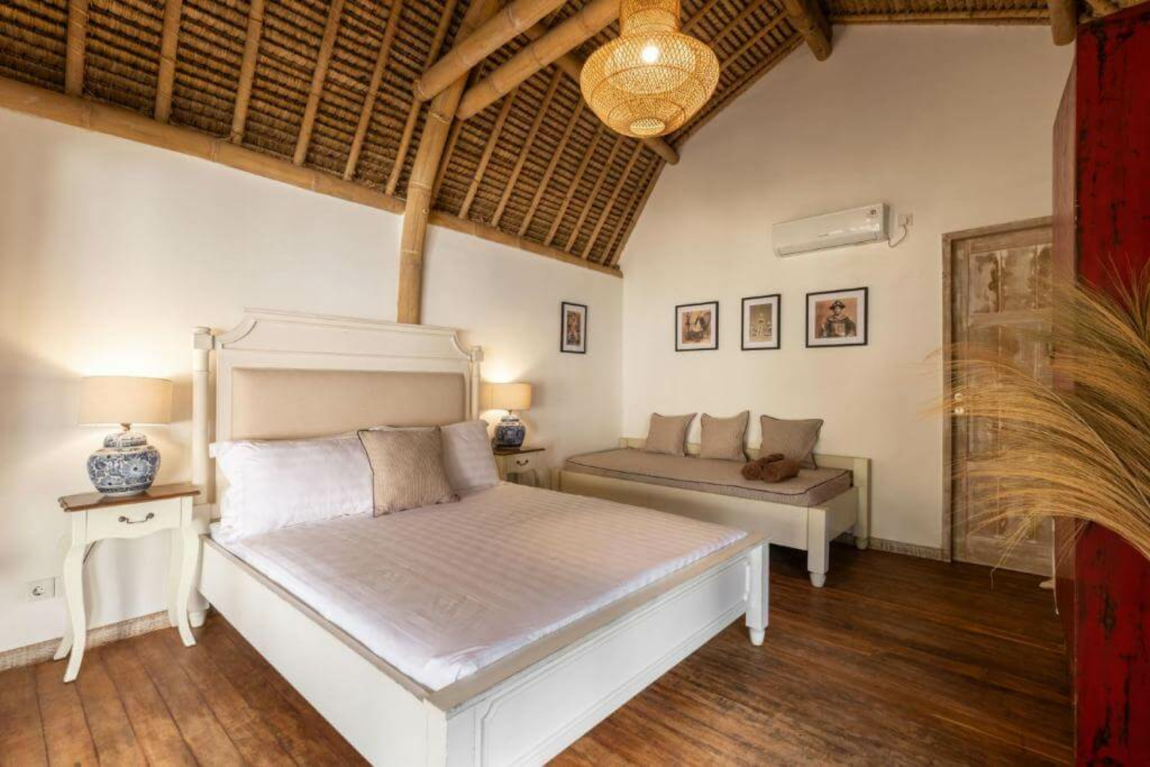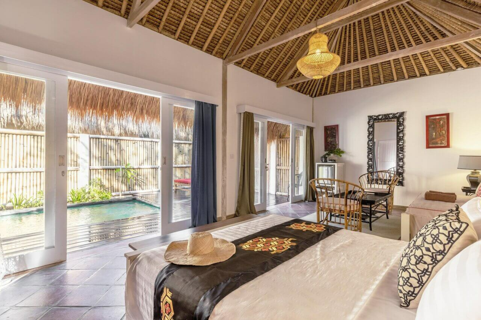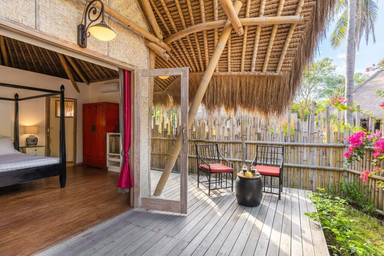 Das Hauptgebäude und die acht Gästevillen sind im schönen traditionellen Bambushütten-Stil gestaltet. Alle acht Villen sind charmant und exklusiv, mit natürlichen lokalen Materialien gebaut und mit einer Mischung aus asiatischem und kolonialem Stil mit viel Liebe zum Detail eingerichtet.