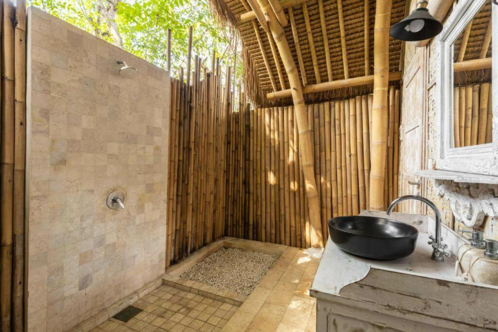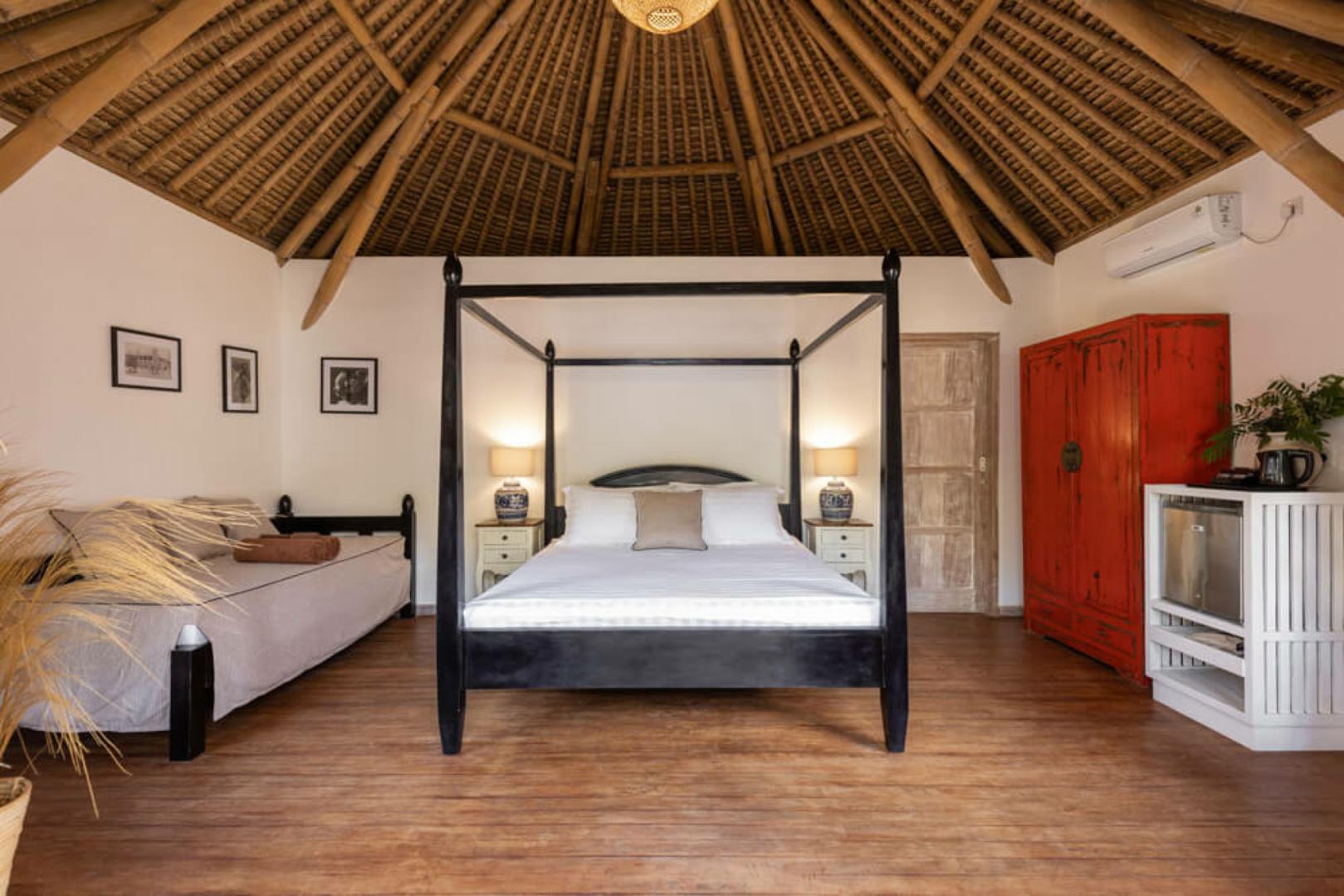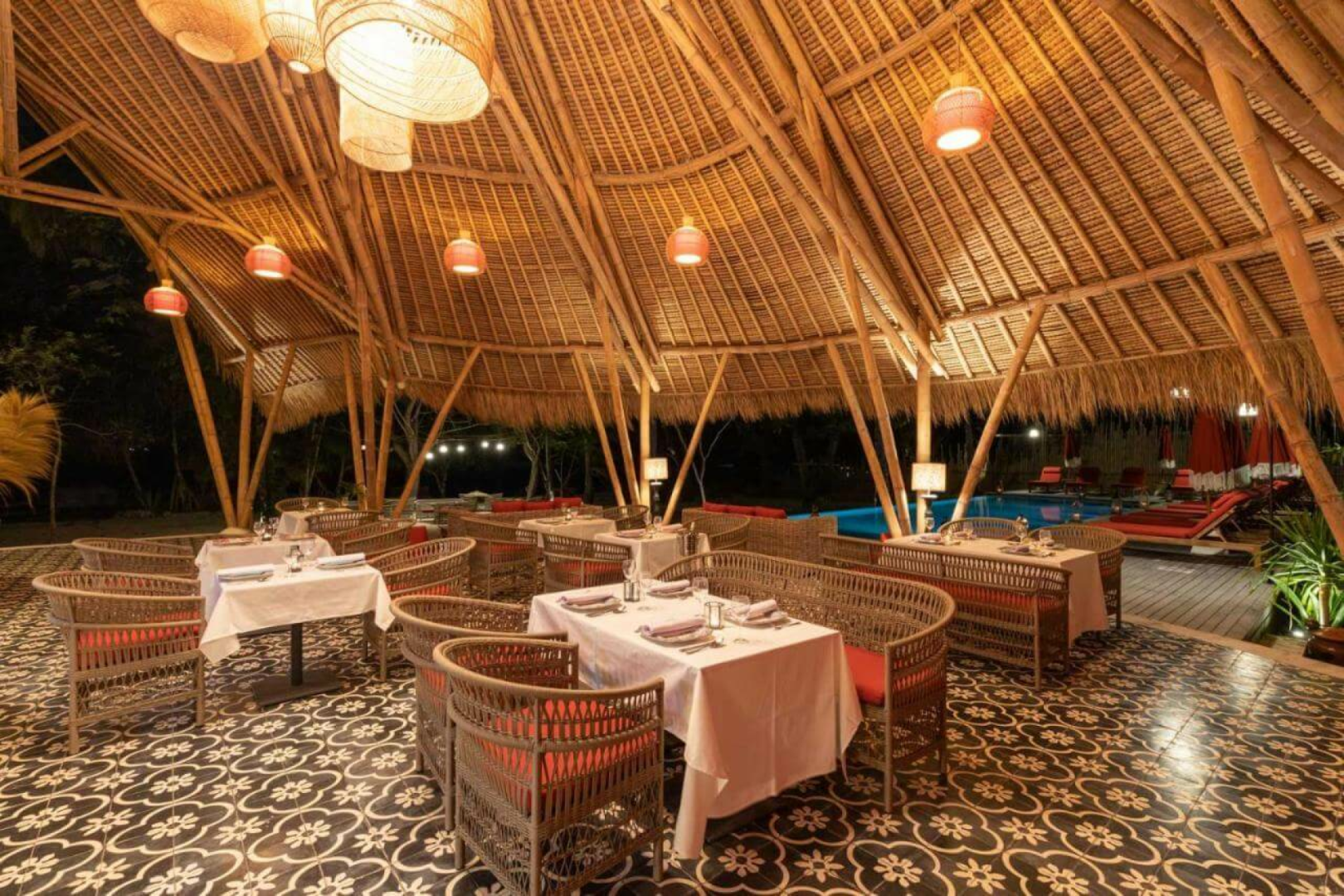 Das Hauptgebäude und die acht Gästevillen sind im schönen traditionellen Bambushütten-Stil gestaltet. Alle acht Villen sind charmant und exklusiv, mit natürlichen lokalen Materialien gebaut und mit einer Mischung aus asiatischem und kolonialem Stil mit viel Liebe zum Detail eingerichtet.