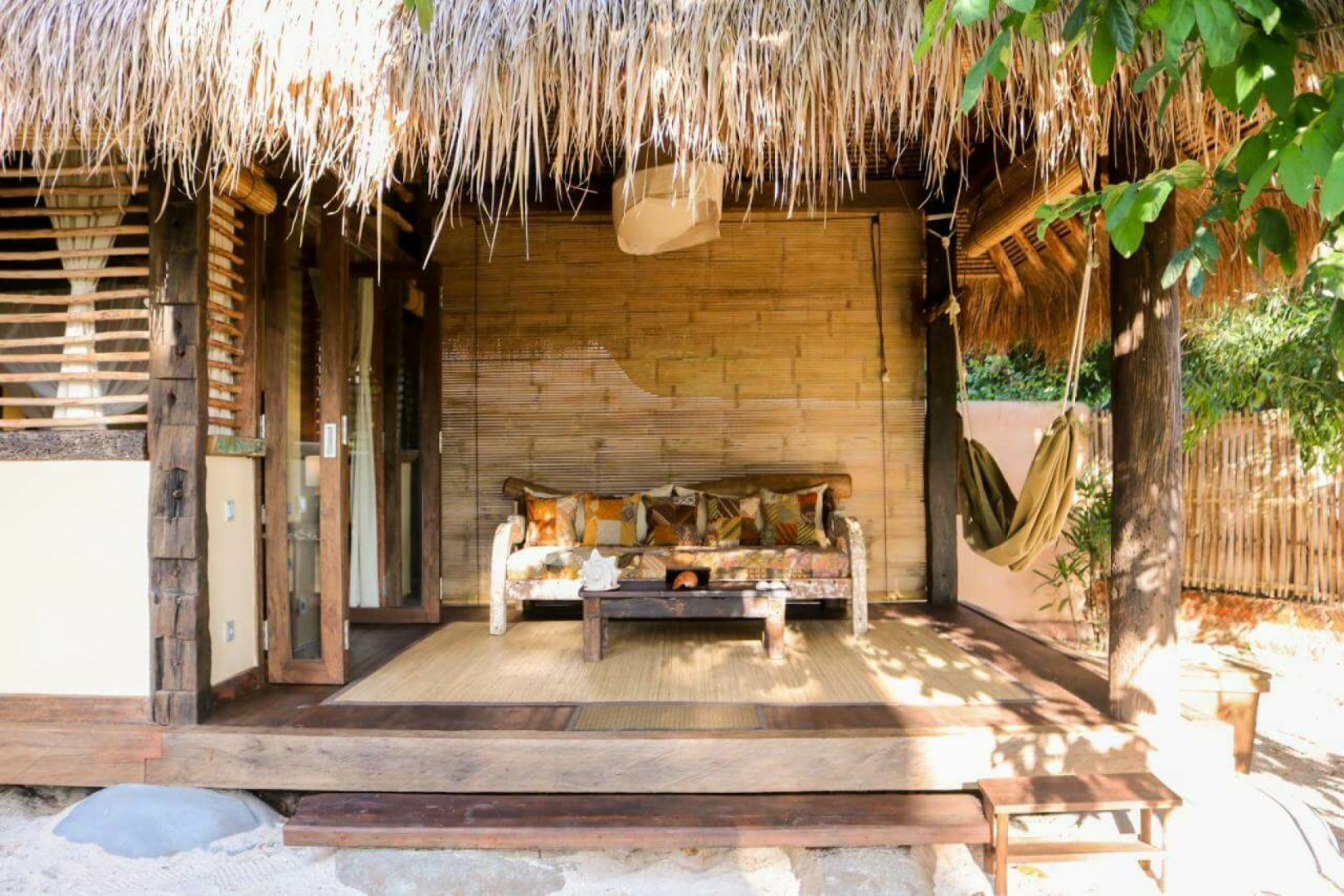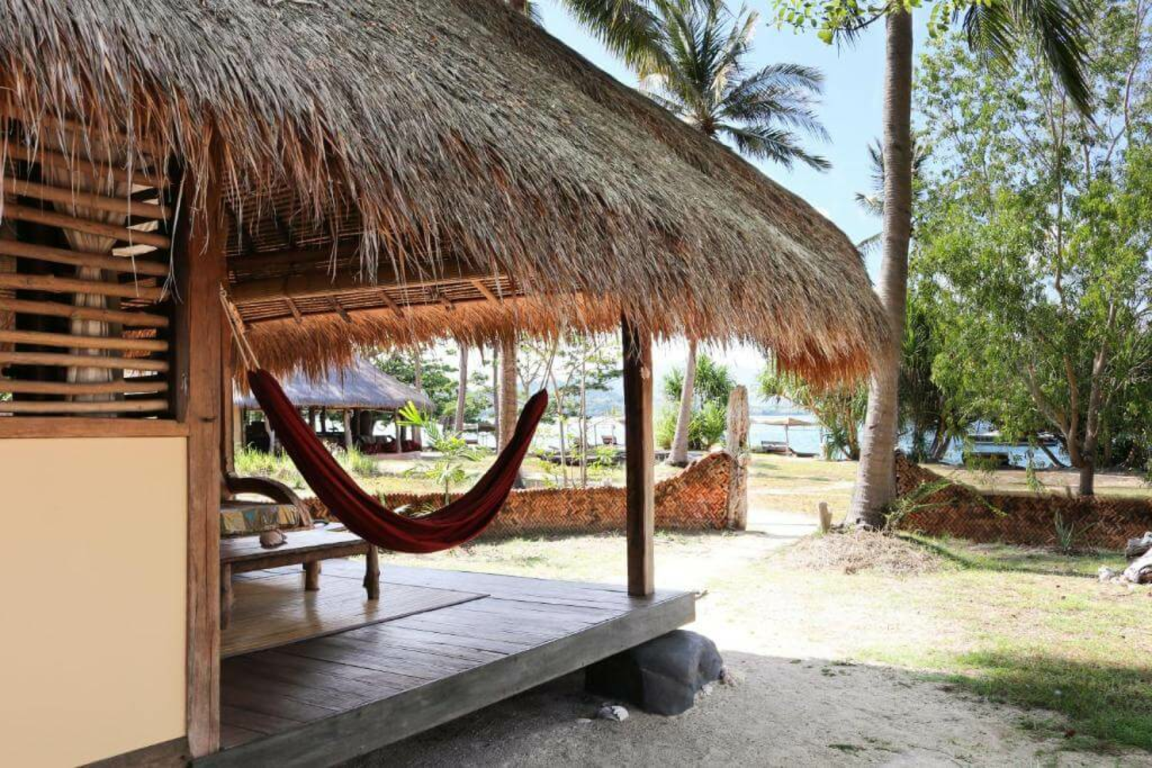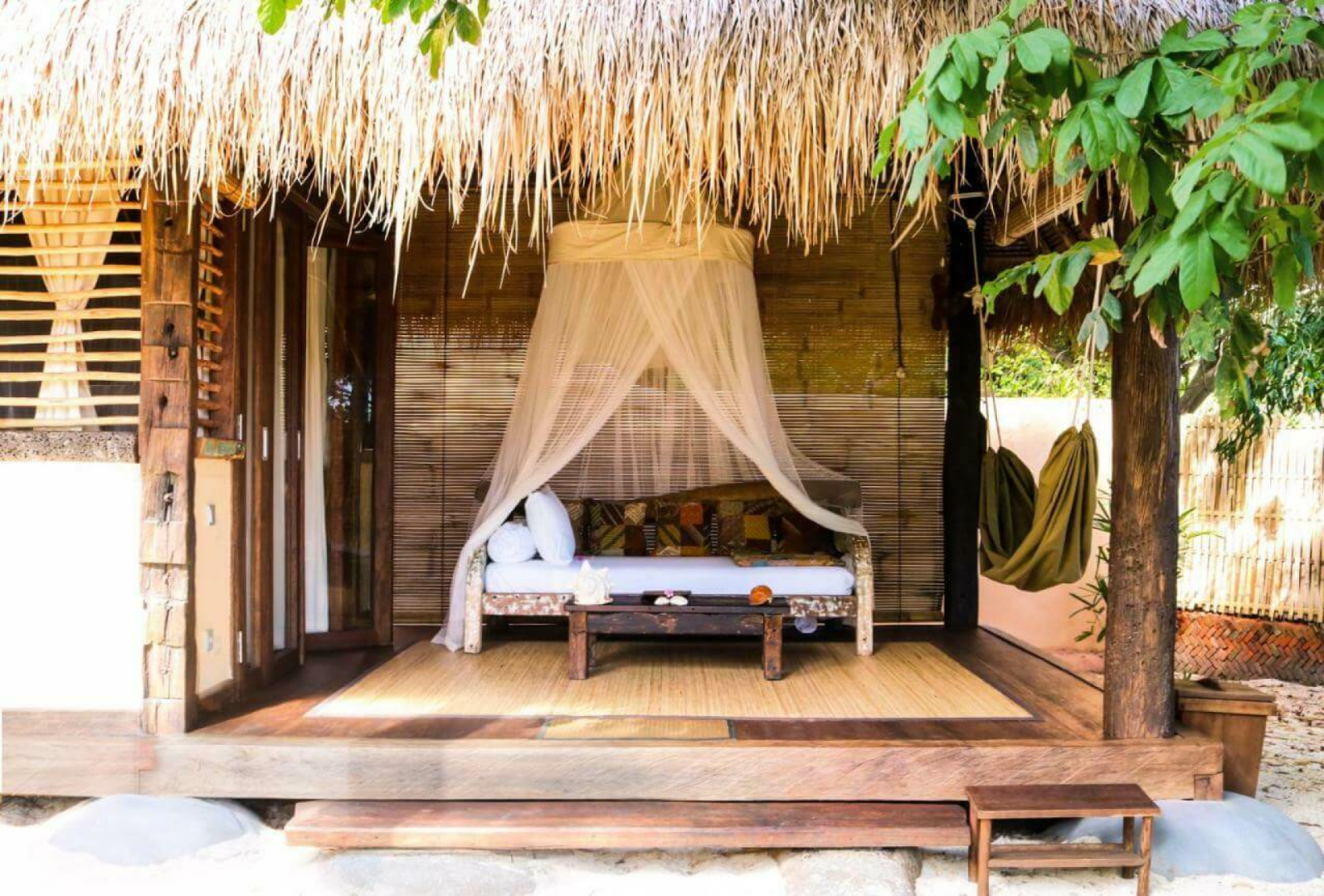 Die Gili Asahan Eco Lodge verfügt über insgesamt sechzehn einzigartige und private Bungalows, die an einem wunderschönen Strand mit einem vielfältigen Korallenriff direkt vor der Haustür liegen. Die Bungalows sind sehr sauber, sehr gut ausgestattet, geräumig, mit einem privaten Gartenbereich, in dem es eine Dusche und Toilette sowie ein Waschbecken gibt. Ein kleines Sofa und eine Hängematte runden das Bild ab.
