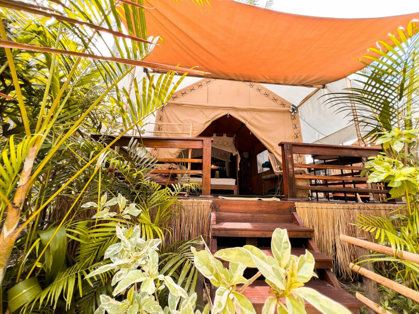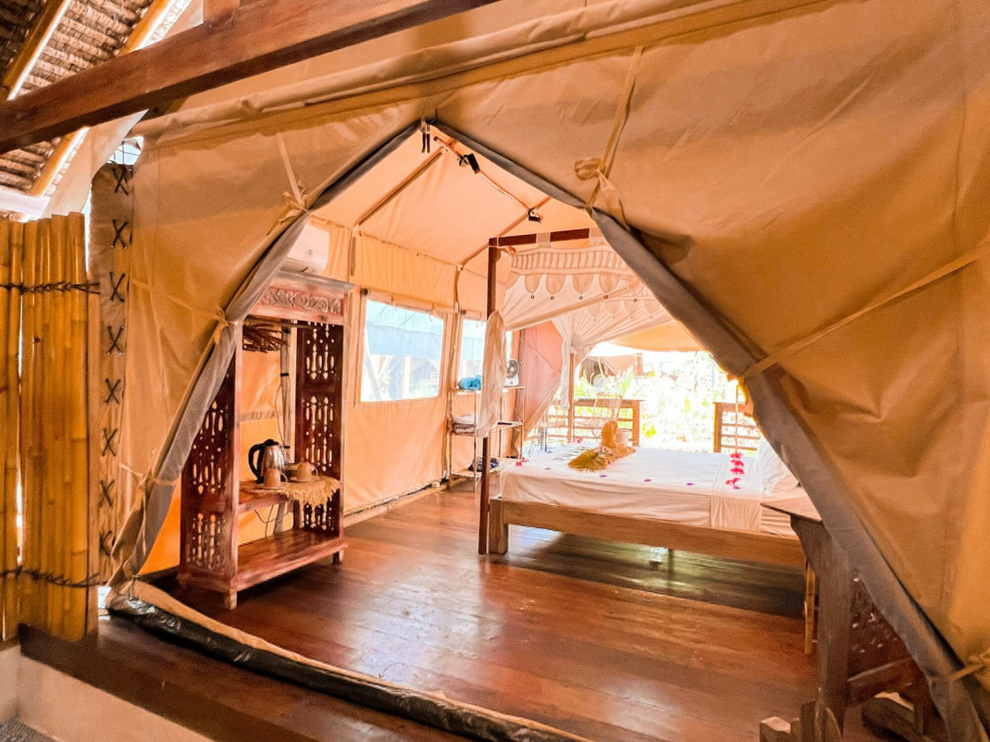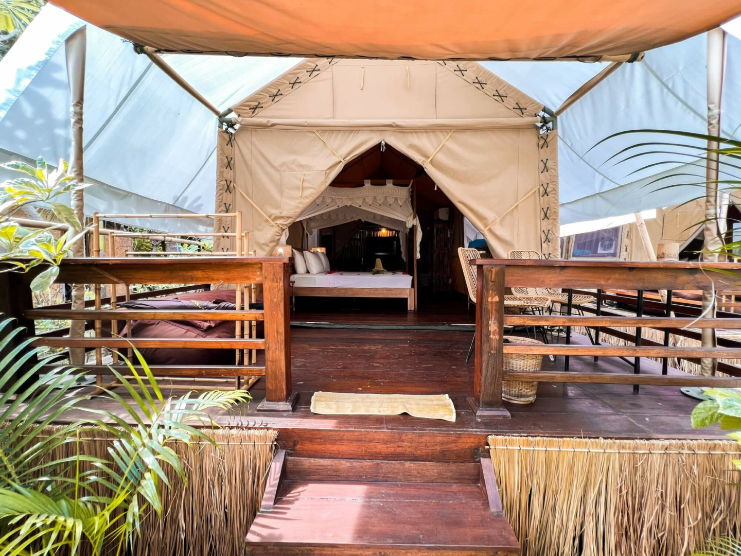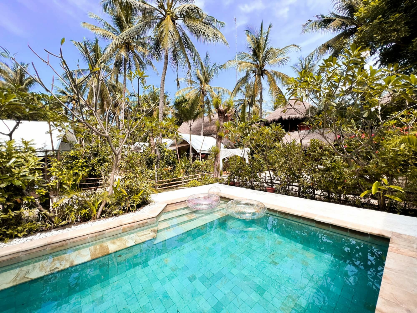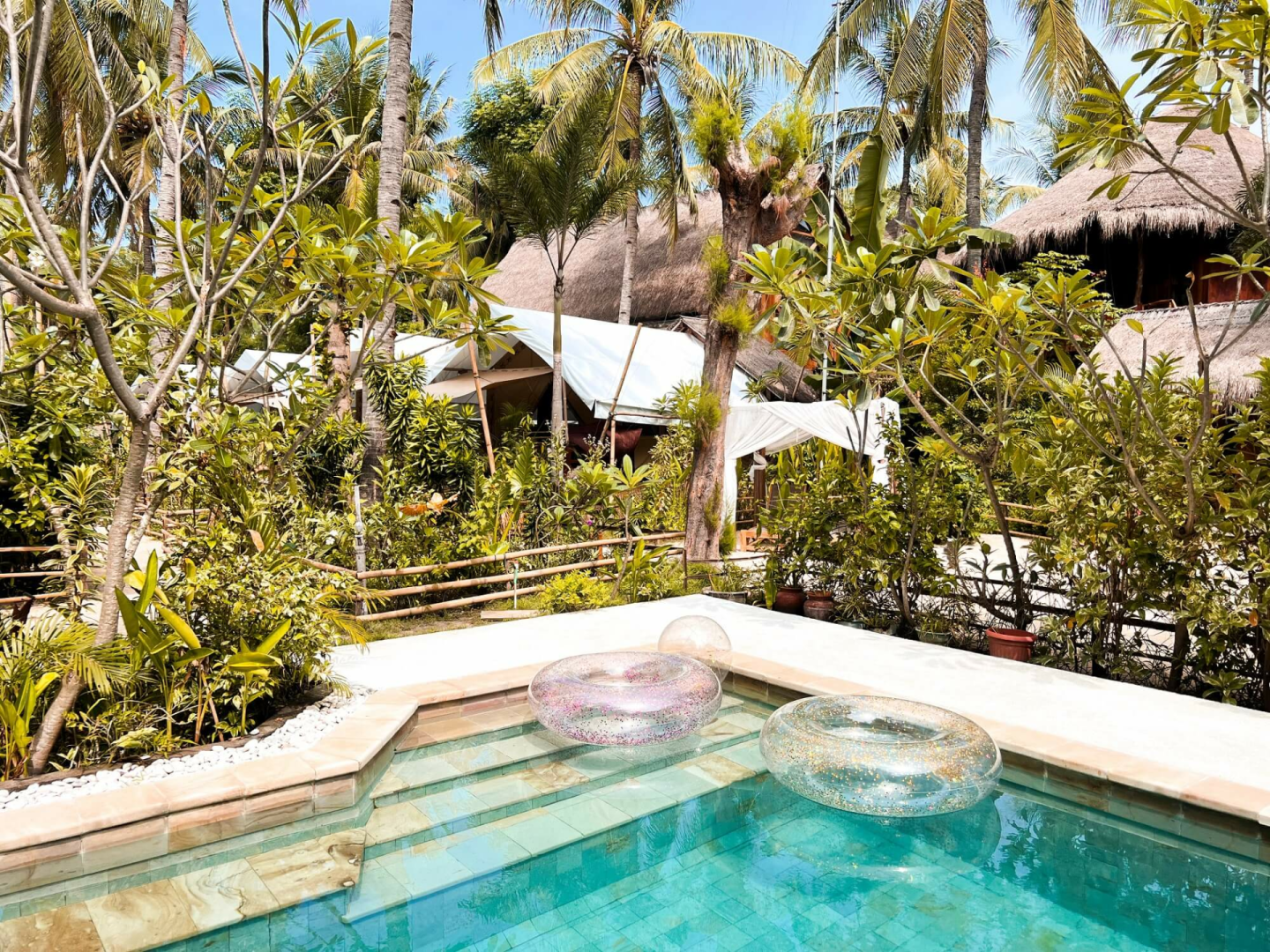 La Cocoteraie Ecolodge ist eine gemütlicher kleine Lodge mit etwa 10 klimatisierten Zelten in einer Kokosnussplantage auf der ruhigen Seite von Gili T. Es bietet eines der absolut besten Glamping-Erlebnisse weit und breit. Ihr wohnt in charmanten, geräumigen Zelten, die mit bequemen Betten, Klimaanlage, Haartrockner, Teekanne, Kaffee- und Teekocher und Bad ausgestattet sind. Die Lodge verfügt über einen schönen Poolbereich, ein Restaurant und eine Bar, alle wunderschön gestaltet.