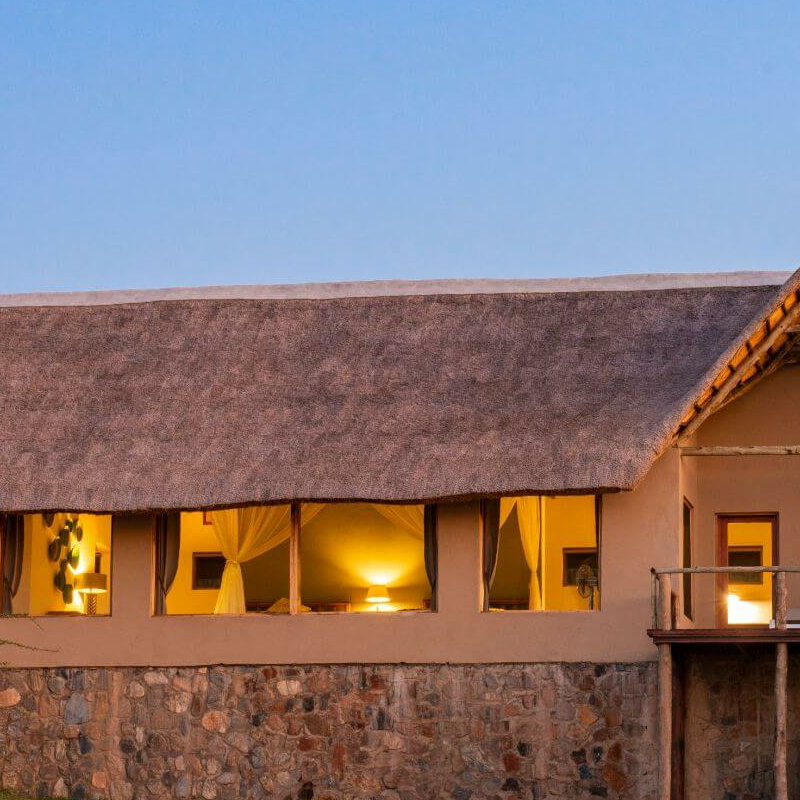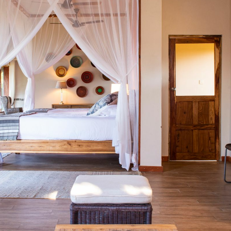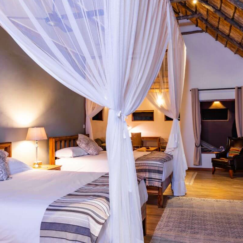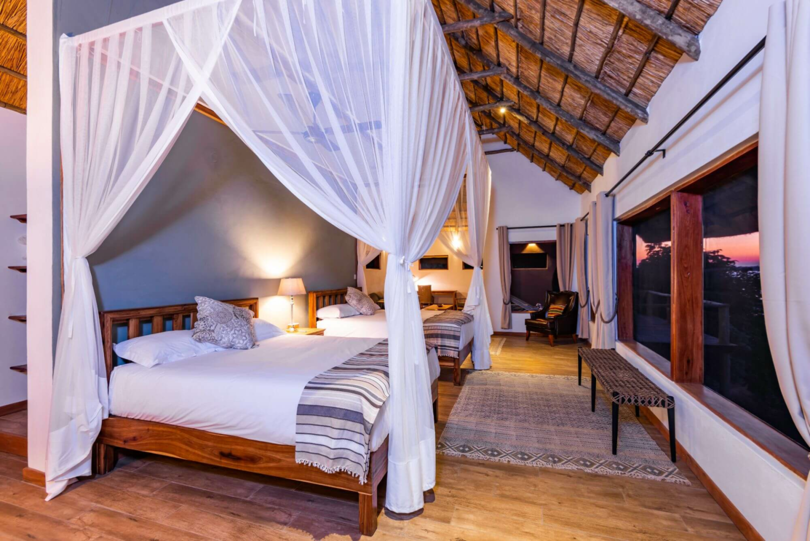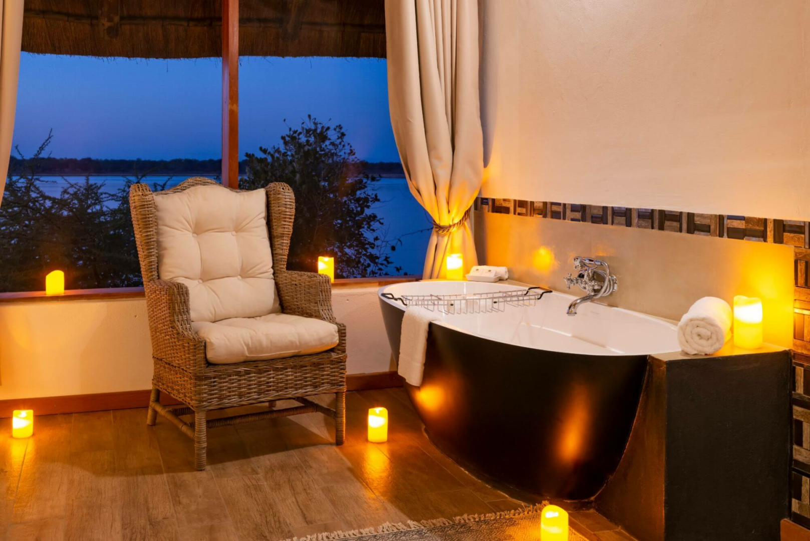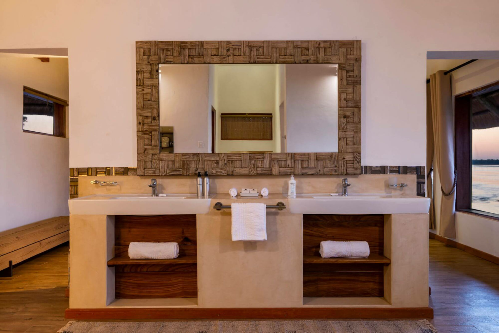 Gäste werden in vier großen, sehr komfortablen Chalets mit riesigen Verandas direkt mit Flussufer untergebracht. Die Inneneinrichtung ist afrikanisch modern, mit großen Bädern inklusive frei stehender Badewanne und uneingeschränkten Blick auf den Fluss.