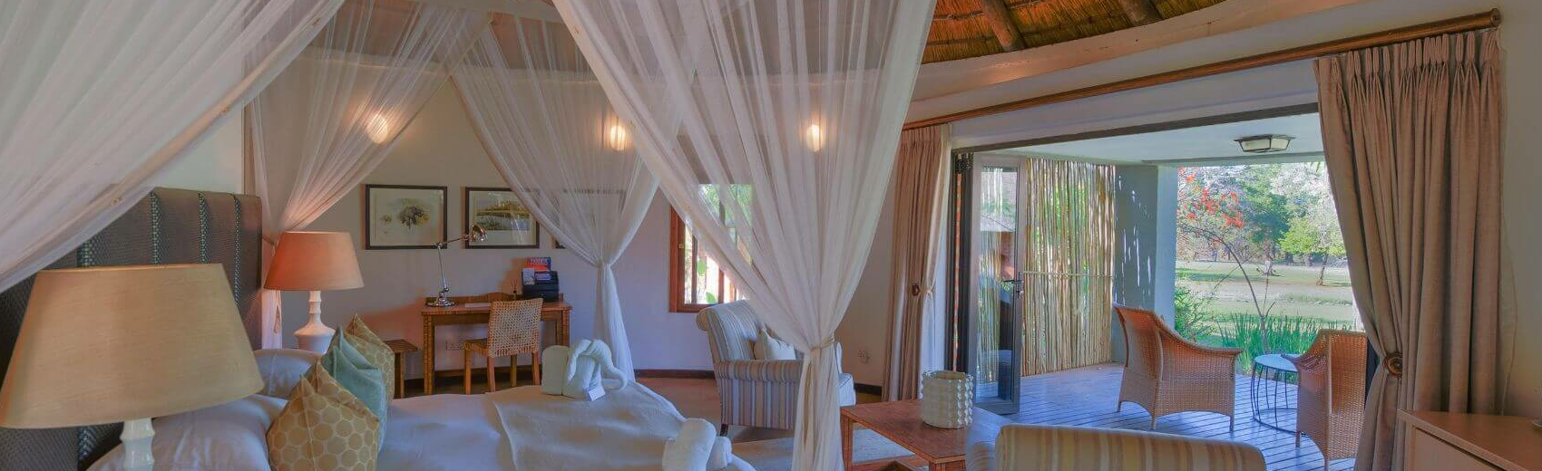 Lilayi bietet zwölf sehr geschmackvolle Zeltchalets, gut im Gelände der Lodge verteilt. Das Innere ist Licht durchflutet, hell und wunderschön möbliert. Der polierte Boden, die cremefarbenen Wände und einfachen modernen Möbeln in neutralen Farben schaffen ein sehr elegantes, fast luxuriöses Ambiente. Direkt vor dem riesigen Himmelbett liegt ein kleiner Loungebereich mit Sesseln und Schreibtisch. Von diesem aus blickt man durch Glasschiebetüren auf die private Holzterrasse mit Korbstühlen und einem Couchtisch – von der aus man mit Glück Buschböcke im Garten beobachten kann. Alle Zimmer Chalets sind en-suite mit schön gemachten Badezimmern inklusive frei stehende Badewanne