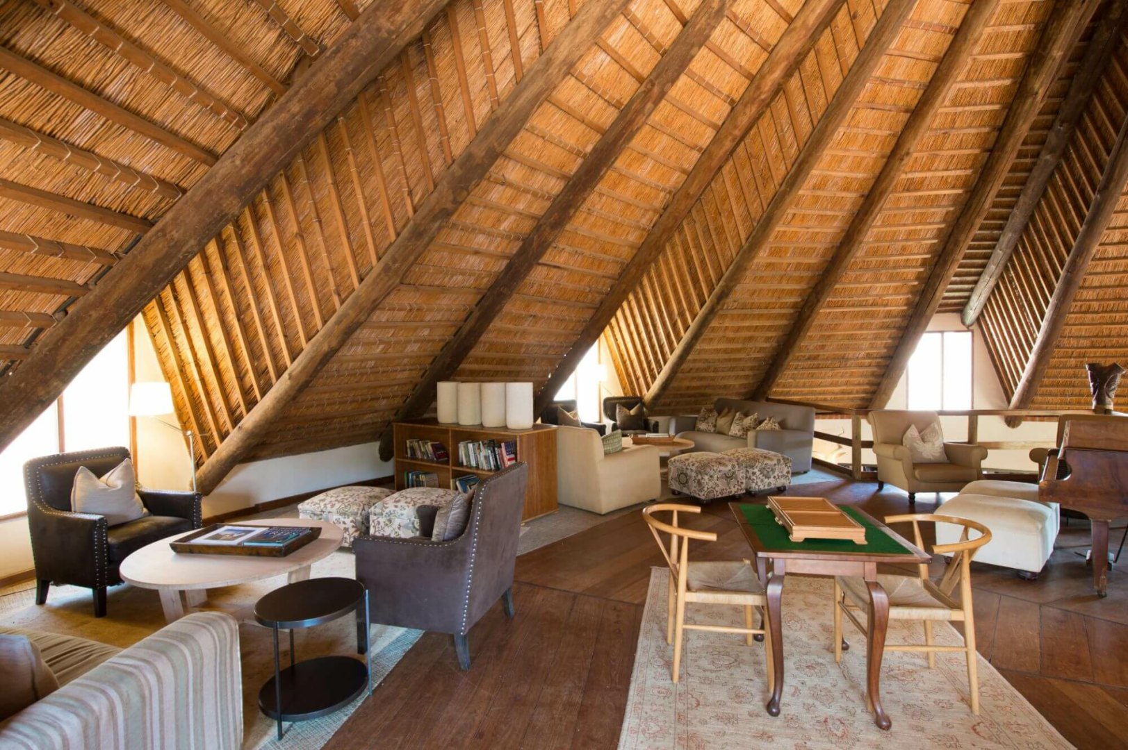 Die erhöhten gemeinsamen Bereiche unter Leinen blicken auf einen makellosen Garten. Überall auf der Terrasse, die das Hauptgebäude komplett umrundet, findet man Sitzmöglichkeiten in Sofas und Sesseln. Mahlzeiten können auch hier draußen serviert werden. Manchmal kommen zur Freude der Speisenden die Buschböcke und Zebras von Lilayi in der Nähe des Hauptgebäudes und man kann sie beim Grasen während der Mahlzeiten ganz in Ruhe beobachten.