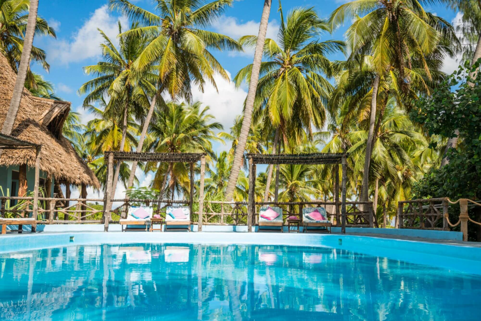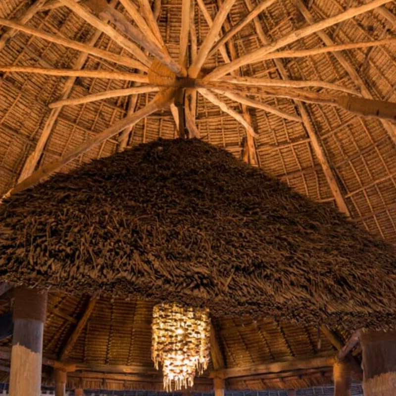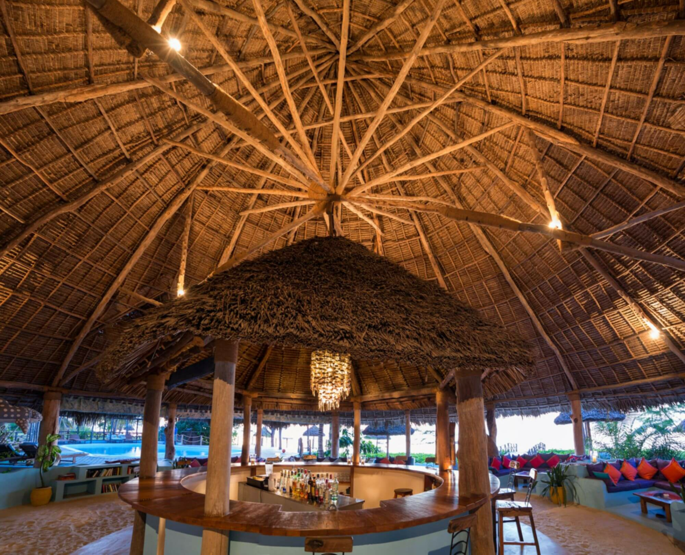 Die gemeinsamen Bereiche unter Makuti-Reetdach, bestehen aus einem entspannten Beach-Bar-Bereich mit Plüschsofas und Sandboden mit Blick aufs Meer und einem seitlich offenen Restaurantbereich, wo die Mahlzeiten serviert werden. Es gibt auch eine kleine Bibliothek mit Brettspielen, Billardtisch und lokalen Bao-Spielen. Ein Pool mit Sonnenliegen und ein paar Tischen ergänzen das Bild ab.