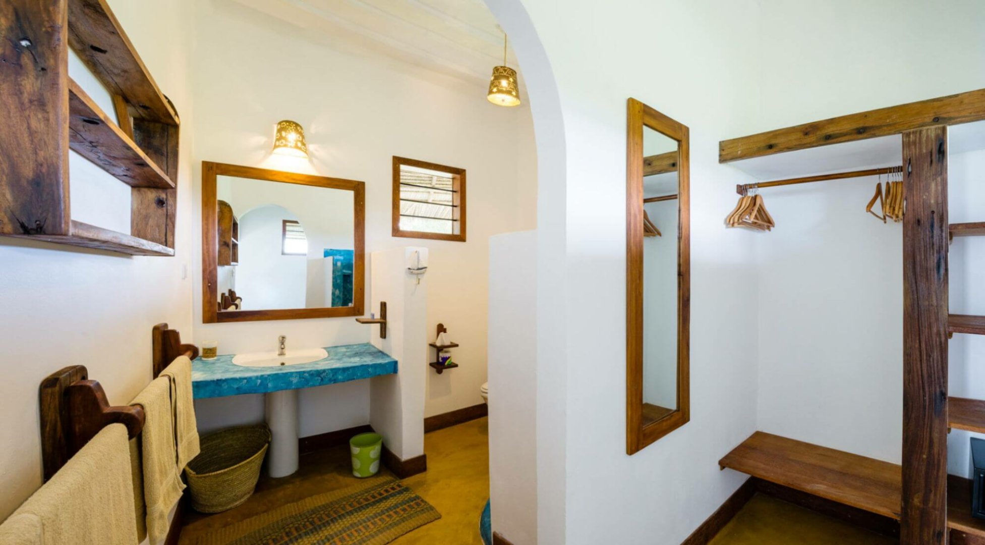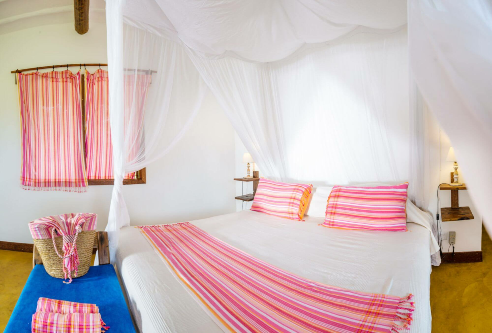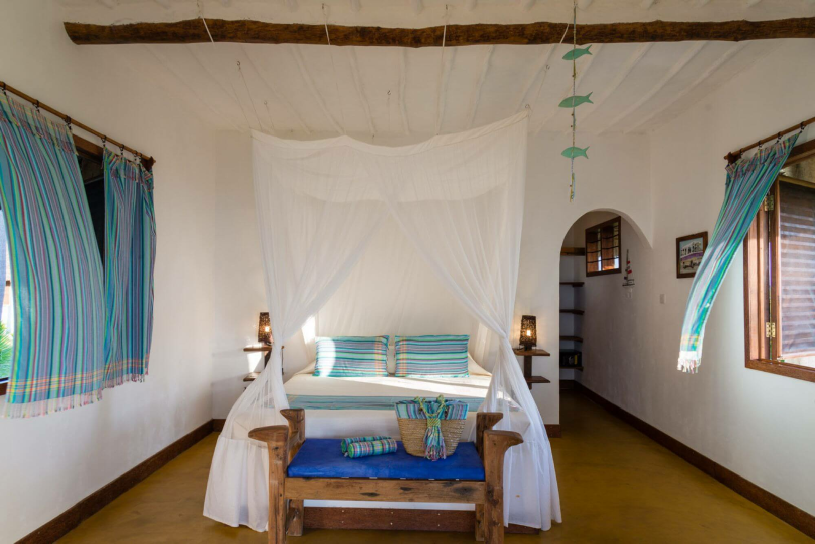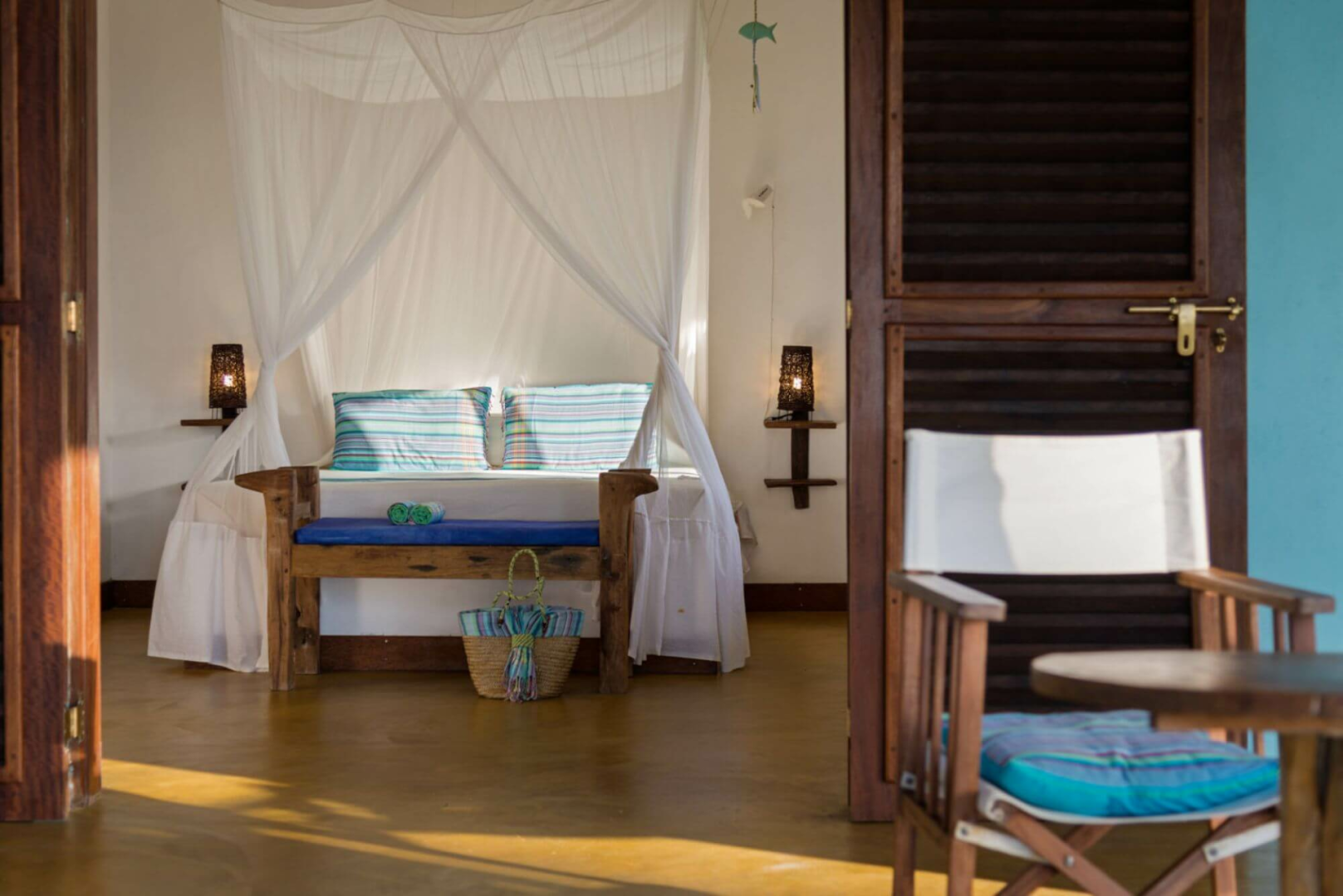 Butiama unterbringt seine Gäste in 15 geräumige weien Bungalows unter Reetdach. Die Bungalows haben große Veranden an der Vorderseite mit Sofas und Hängematten beschmückt. Das Zimmerinnere ist eher einfach gehalten, mit angefertigten Möbeln aus wiederverwerteten Bootholz. Es gibt natürlich ein Privatbad.
