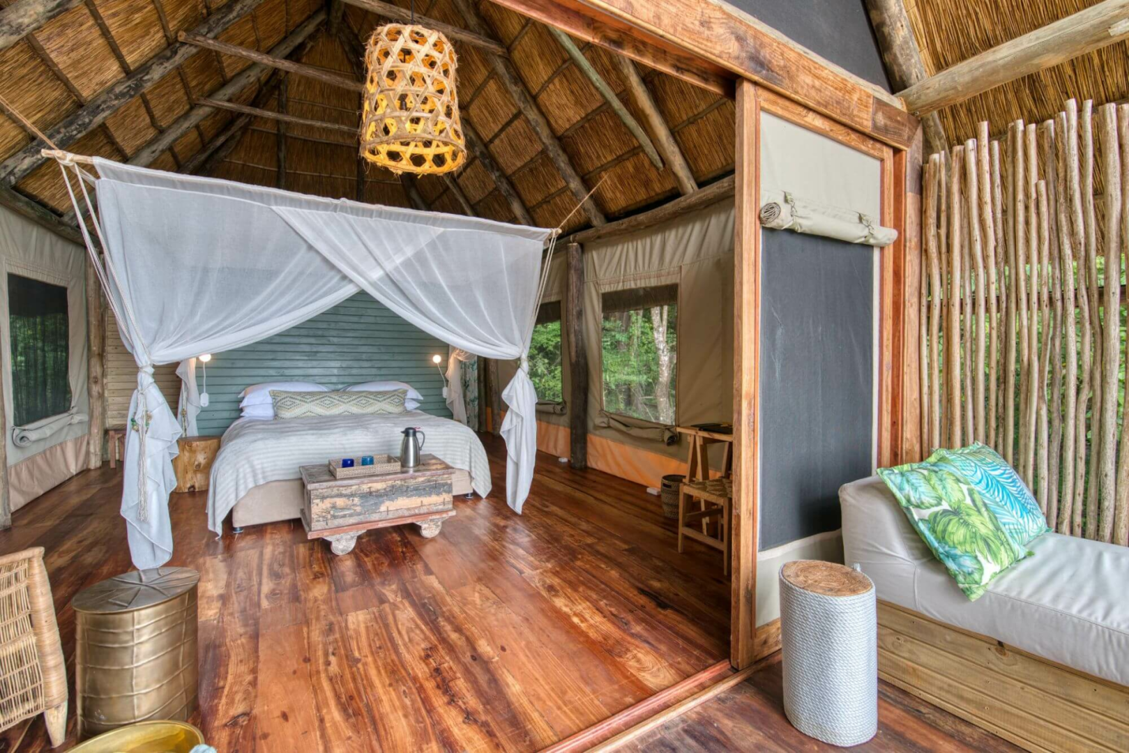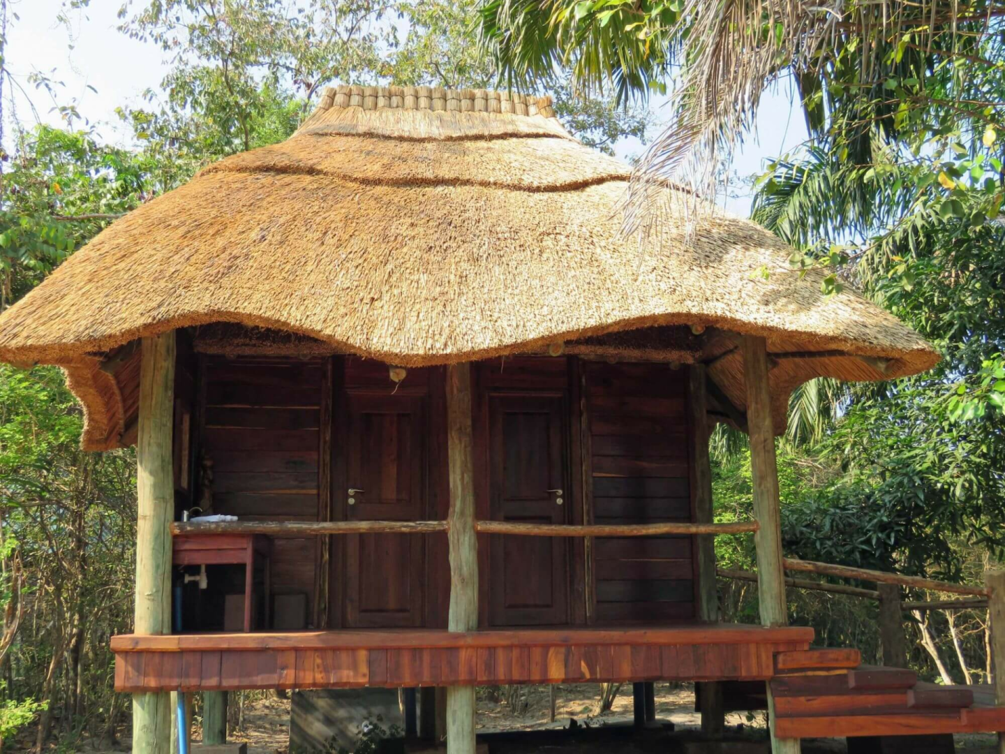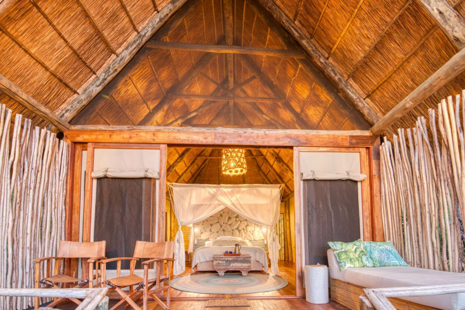 Die Zimmer sind großen Chalets auf Stelzen und unter Reetdach mit einer vorderen kleinen Veranda inkl. Stühlen und Tagesbett, einem geräumigen Innere mit Himmelbett und einem großzügigen Badezimmer mit zwei Waschbecken und Dusche.