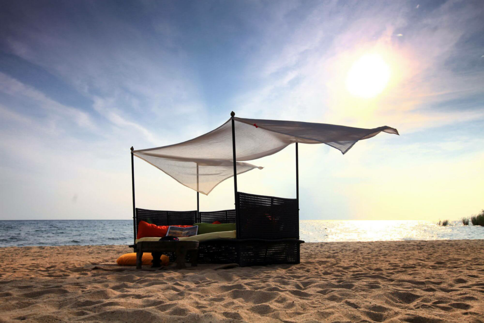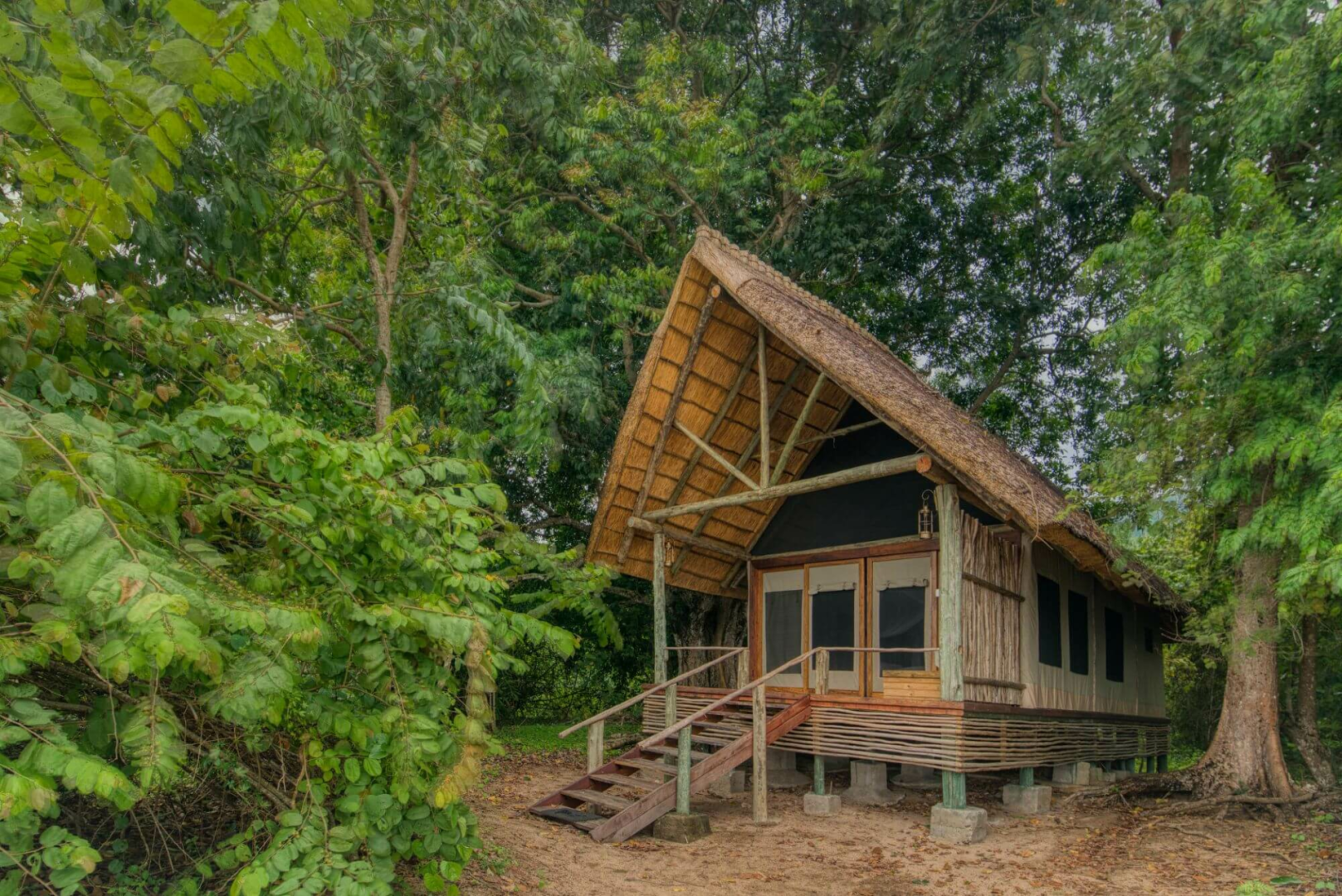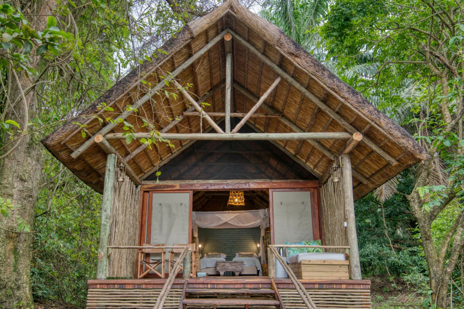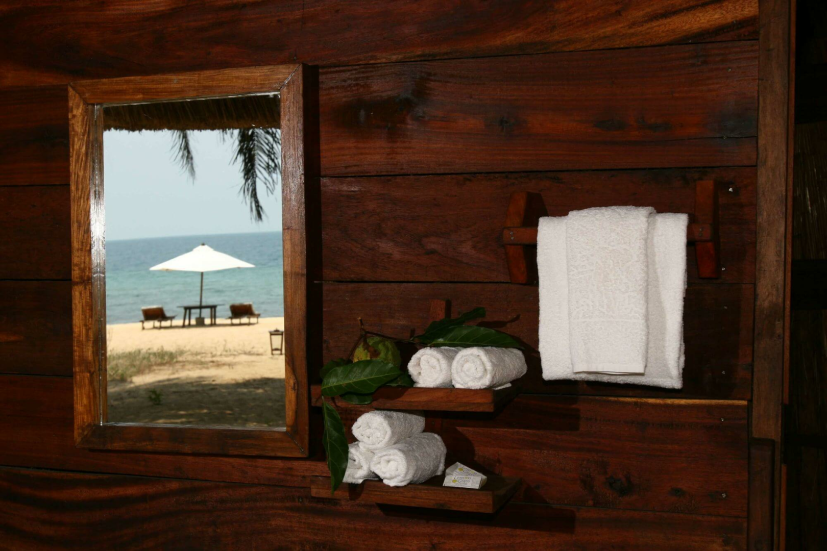 Die Zimmer sind großen Chalets auf Stelzen und unter Reetdach mit einer vorderen kleinen Veranda inkl. Stühlen und Tagesbett, einem geräumigen Innere mit Himmelbett und einem großzügigen Badezimmer mit zwei Waschbecken und Dusche.