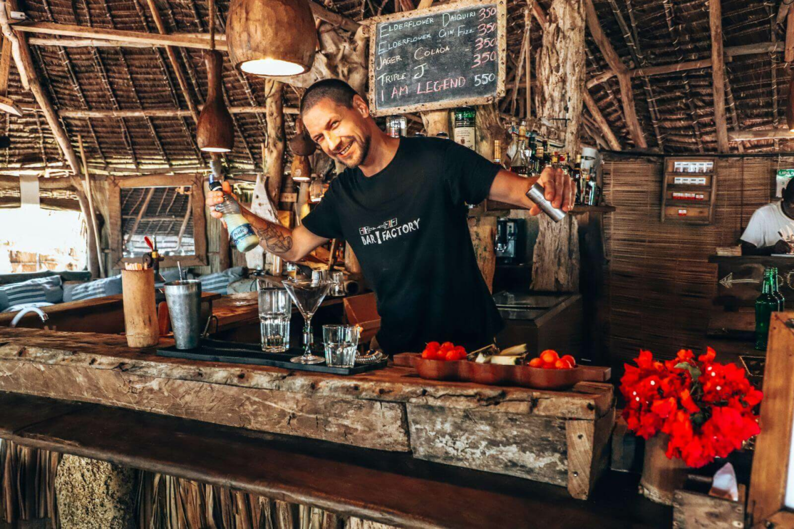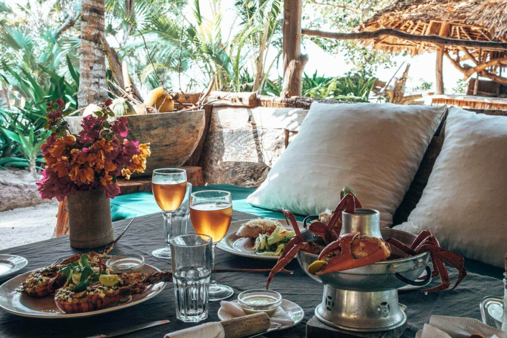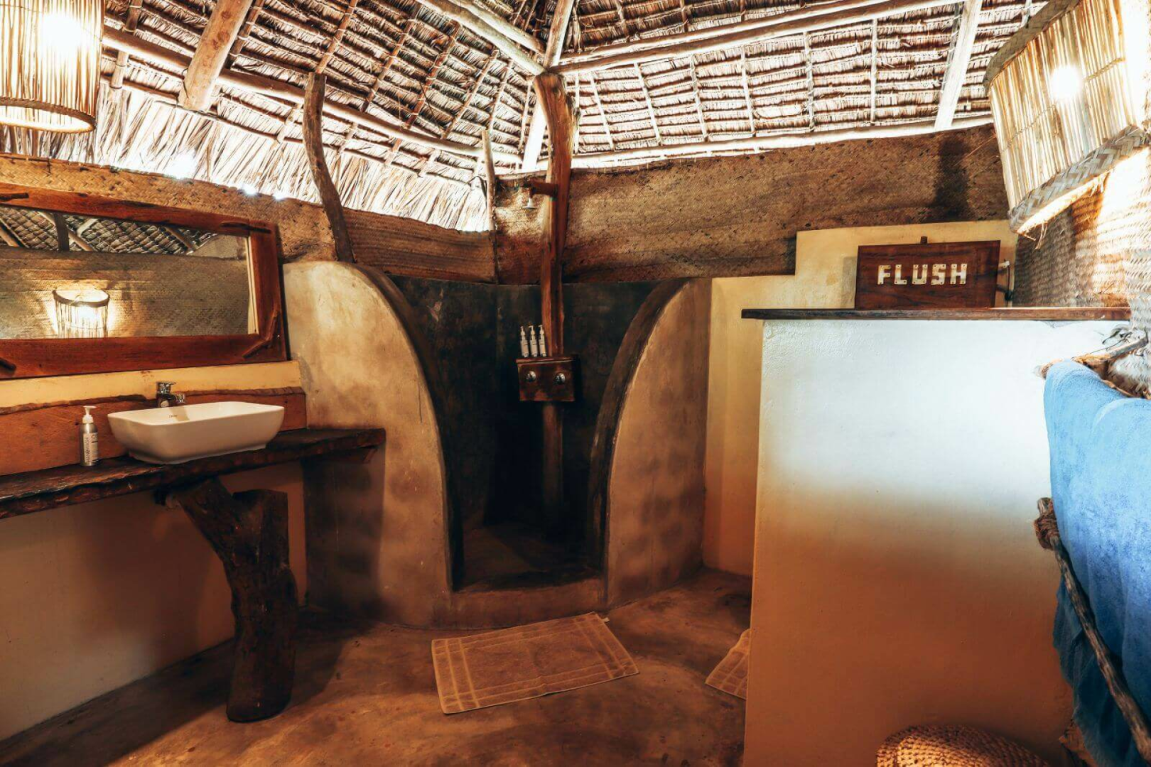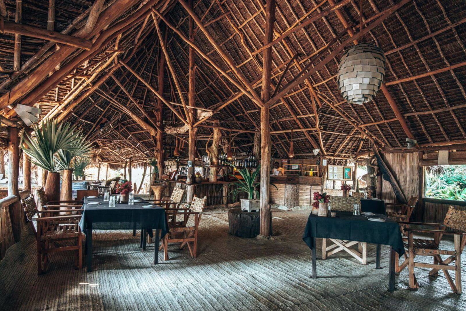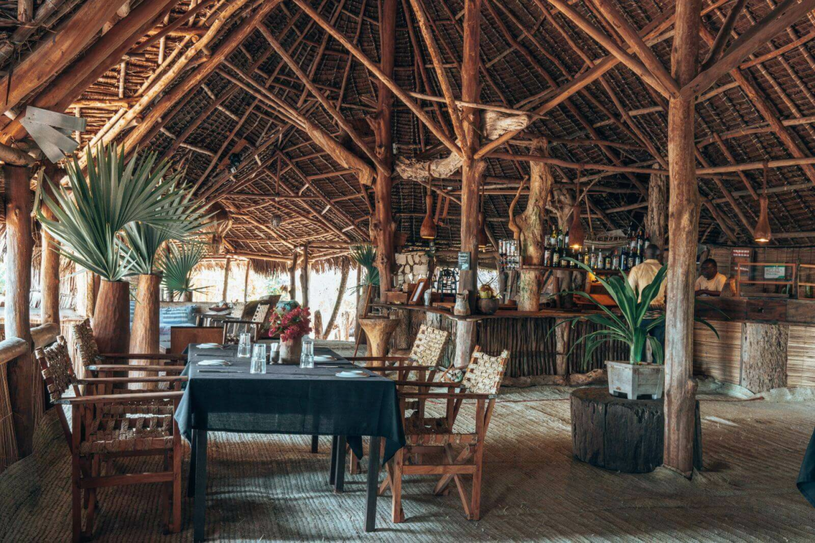 Die Hauptbereiche bestehen aus einer offenen Boma unter Reetdach mit Bar und einer wundervoll gestalteten Lounge mit Essbereich. Insbesondere der Loungebereich mit dem Esstisch ist atemberaubend schön gemacht. Die eindrucksvolle Holzstruktur mit Bar in der oberen Etage, wo sich eine Terrasse mit bequemen Sofas und Sitzkissen befindet, ist wunderschön. Unten stehen Esstische für die Mahlzeiten bereit, sowie weitere Sitzecken. Traditionelle Elemente der swahilischen Bauweise wie Reet und viel Holz werden mit einem polierten Holzboden, stilvollen Gardinen und alten Booten, die als Bücherregale dienen, sehr geschmackvoll kombiniert.