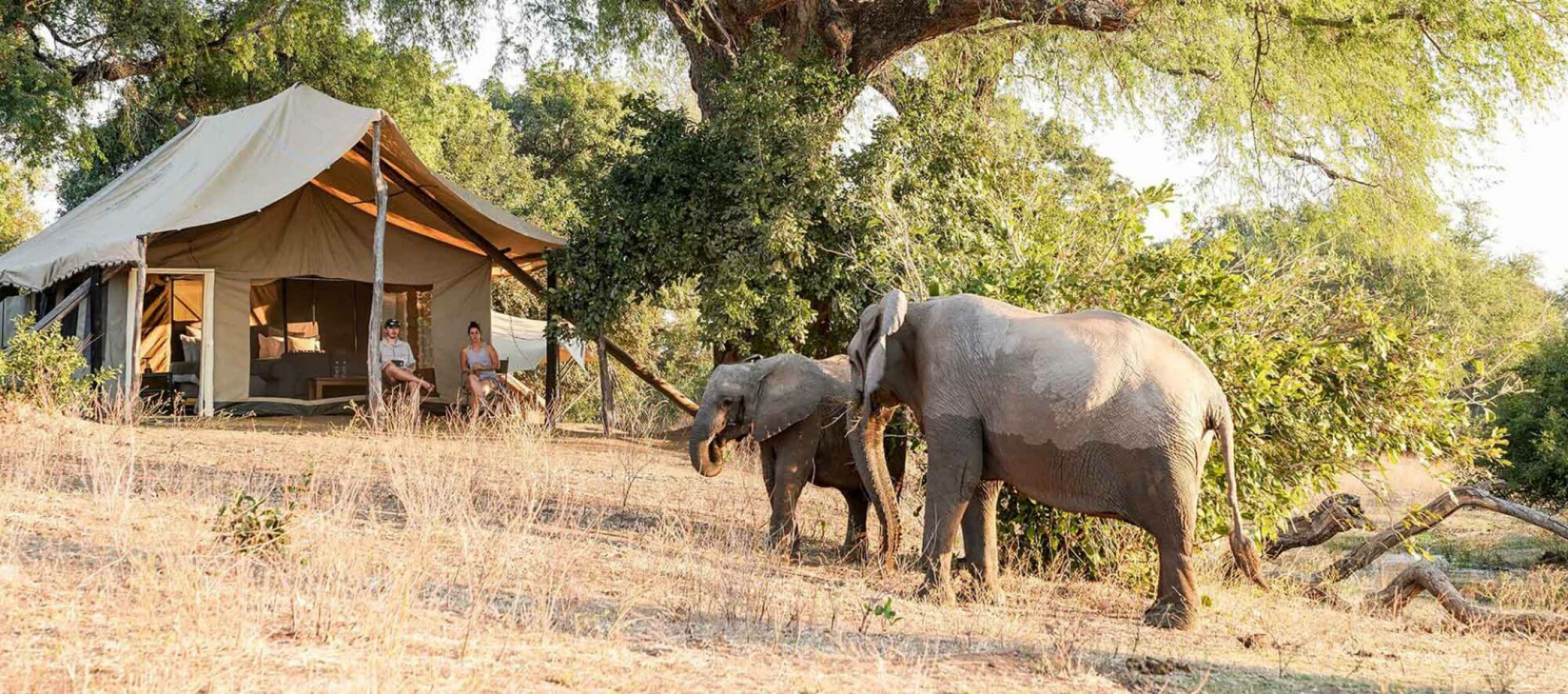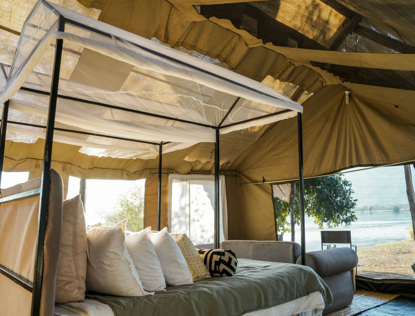 Eine Kreuzung zwischen permanenten und mobilen Tented Camp: so könnte man das Zambezi Expeditions Camp in direkter Sambesiflusslage im Herzen des Mana Pools Nationalparks im Norden Simbabwe beschreiben.