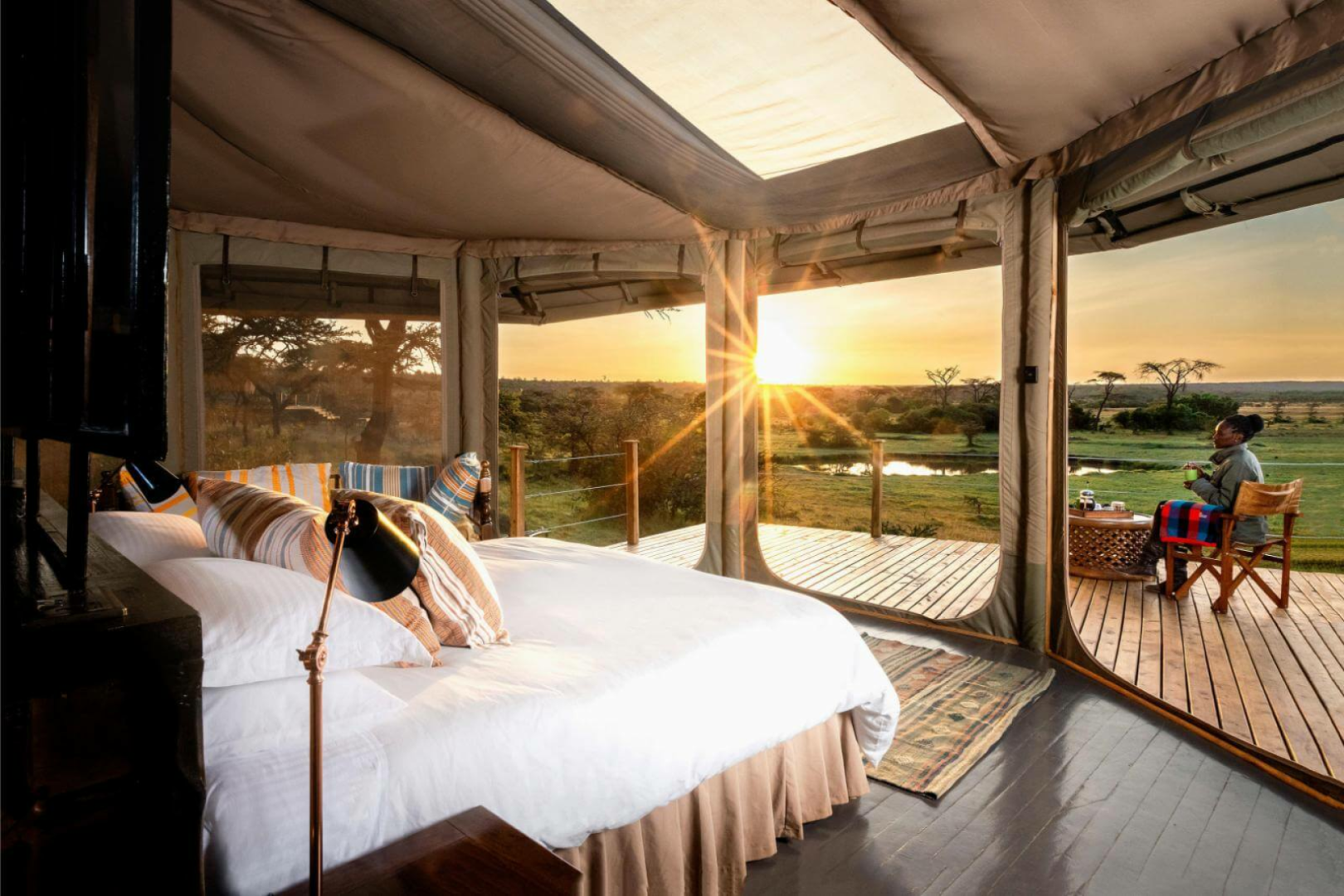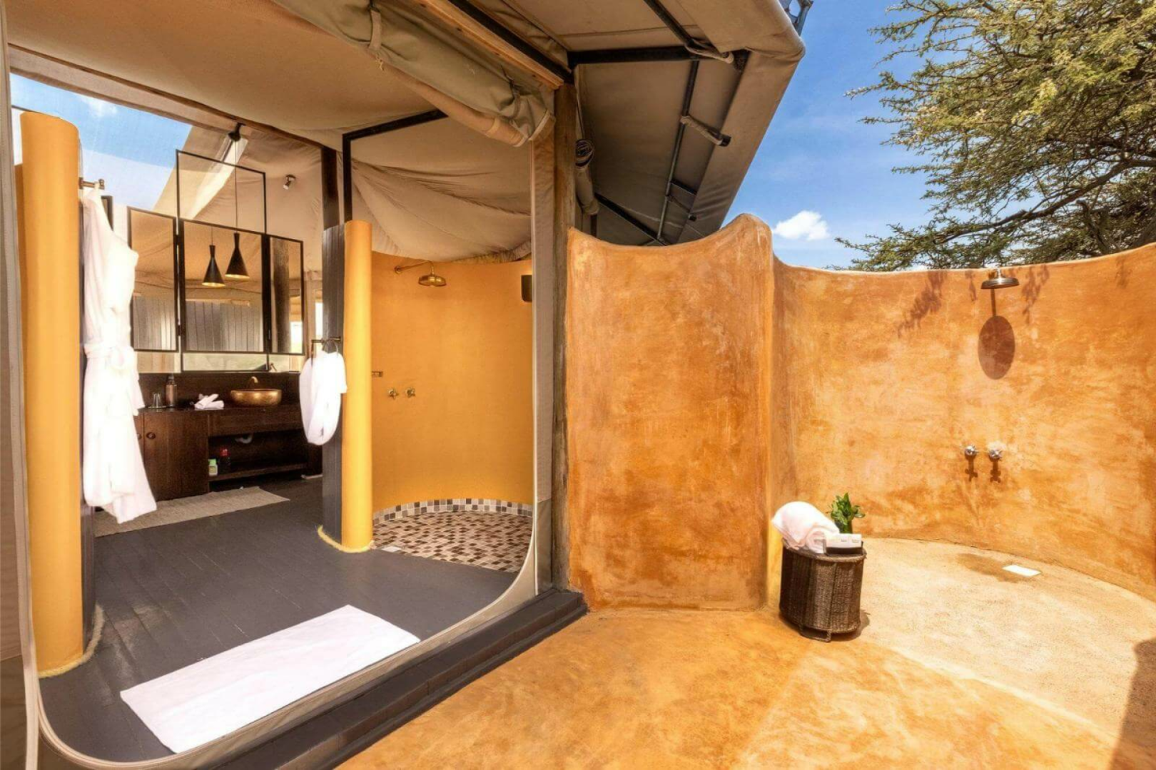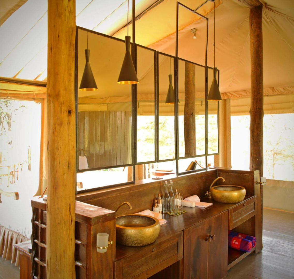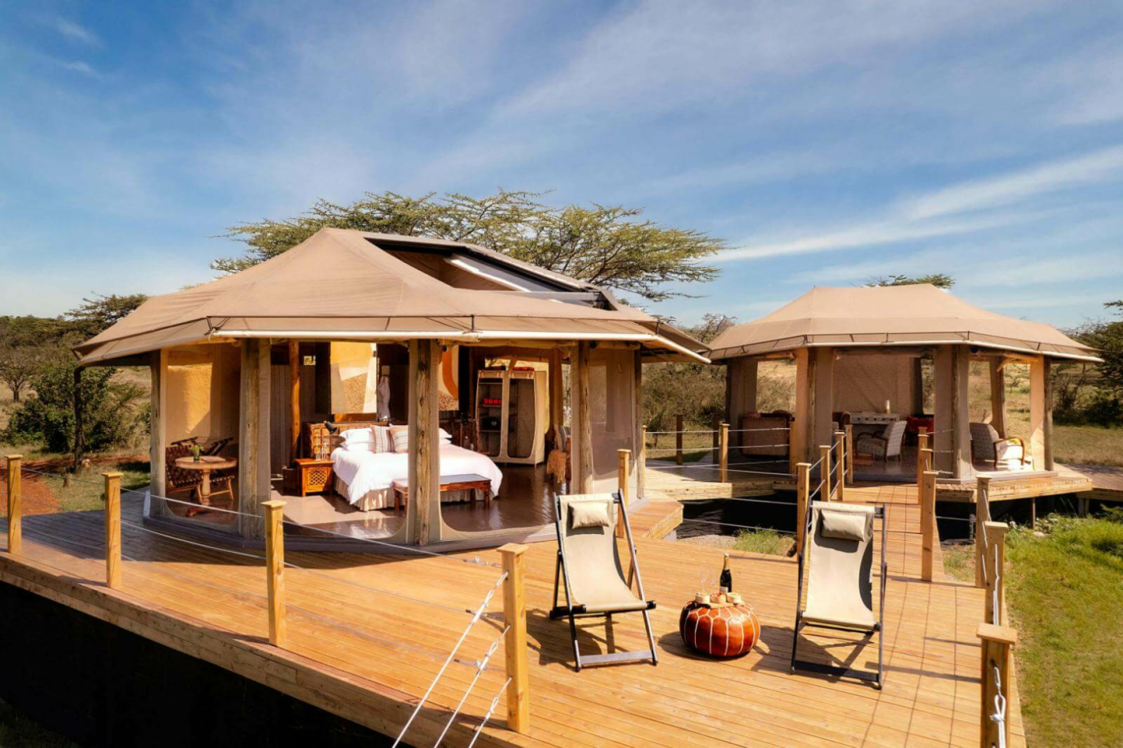 Die Zelte wurden in einem innovativen Stil entworfen, der Modernität und Tradition sowie das Konzept der Massai eines runden „Manyatta“, eines Hauses, das einen fast ununterbrochenen 360°-Blick bietet, miteinander verbindet. Die Zelte haben ein modernes afrikanisches Design mit einem Kingsize-Bett, Ventilator, Nachttischen mit Lampen, vielen Ladegeräten und einem runden Tisch.