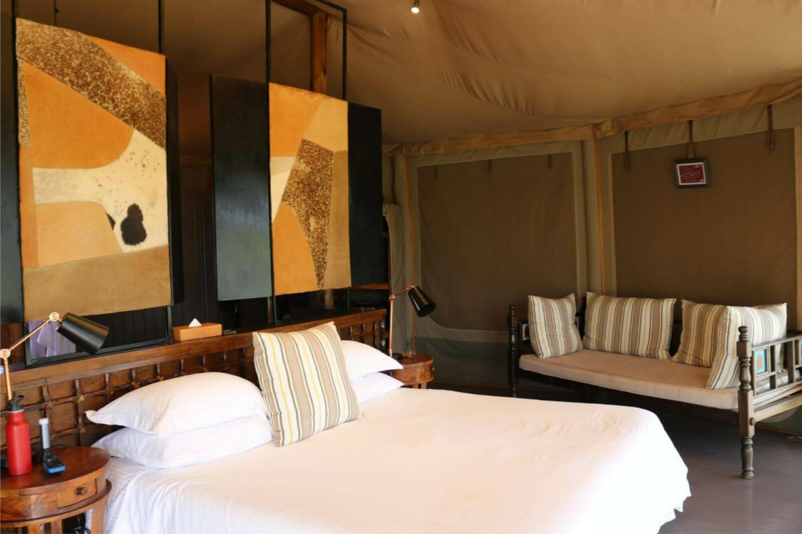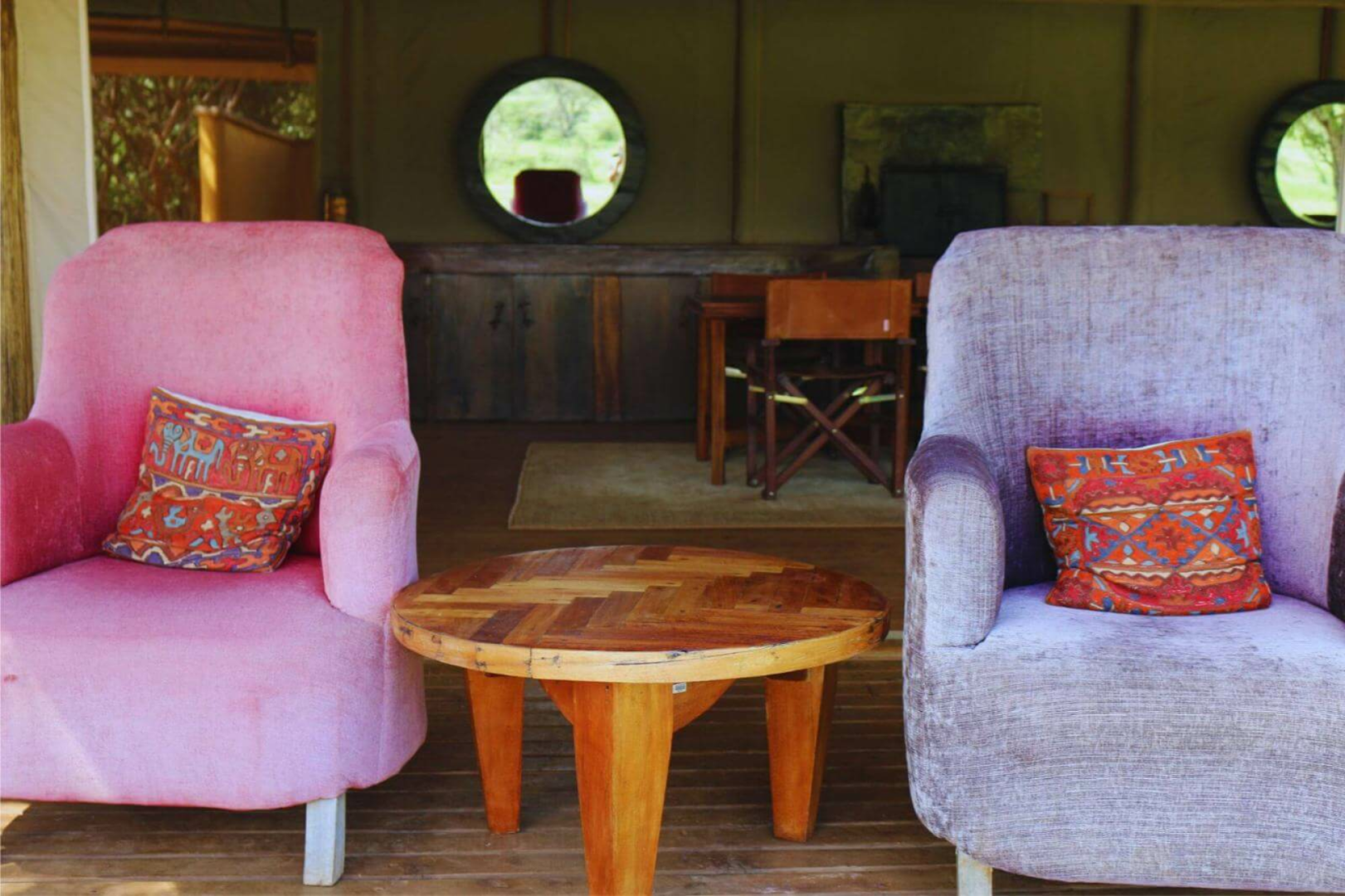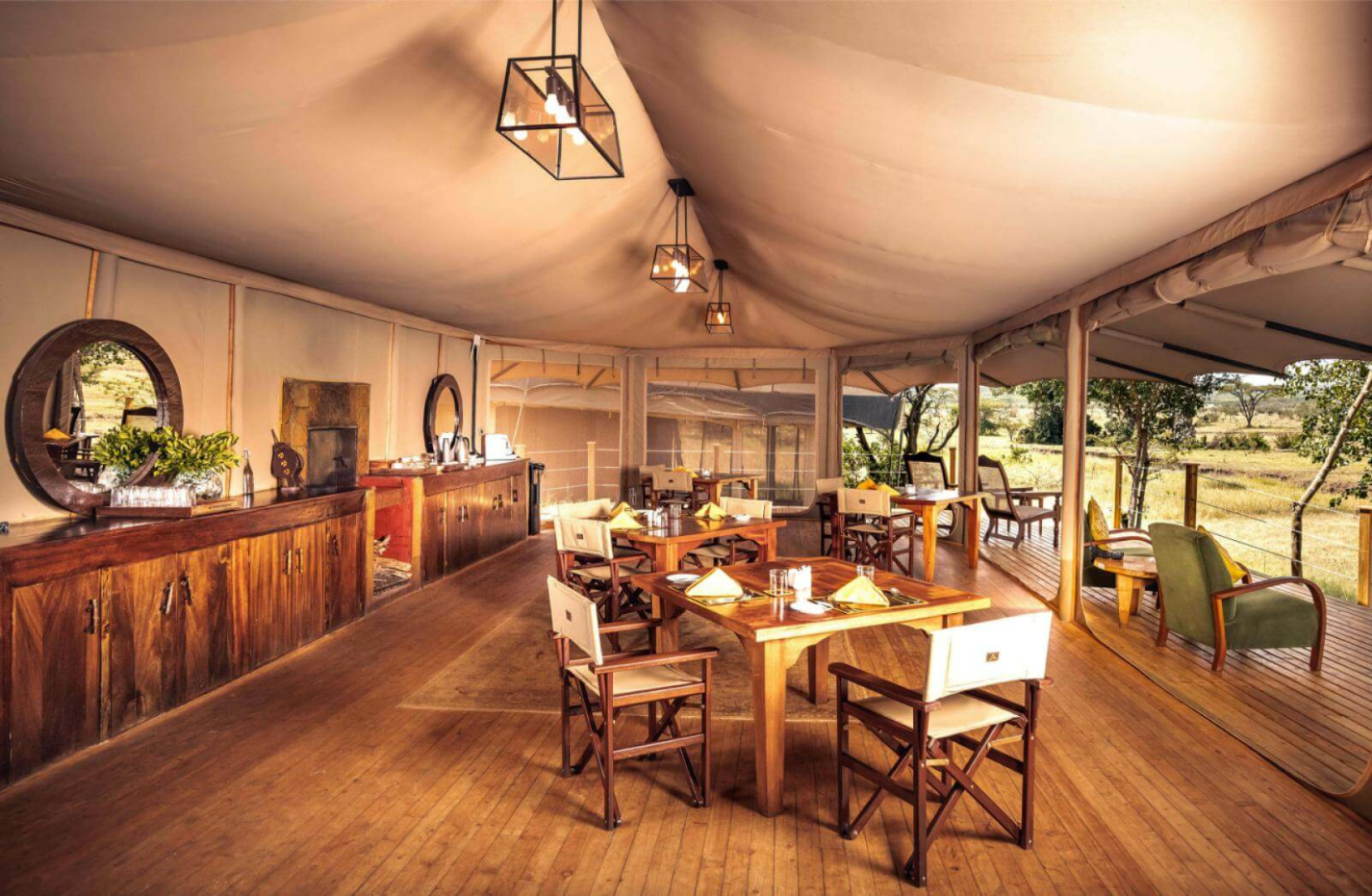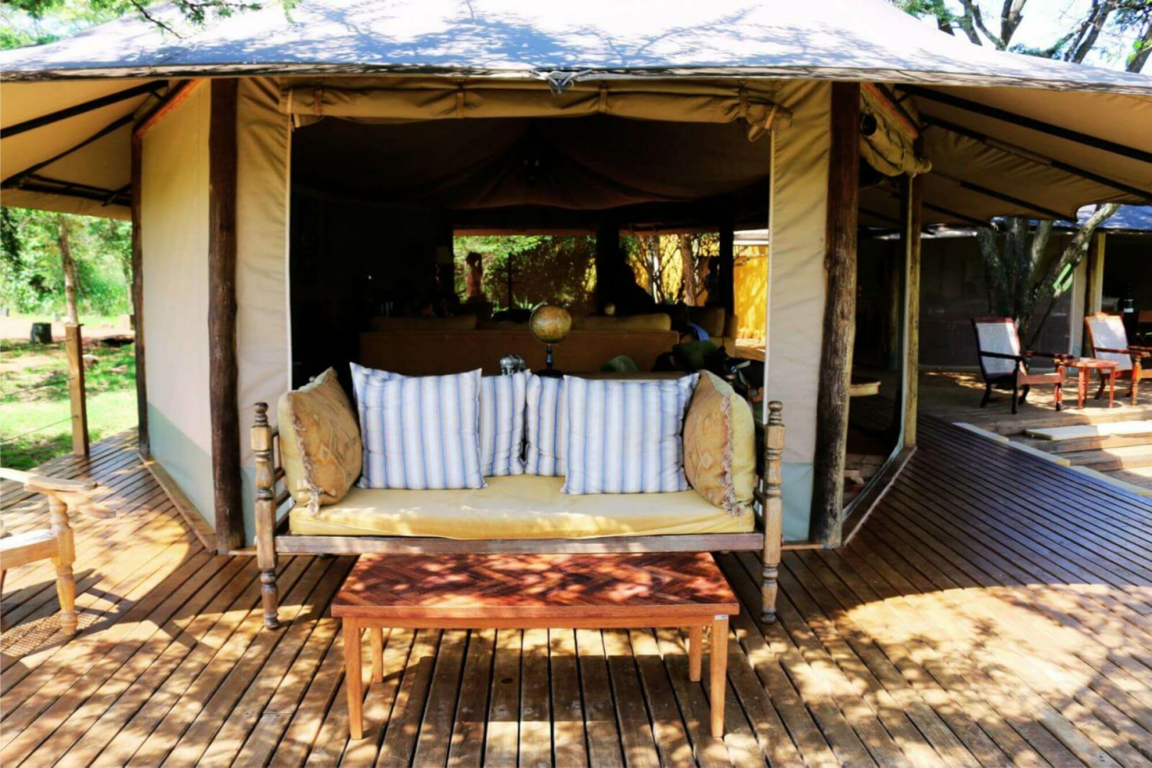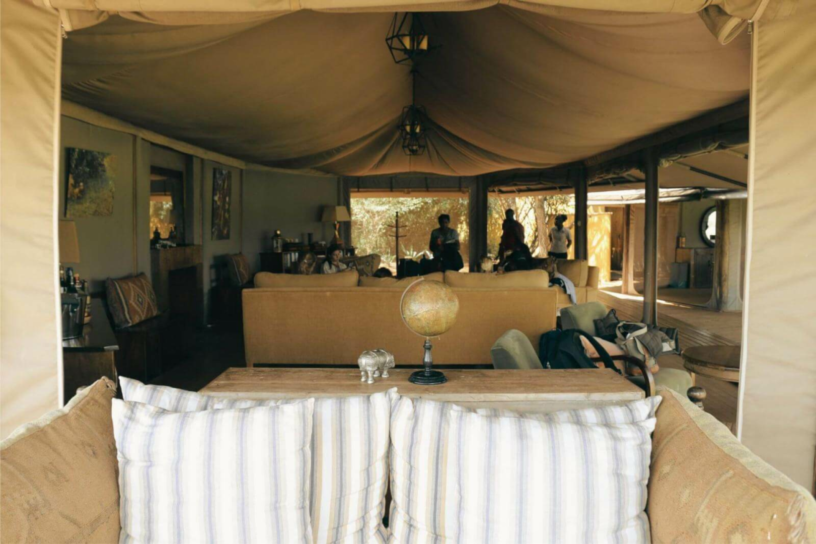Darüber hinaus ist das Camp sehr luxuriös. Es gibt einen Gemeinschaftsbereich mit einer hübsch dekorierten, vielleicht etwas kitschig-dekadenten Lounge und ein zweites Zelt direkt gegenüber, in dem die Mahlzeiten serviert werden (an separaten Tischen, damit die Privatsphäre der Gäste gewahrt bleibt).
