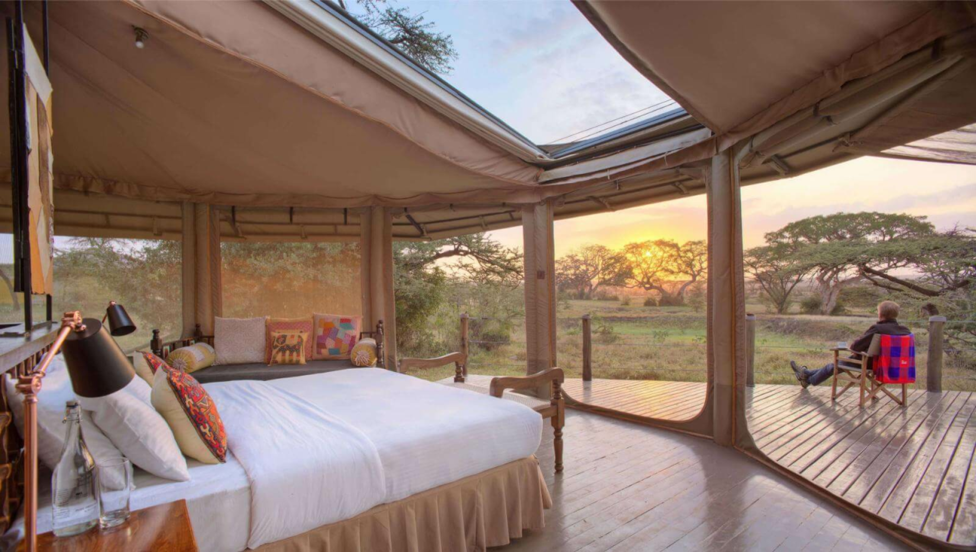 Das Leopard Hill Camp im ergiebigen privaten Naturschutzgebiet Naboisho nördlich der Masai Mara hat sich in der Safaribranche einen Namen gemacht, weil seine Zelte mit einem sich selbst öffnenden Dach ausgestattet sind, das es den Gästen ermöglicht, buchstäblich unter den Sternen zu schlafen.