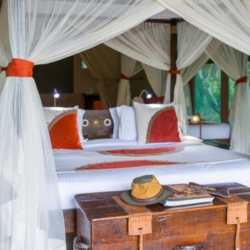 Die Unterbringung der Gäste erfolgt in acht komfortabel, aber nicht übertrieben luxuriös eingerichteten Zelten mit Privatbad mit einer kleinen Sitzecke und Blick auf den Fluss und damit auf die Nilpferde und die Krokodile.