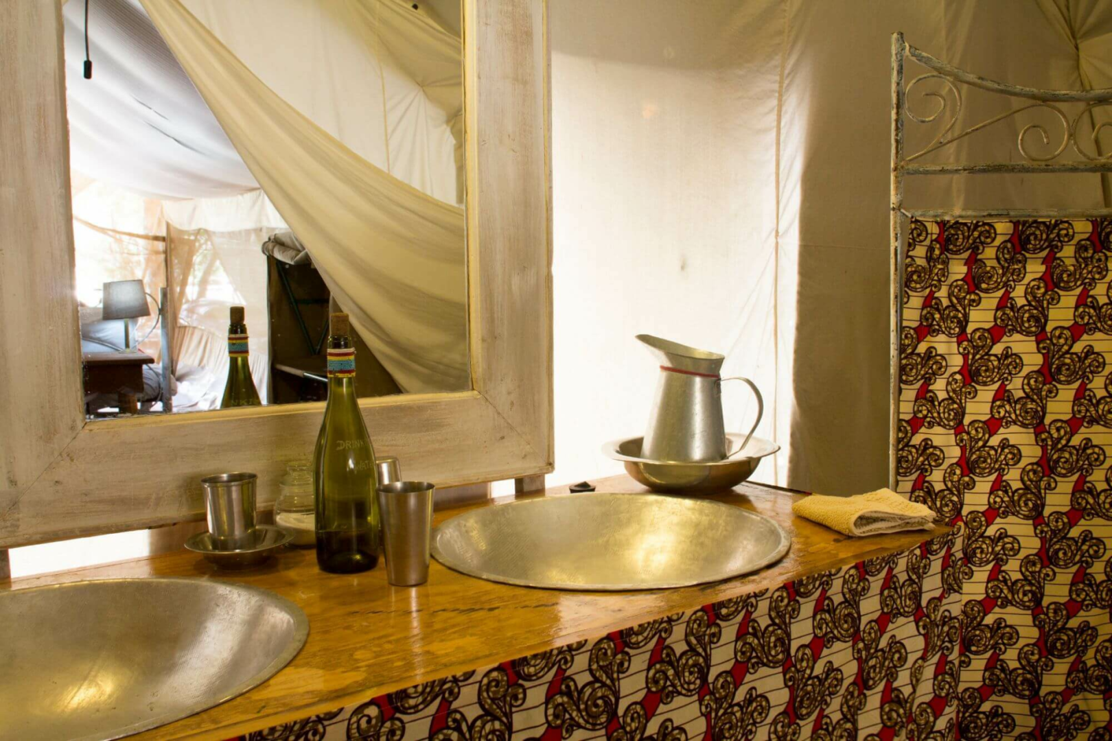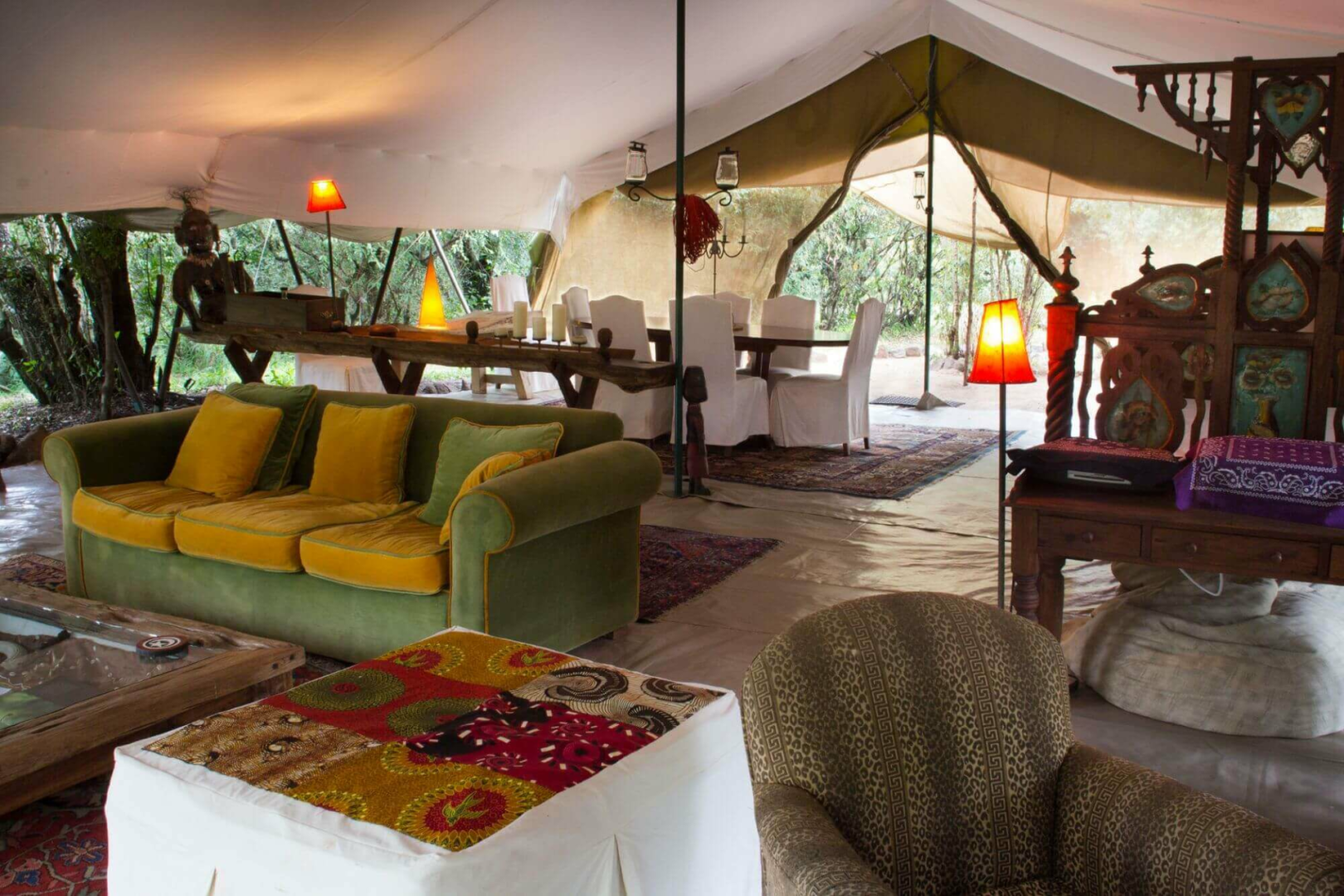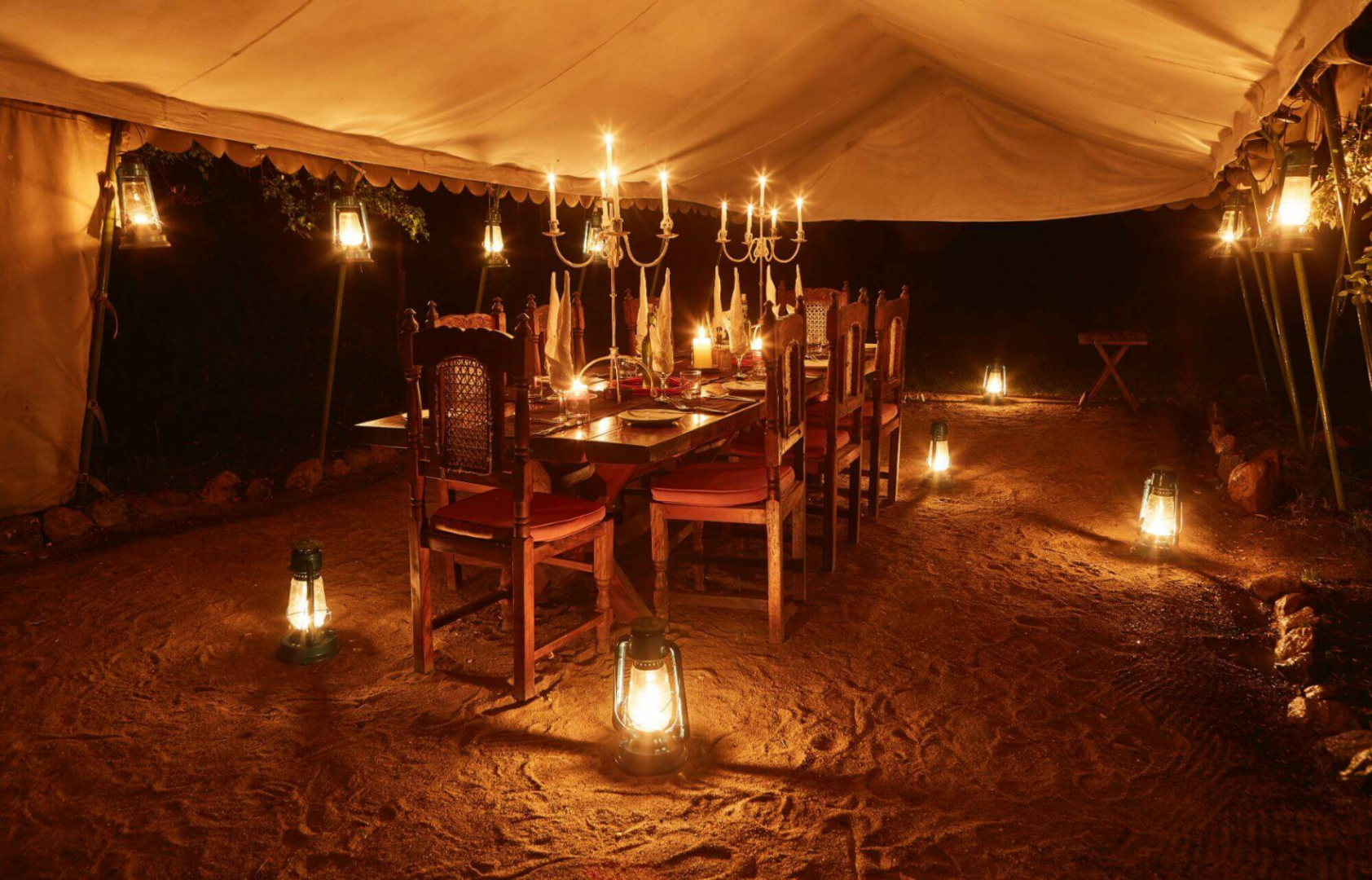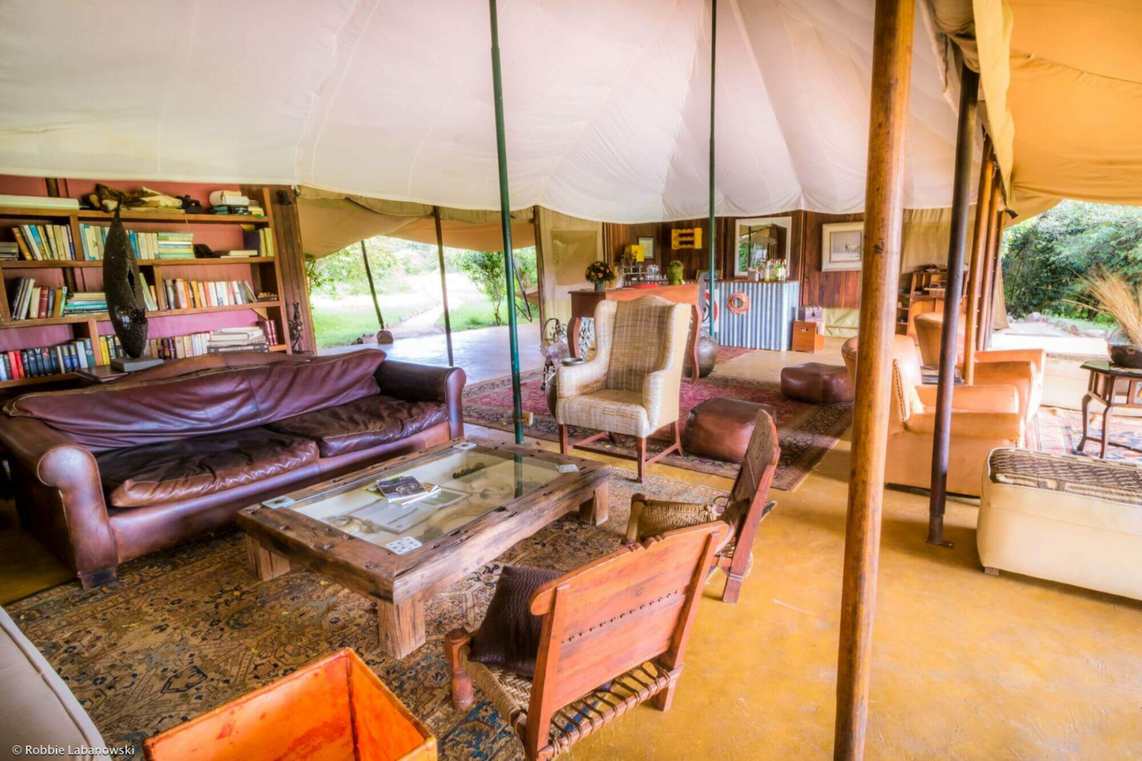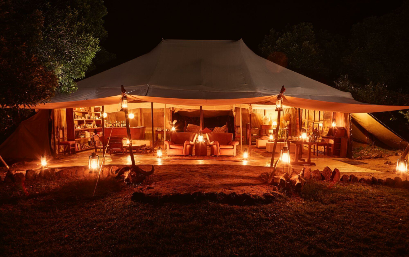 Das Camp selbst ist eine unprätentiöse Adresse, mit einem vornehm eingerichteten Messzelt, mit Ledersofas, Orientteppichen, alten Möbelstücken und einer Bar, dass sich zur Feuerstelle öffnet.