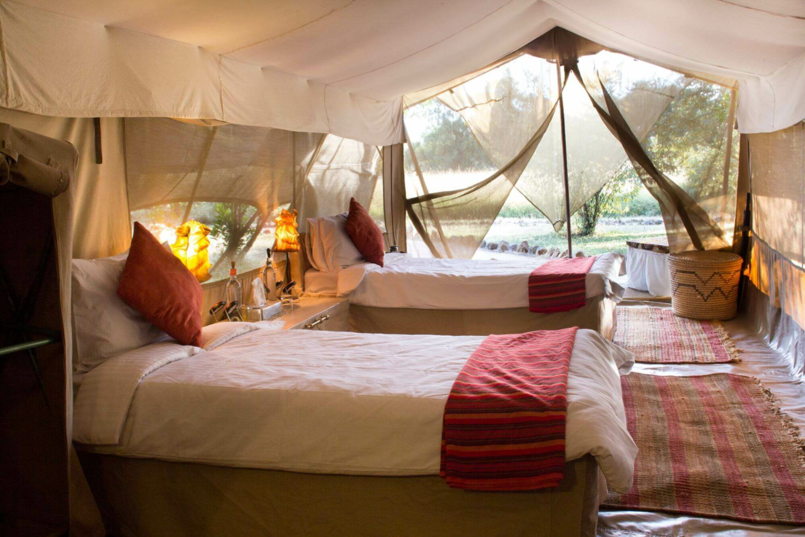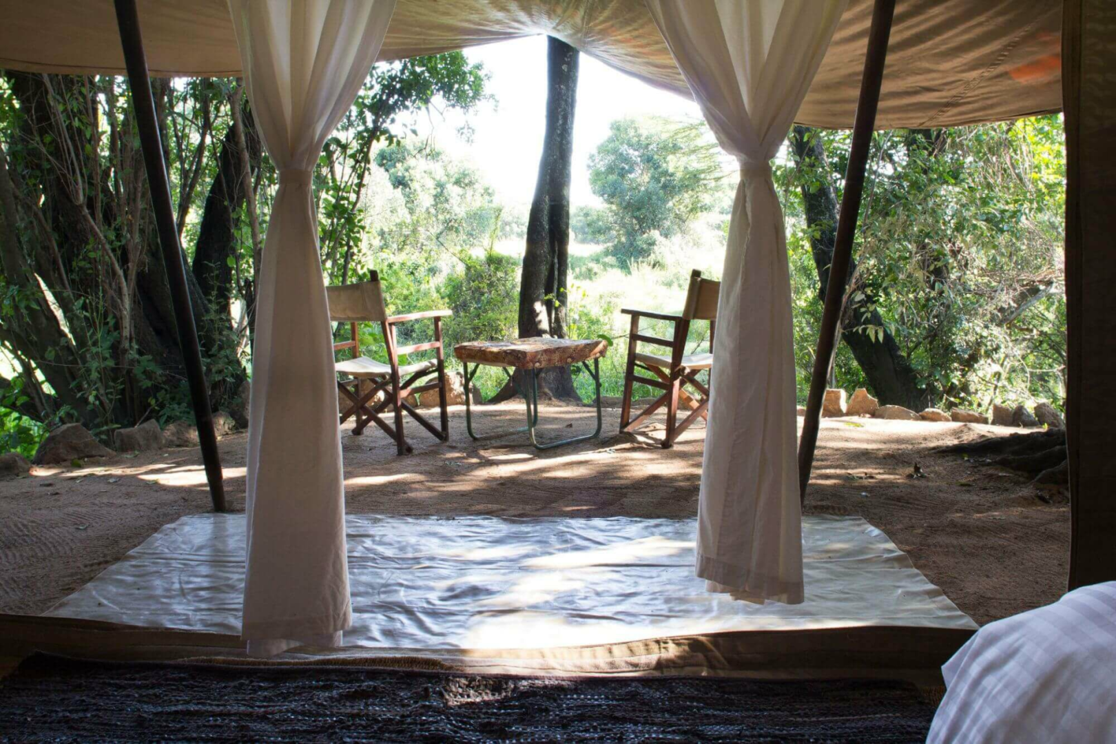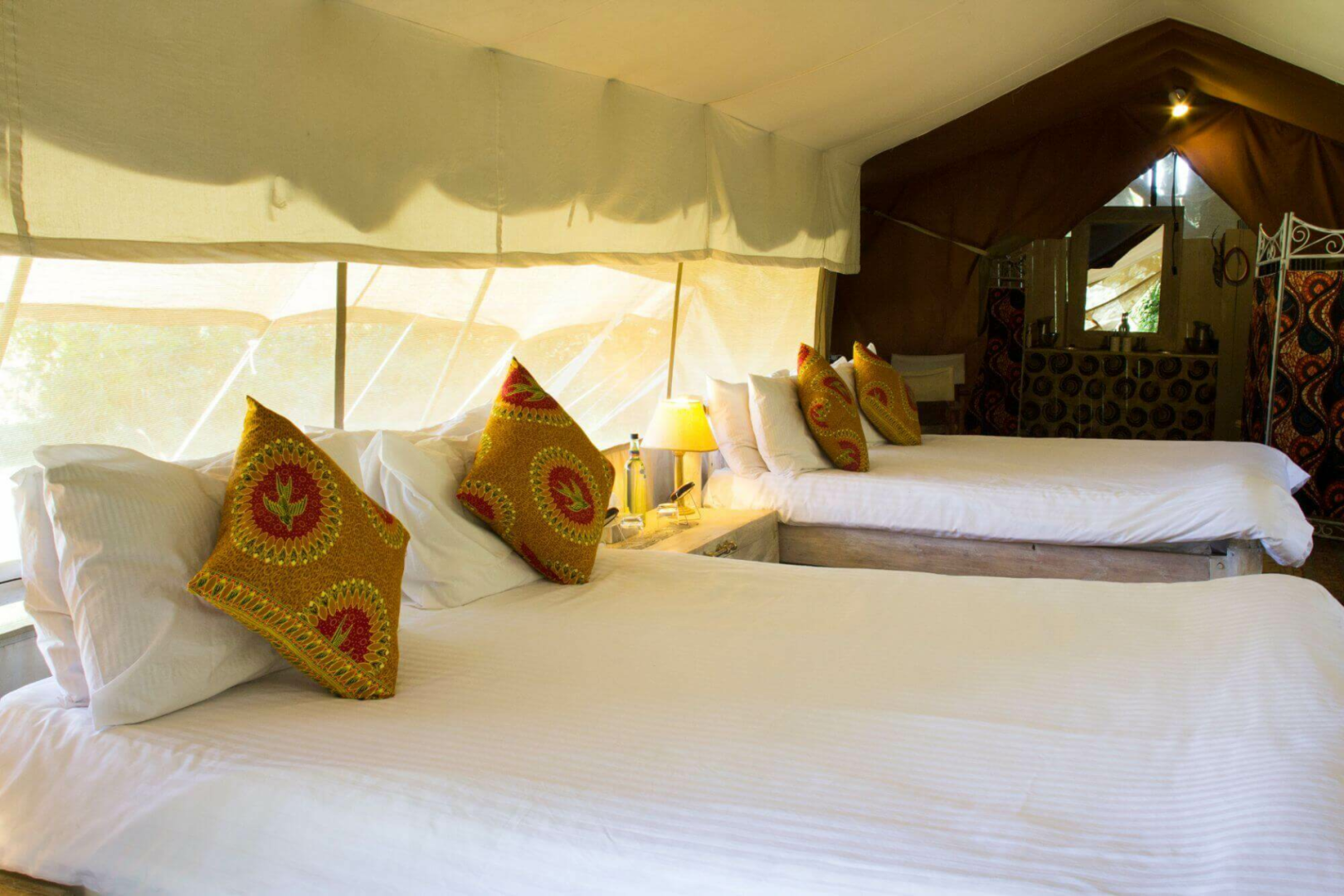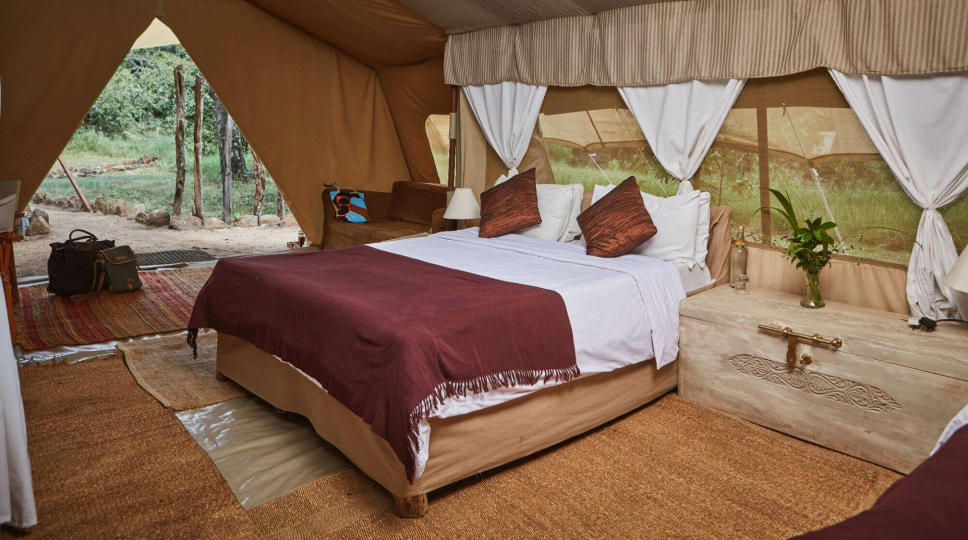 Die sieben Zelte liegen direkt auf Planen auf dem Boden, und sind im Inneren etwas klein, aber gemütlich und farbenfroh eingerichtet. Eine kleine Veranda und ein Privatzimmer mit einer Buschdusche gibt es natürlich in jedem Zelt.