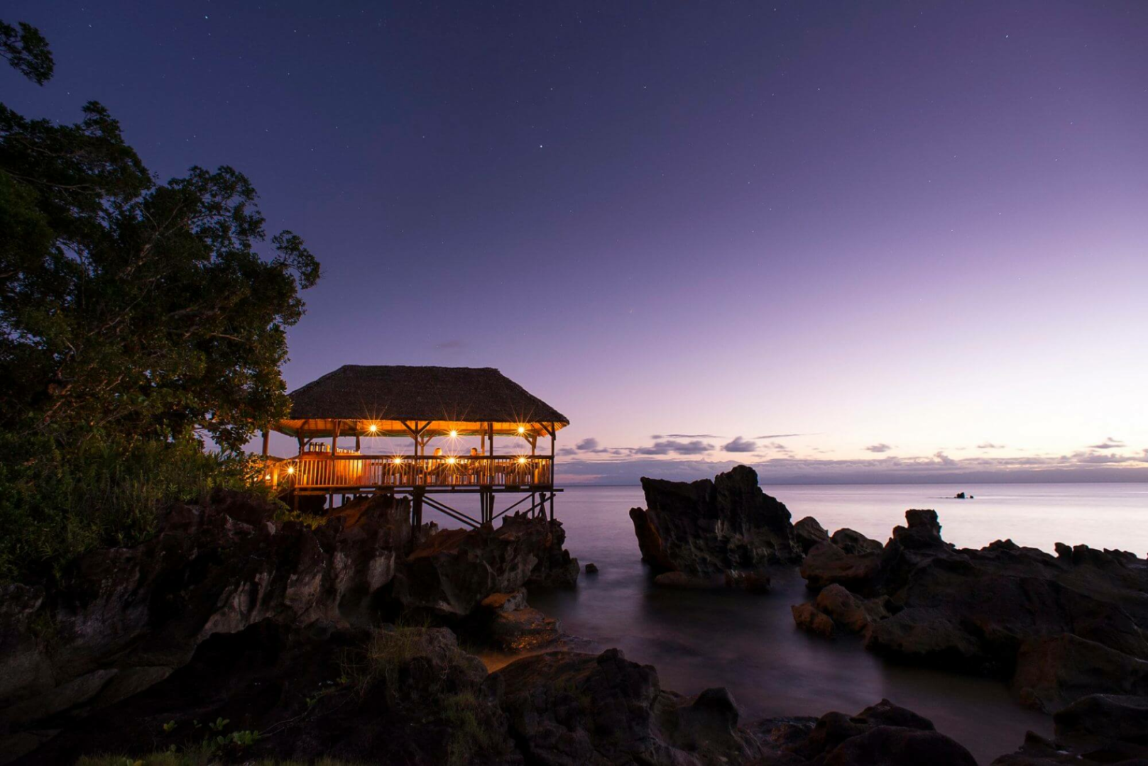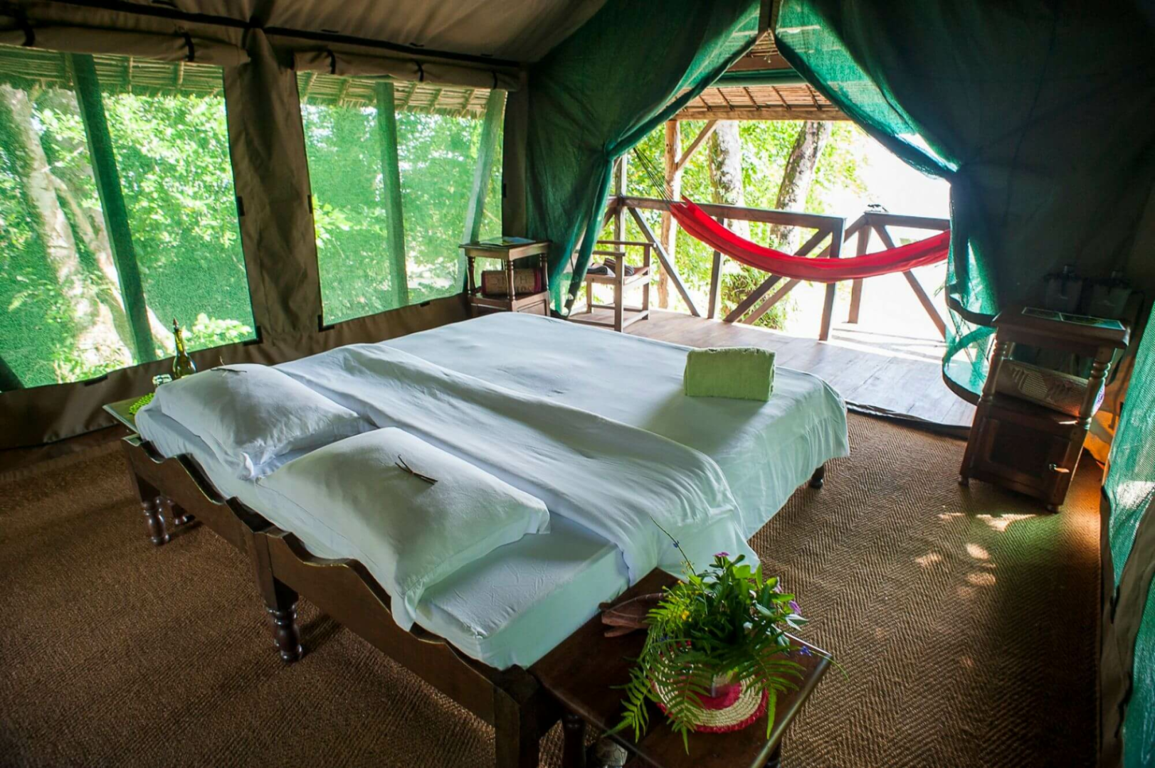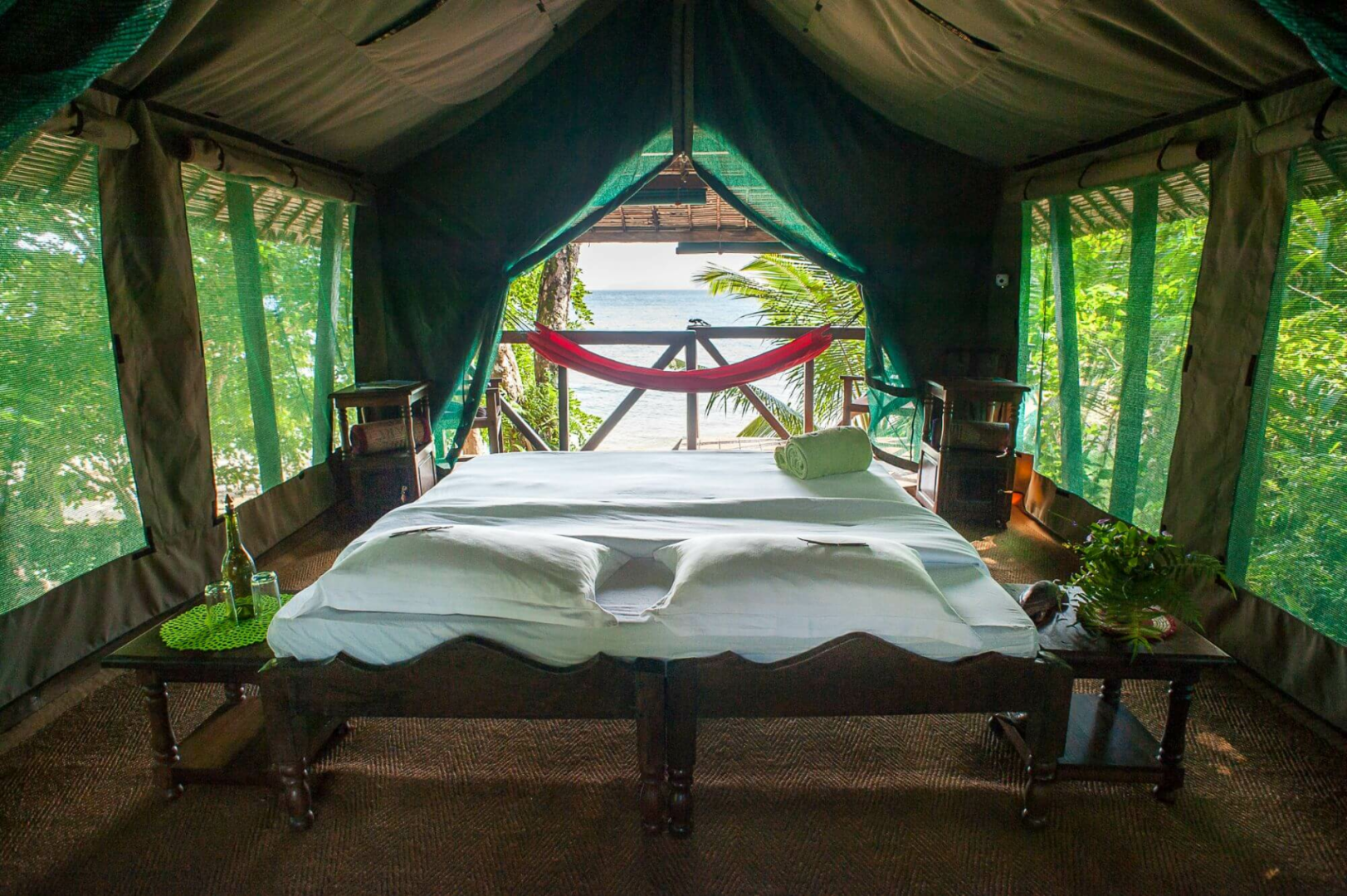 Die Lodge bietet 7 Luxuszelte im afrikanischen Safaristil, aufgebaut auf Stelzen, unter Reetdach und mit privater Terrasse. Die Zelte sind auf Stelzen gebaut und bieten einen ungehinderten Blick auf das Blätterdach des Waldes und das Meer. Die Inneneinrichtung ist komfortabel, aber nicht luxuriös, mit Teppichböden, einem großen Bett, Abstellmöglichkeiten, zwei Nachttischen und einem privaten Badezimmer. Von der kleinen möblierten Veranda mit Hängematte zum Entspannen hat man einen Traumblick auf das Türkiswasser der Antongil-Bucht.