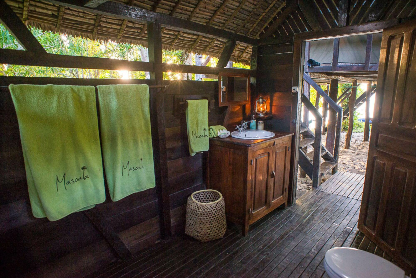 Das Badezimmer ist simpel, aber effizient und wurde in einer Holzkabine am Ende des Zeltes untergebracht. Es verfügt über einen nicht abgetrennten Buschbereich, Toilette und Waschbecken.