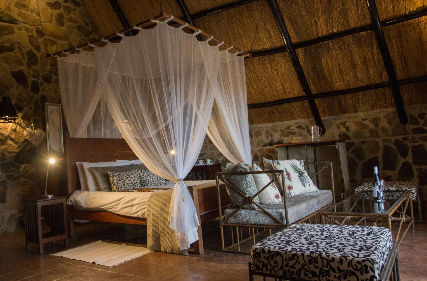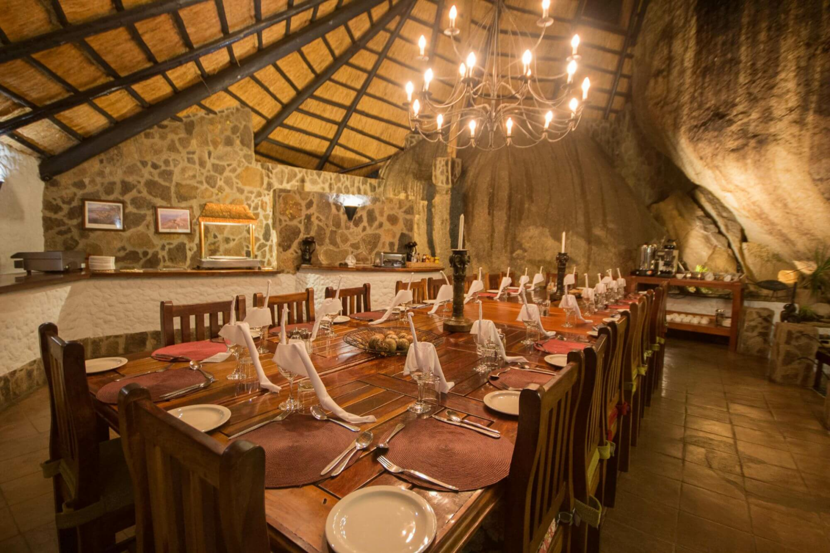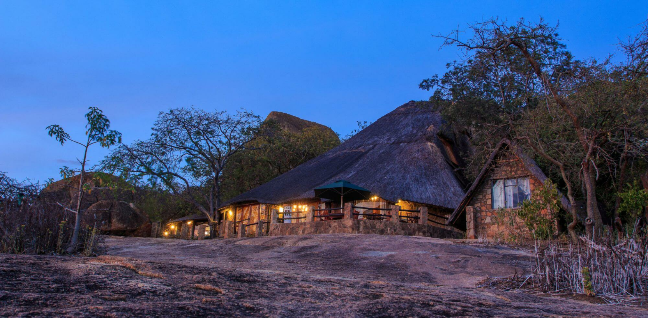 Das Big Cave Camp ist wunderschön an einen der felsigen Hügel direkt an der Grenze des Matobo-Nationalparks gebaut. Herzstück des Camps sind die strohgedeckten gemeinsamen Wohnbereiche, die sich nahtlos in die sie umgebenden Granitfelsen einfügen und welche eine urige, rustikale Stimmung ausstrahlen. Mittag- und Abendessen werden gemeinsam an einem großen Tisch serviert. Es gibt auch eine spektakulär gelegene Sundowner-Terrasse, der Lightning Rock, wovon man den Sonnenuntergang bewundern kann.