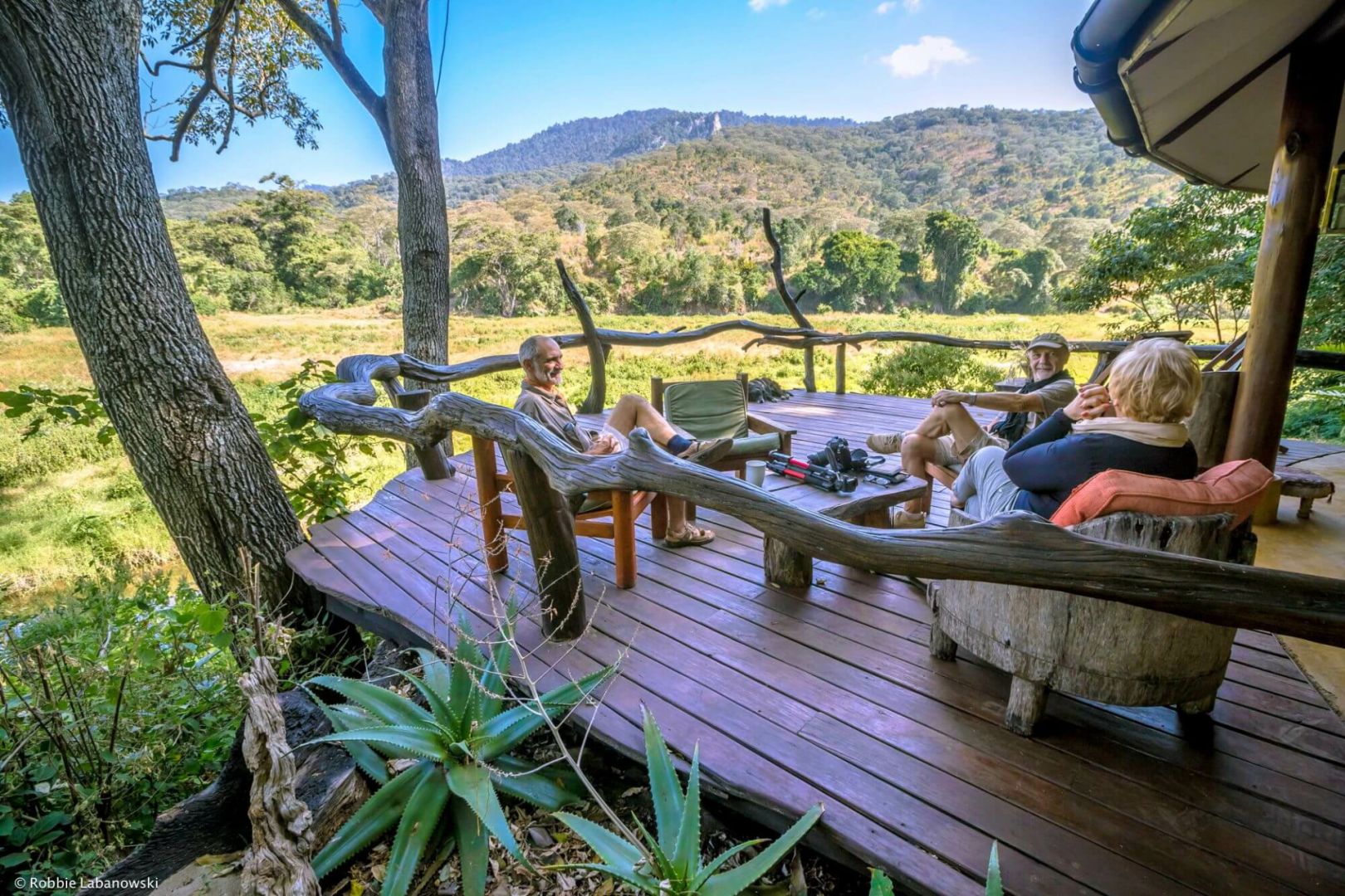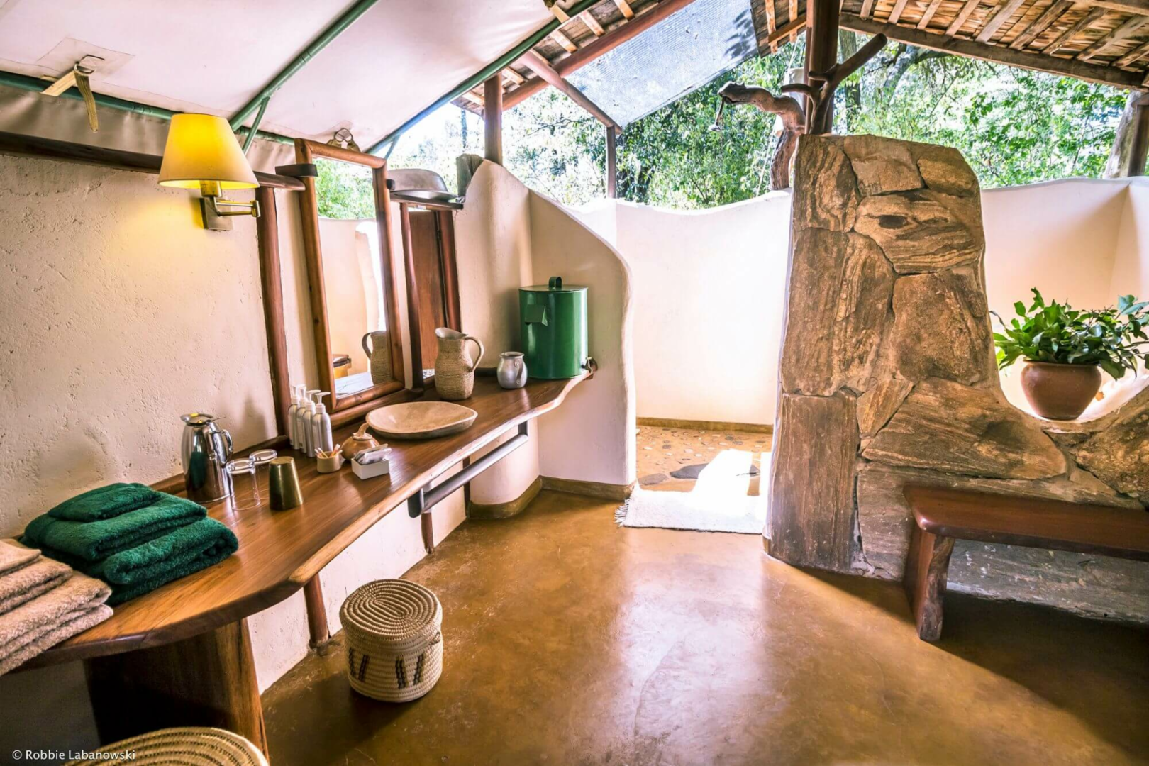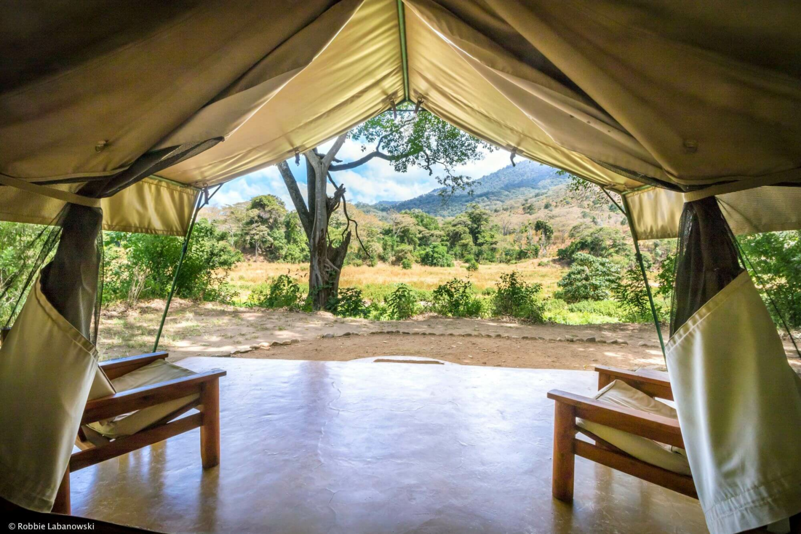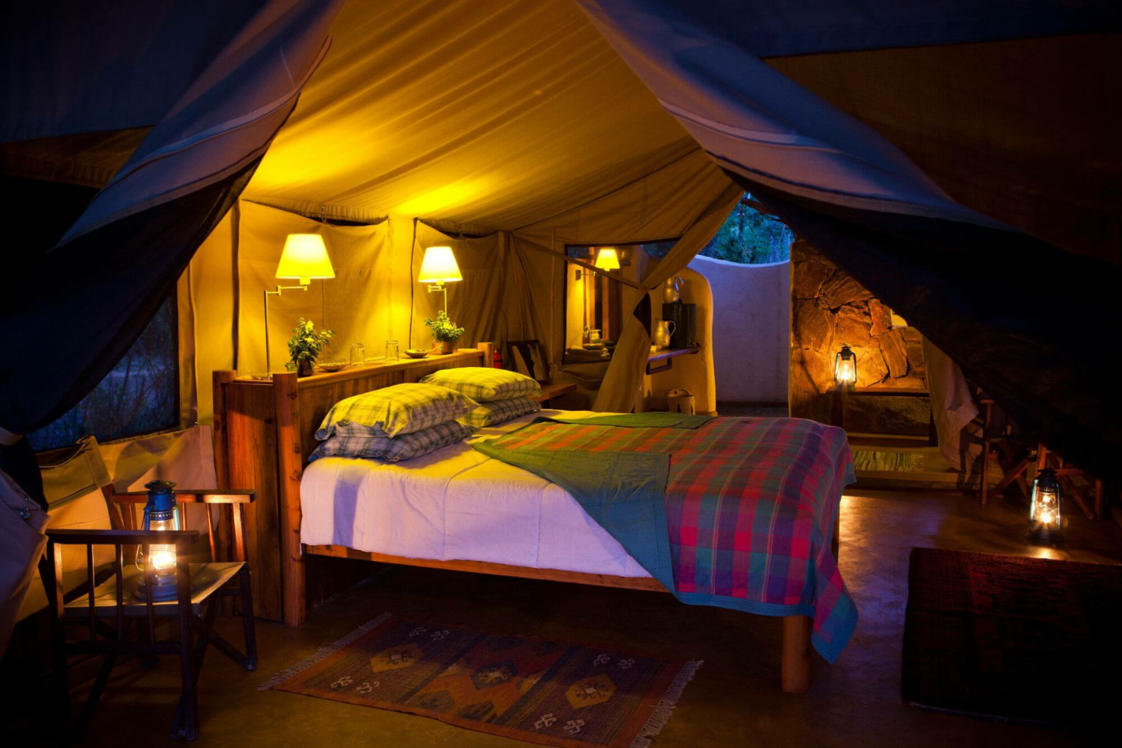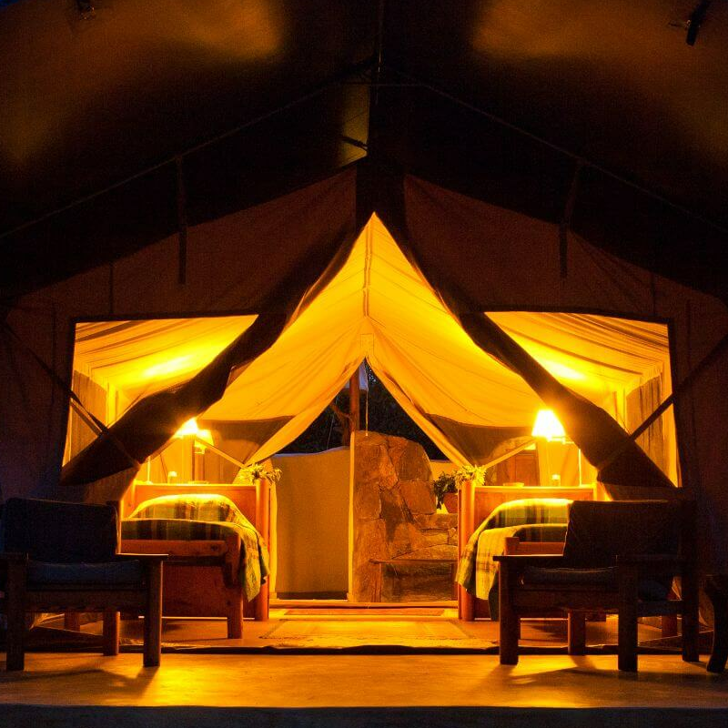 Die Gäste werden in sechs simplen Safarizelten untergebracht, die auf einem flachen Betonboden errichtet wurden und so mitten in der Natur liegen. Vor dem Zelt befindet sich ein paar Regiestühle. Im Inneren sind die Zelte nicht luxuriös, aber dennoch sehr angenehm gestaltet, mit einem großen Bett, schönen Leselampen, die ein angenehmes gelbliches Licht ausstrahlen, einem bunten Teppich und einem sehr schönen Badezimmer mit Outdoor-Dusche.