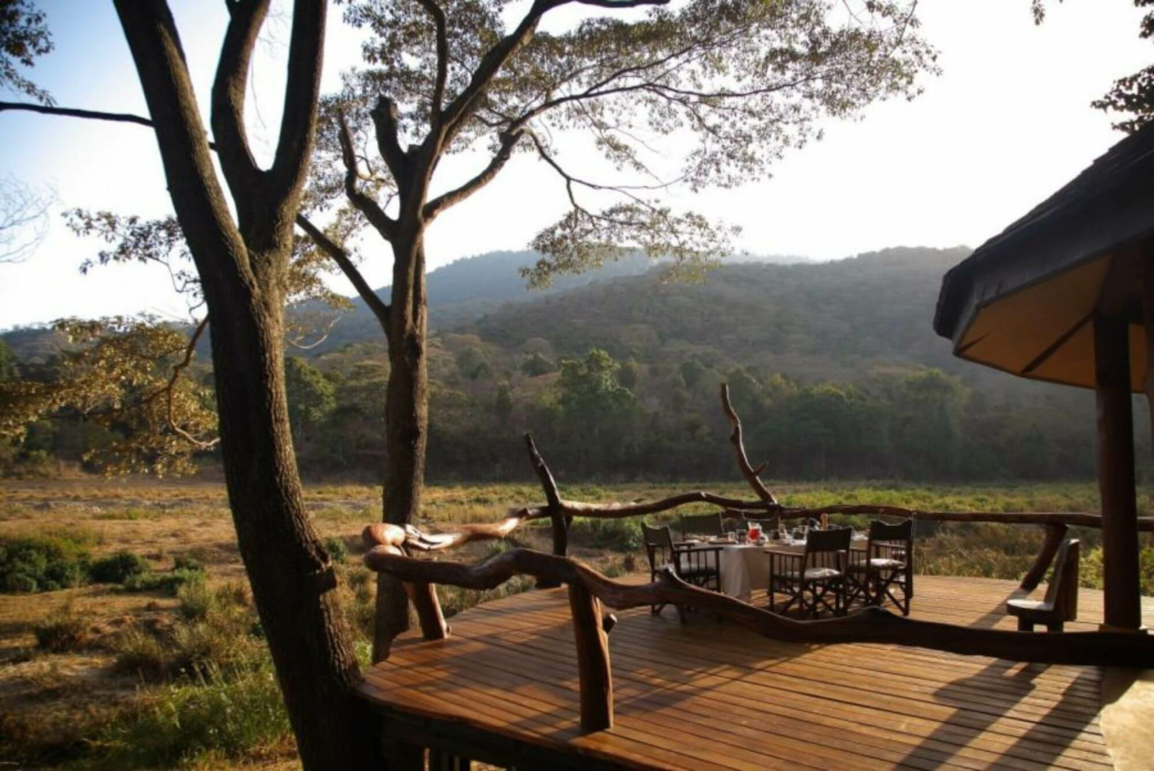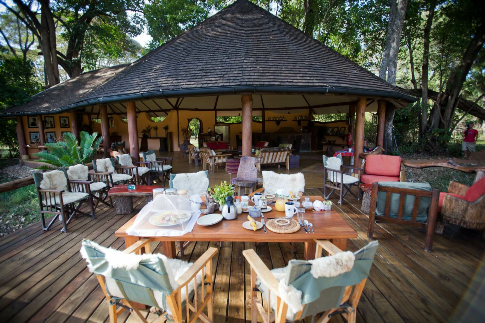 Das Camp an sich ist klein und besticht insbesondere durch die extrem atmosphärische und wirklich romantische Lage mitten im Regenwald oberhalb eines kleinen Baches. Eine kleine runde Hauptboma beherbergt die gemütlichen öffentlichen Bereiche. Auf der linken Seite vom Eingang befindet sich ein kleiner Loungebereich, mit Massivholzmöbeln und einem Regal mit Büchern ausgestattet, die gut zum rustikalen Ambiente passen. Auf der rechten Seite findet man den Esstisch für die gemeinsamen Mahlzeiten und einige Regiestühle. Auf der ockerfarbigen Lehmwand hängen einige eindrucksvolle Porträts von stolzen Samburu-Kriegern. Das schönste ist das Deck mit Blick auf den Bach unten und das gegenüberliegende offene Grasland. Es ist ein wunderbarer Spot für die Vogelbeobachtung. Abends kommen Elefanten regelmäßig am gegenüberliegenden Ufer an, um zu trinken und rasten, in der Erde zu buddeln und zu toben. Hier wird abends auch Feuer gemacht und Drinks für die Gäste gereicht.