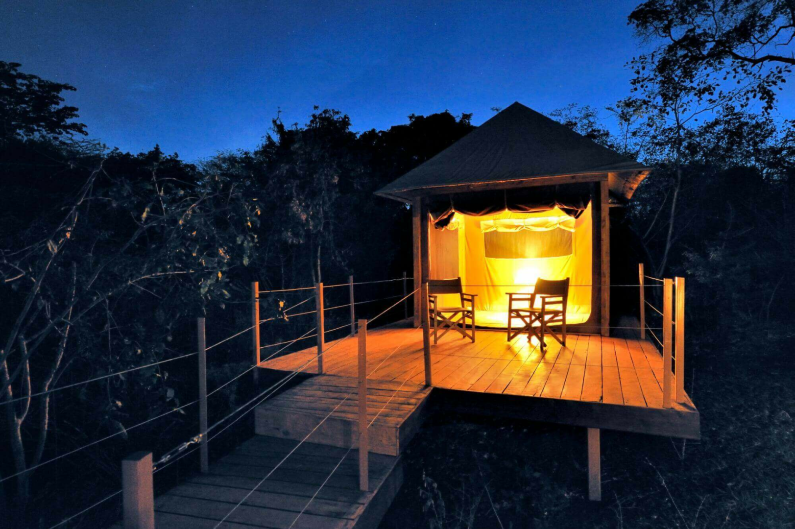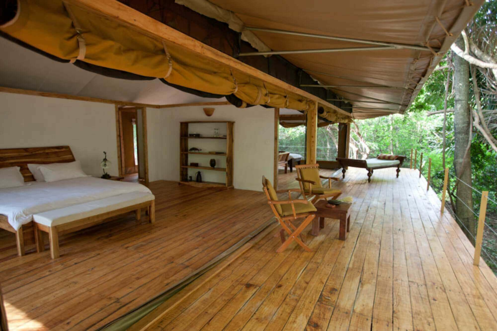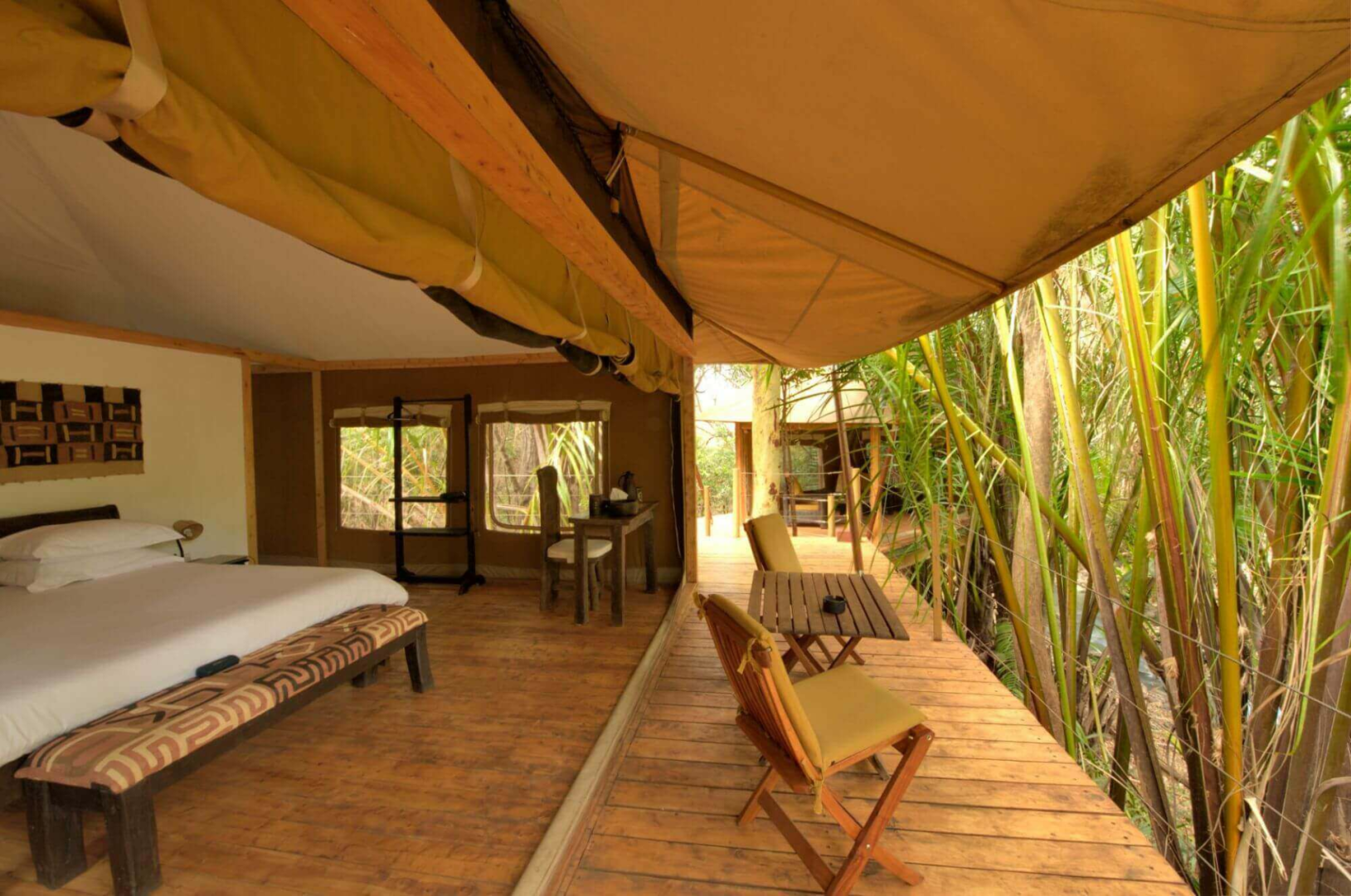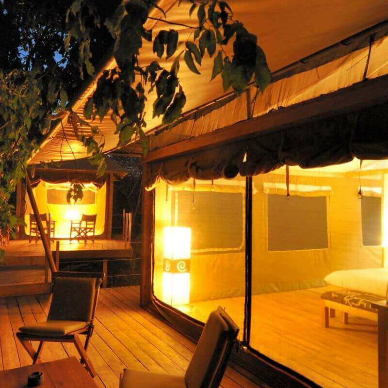 Die Gäste werden in acht Luxuszelten auf Plattformen untergebracht, die mitten in der buschigen Vegetation sehr diskret und mit großer Entfernung voneinander verteilt liegen. Jedes Zelt hat eine kleine Veranda. Im Inneren sind die Zelte überraschend nüchtern und fast minimalistisch. Ein großes Bett nimmt den mittigen Platz ein, Nachttische und ein Schreibtisch mit Stuhl sind vorhanden, aber keine Vorhänge und keine Teppiche auf dem Holzboden.