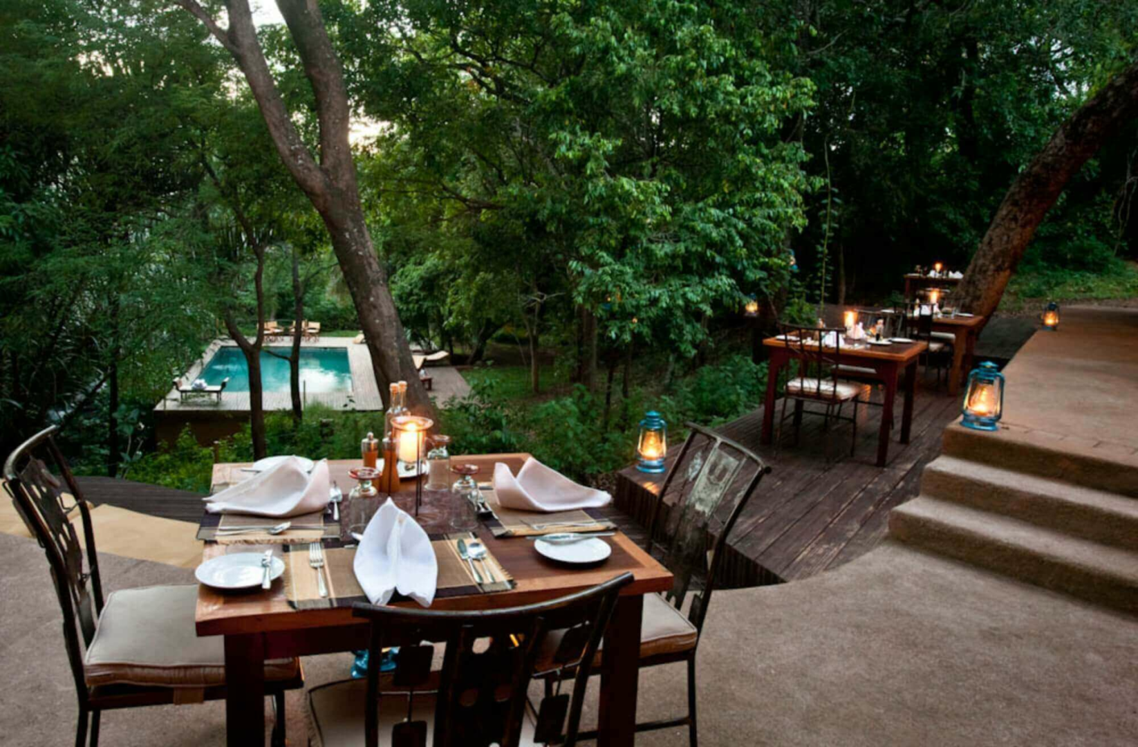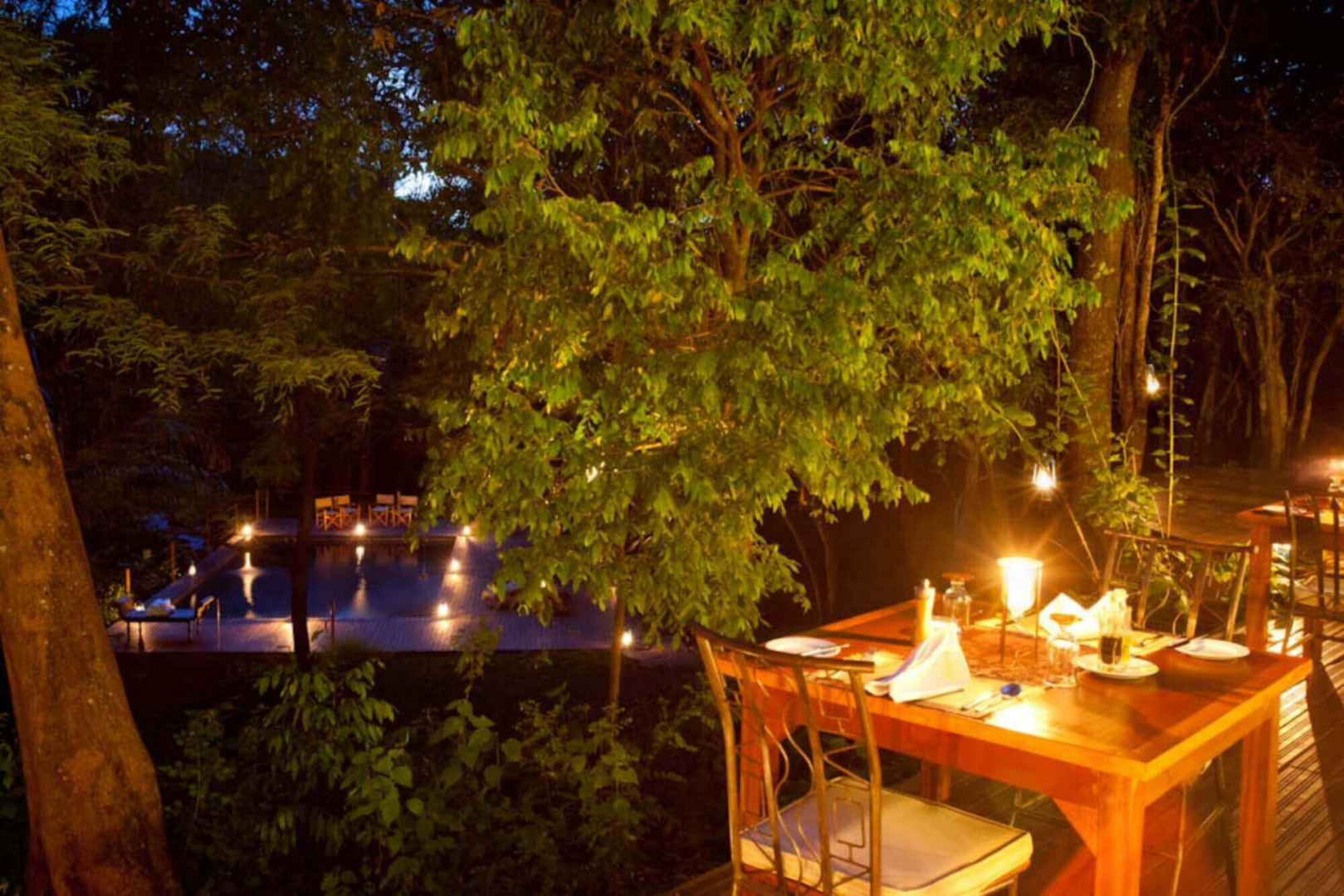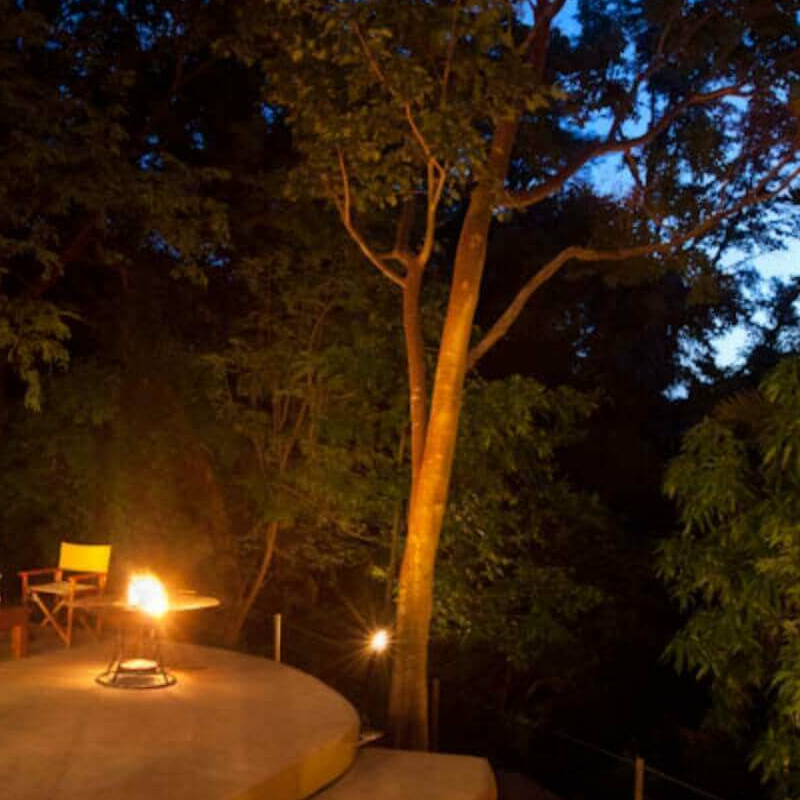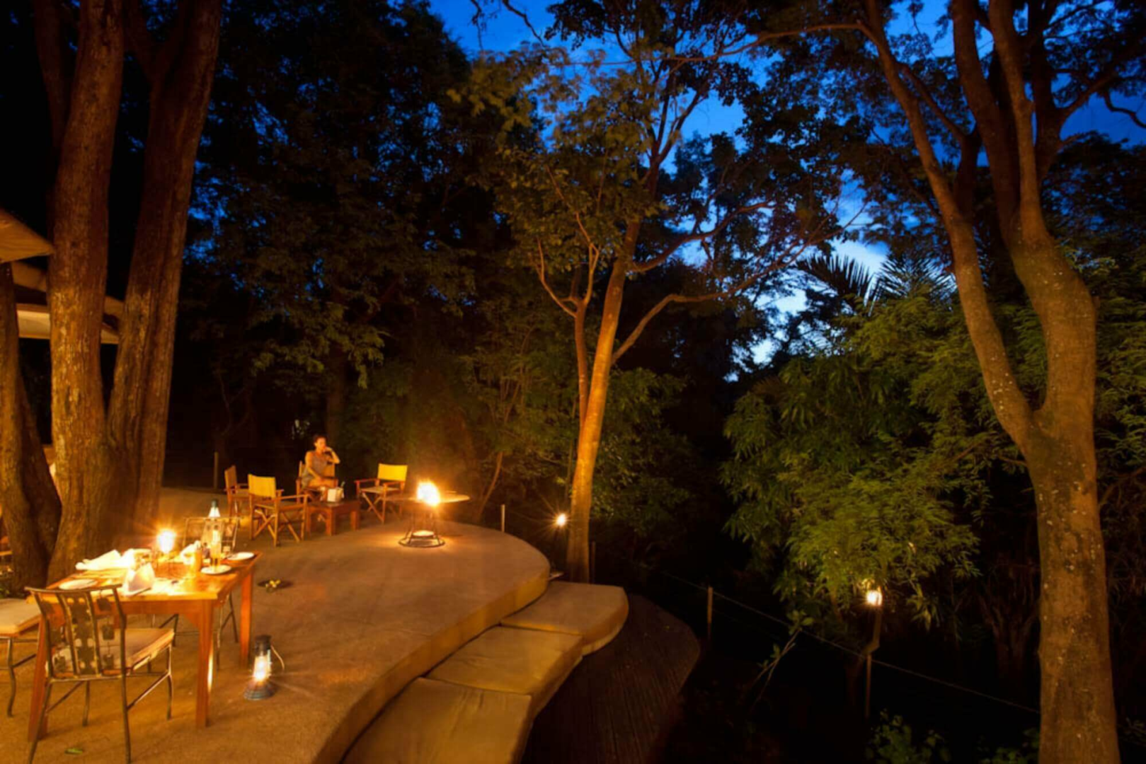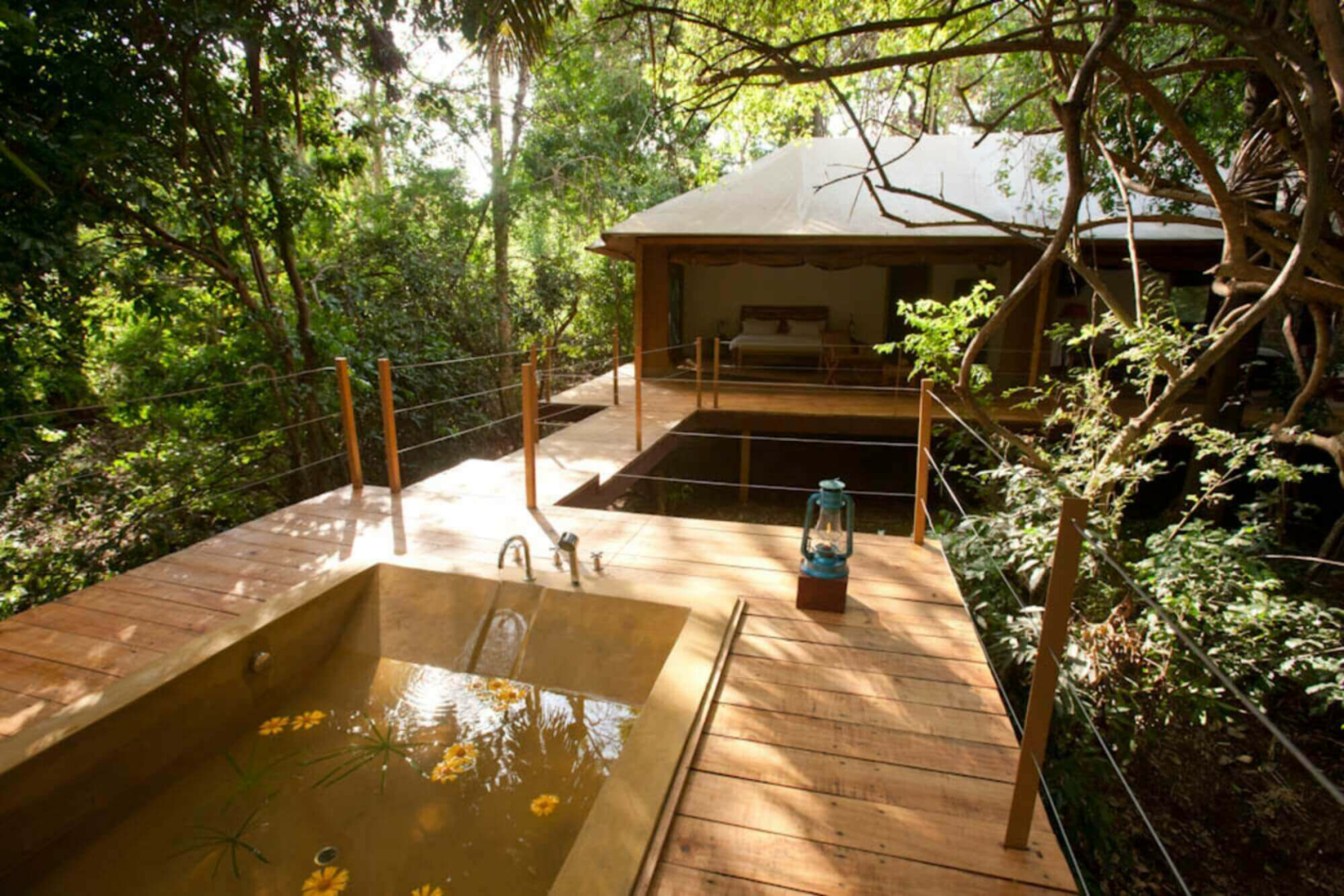 Die Gäste werden in acht Luxuszelten auf Plattformen untergebracht, die mitten in der buschigen Vegetation sehr diskret und mit großer Entfernung voneinander verteilt liegen. Jedes Zelt hat eine kleine Veranda. Im Inneren sind die Zelte überraschend nüchtern und fast minimalistisch. Ein großes Bett nimmt den mittigen Platz ein, Nachttische und ein Schreibtisch mit Stuhl sind vorhanden, aber keine Vorhänge und keine Teppiche auf dem Holzboden.